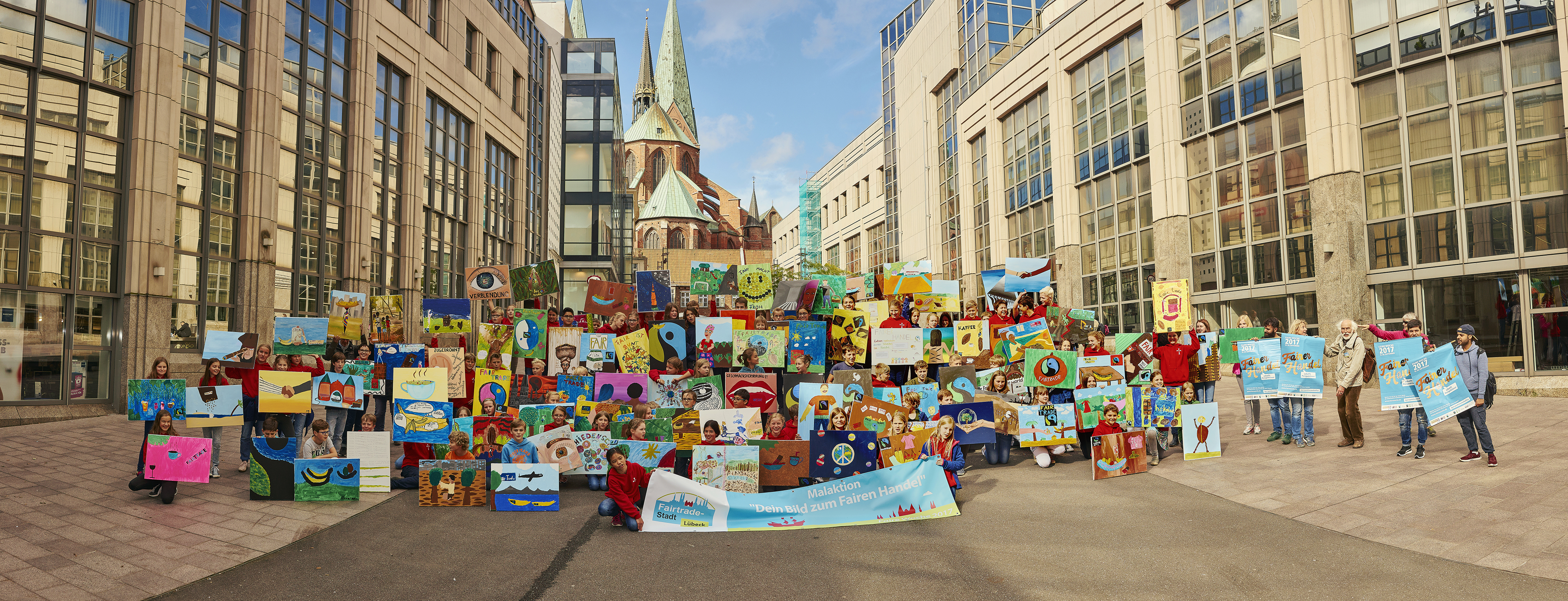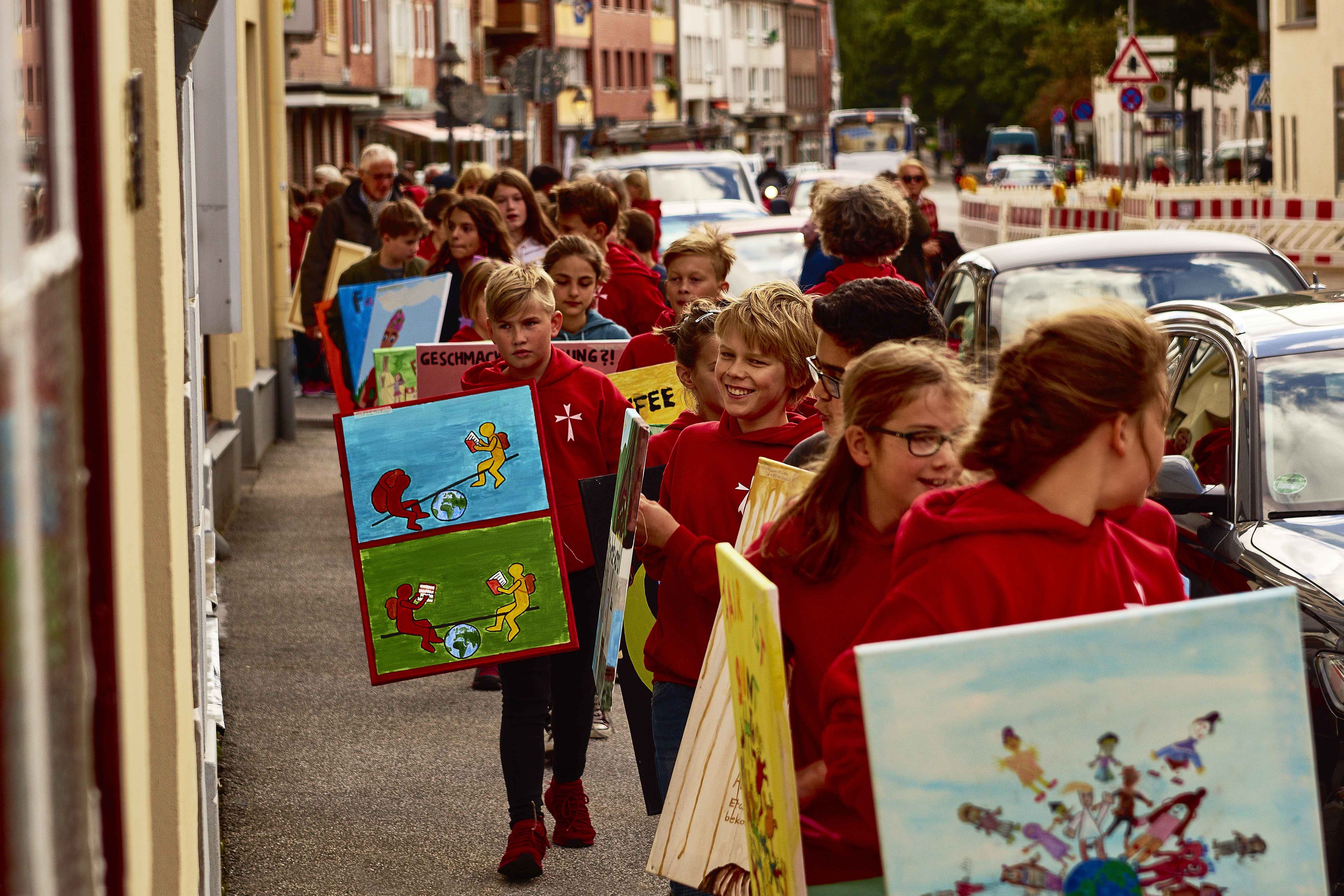 Sind auch alle da? Ja! Endlich setzte sich am Freitag, den 15. September, der lange Zug aller sechsten Klassen unserer Schule in Bewegung. In der Wahmstraße erwarteten uns über hundert Bilder zum Thema Fair-Trade, die andere Kinder von verschiedenen Schulen in den Ferien gemalt hatten. Nun liefen wir mit den Leinwänden in den Händen zum Schrangen, um um uns dort aufzustellen. Mit unseren knallroten Johanneumspullis, den vielen bunten Bildern und dem Ruf „Für Fair-Trade“, den wir immer wieder anstimmten, wirkten wir so eindrucksvoll, dass viele Passanten Fotos machten.