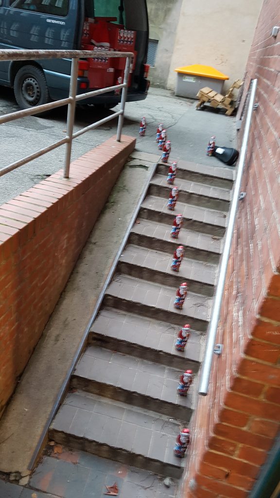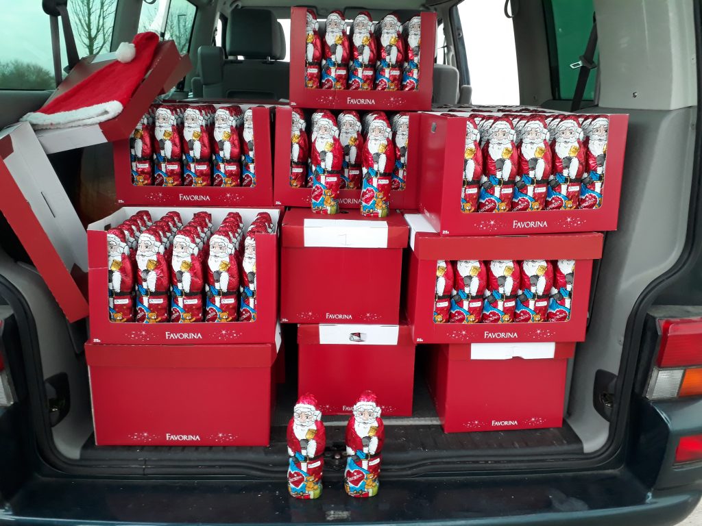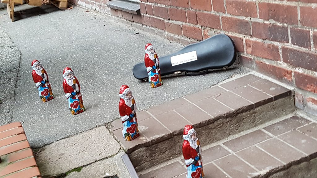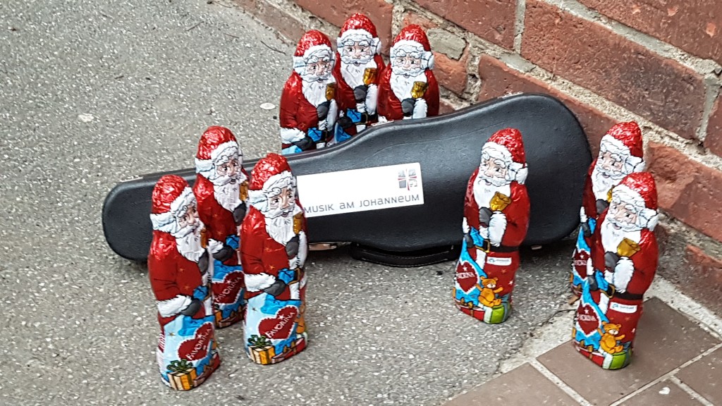 Na klar gibt es den Weihnachtsmann! Und viele, viele Abbilder von ihm – auch in fair gehandelter Schokolade. Jede Menge dieser Kumpel haben sich auf den Weg ins Johanneum gemacht. Von der SV persönlich begleitet haben sie ihren Weg in die Klassenräume gefunden. Phillip Gutberlet hat ihre Ankunft beobachtet: