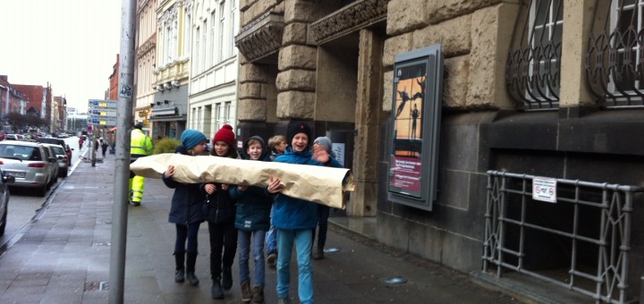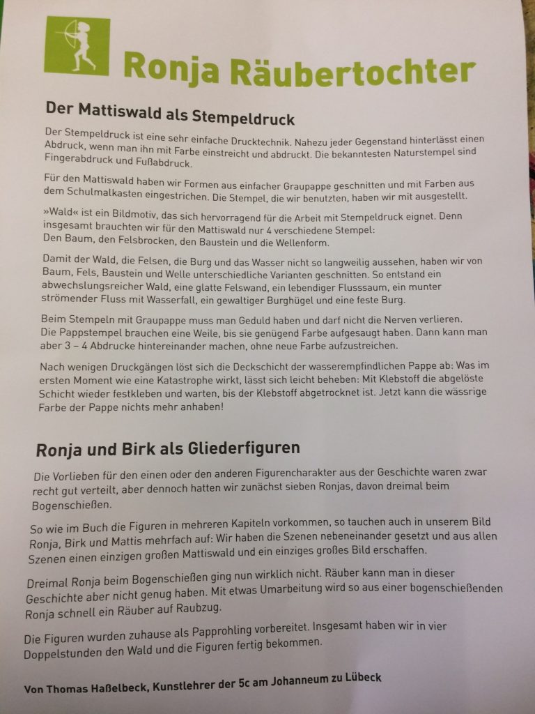 Sechs Wochen lang hing das Kunstwerk unserer 5c, auf dem wir unsere Vorstellungen von „Ronja Räubertochter“ dargestellt haben, im Lübecker Theater in der Beckergrube aus. Viele Gäste des Weihnachtsmärchens konnten es sich ansehen. Nun haben wir es zurück ins Johanneum getragen, damit wir es im Sextanerflur aufhängen können.