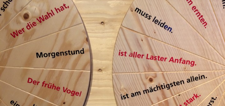 Die Ausstellung war das Gegenteil von 08/15! Bei einigen Sprichwörtern haben wir uns gefühlt, als hätten wir ein Brett vor dem Kopf, aber die Erklärungen haben uns Eselsbrücken gebaut. Ohne Fleiß kein Preis! Einige wollten aber lieber Fisimatenten machen…