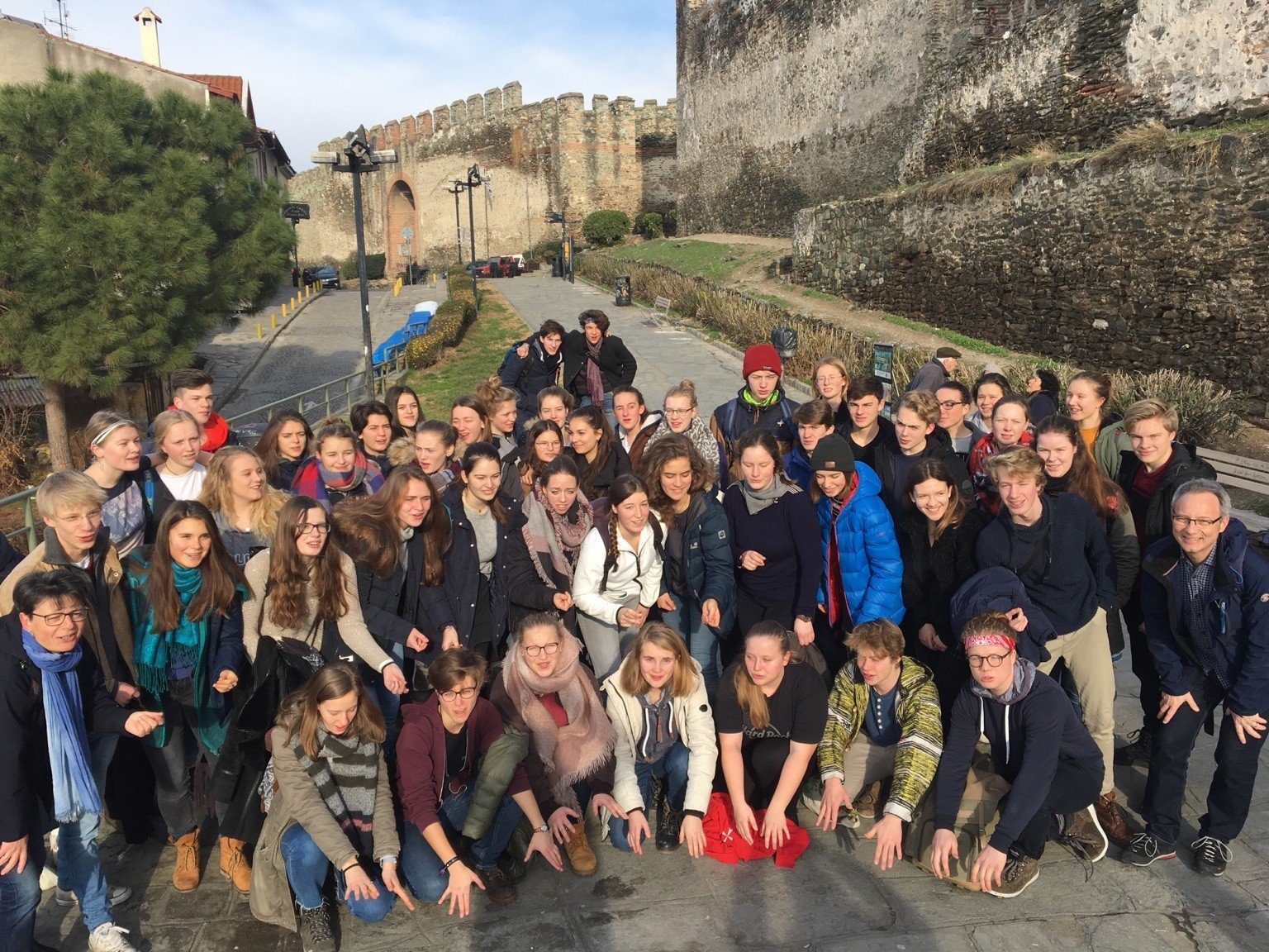 Eine Woche lang ist unser Chor zu Gast bei der Deutschen Schule Thessaloniki und wird drei Konzerte geben: An der Deutschen Schule wird der Holocaust-Gedenktag sehr ernst genommen und alle Klassen arbeiten am 29. Januar nur zu diesem Thema (aus Thessaloniki, dem „Jerusalem des Balkans“, wurden Tausende von Juden deportiert und in Auschwitz ermordet). Für die Schulgemeinschaft dort wird Jan Benders „Ein Brief von Anne Frank“ aufgeführt. Auch der Wettbewerb „Jugend musiziert“ wird in Thessaloniki ausgetragen, der Oberstufenchor wird beim Preisträgerkonzert singen. Und schließlich wird es ein gemeinsames Konzert mit einem Kinderchor im Archäologischen Museum geben.