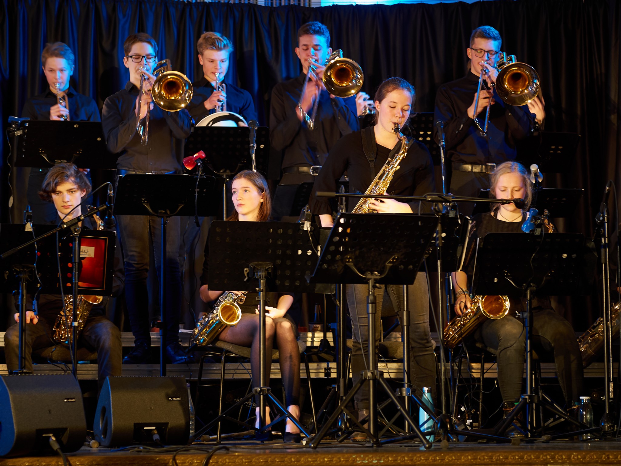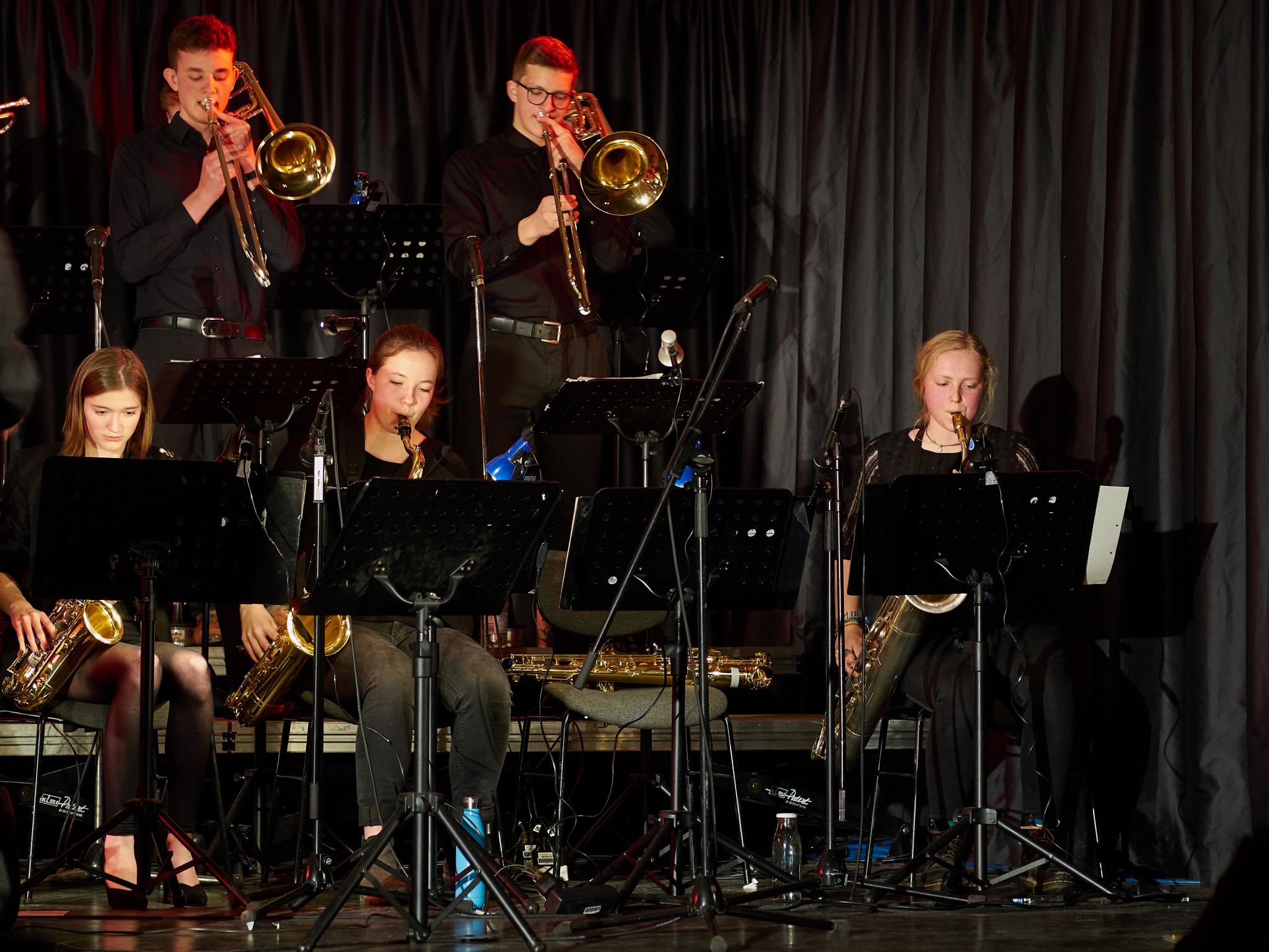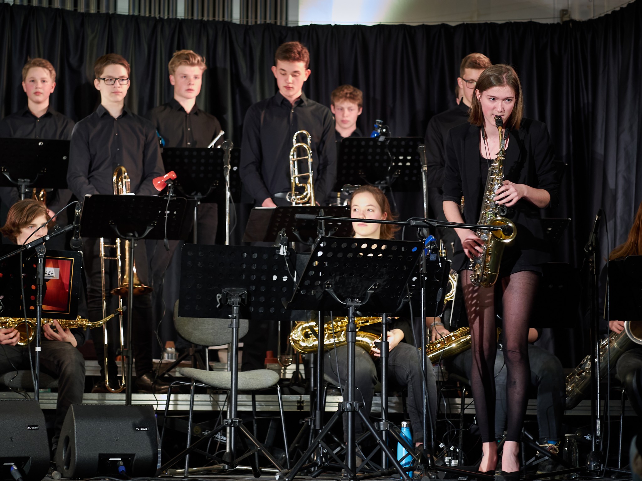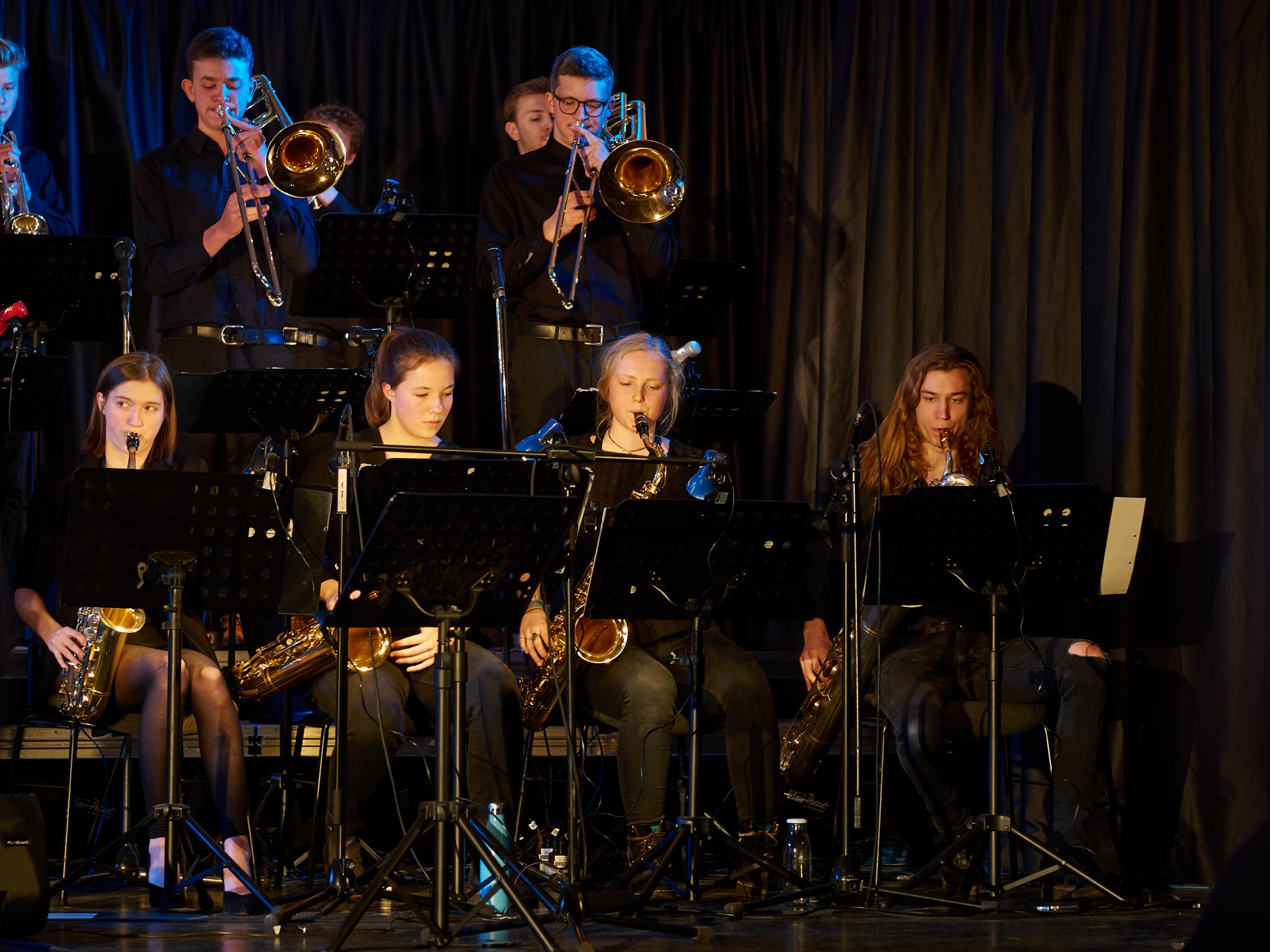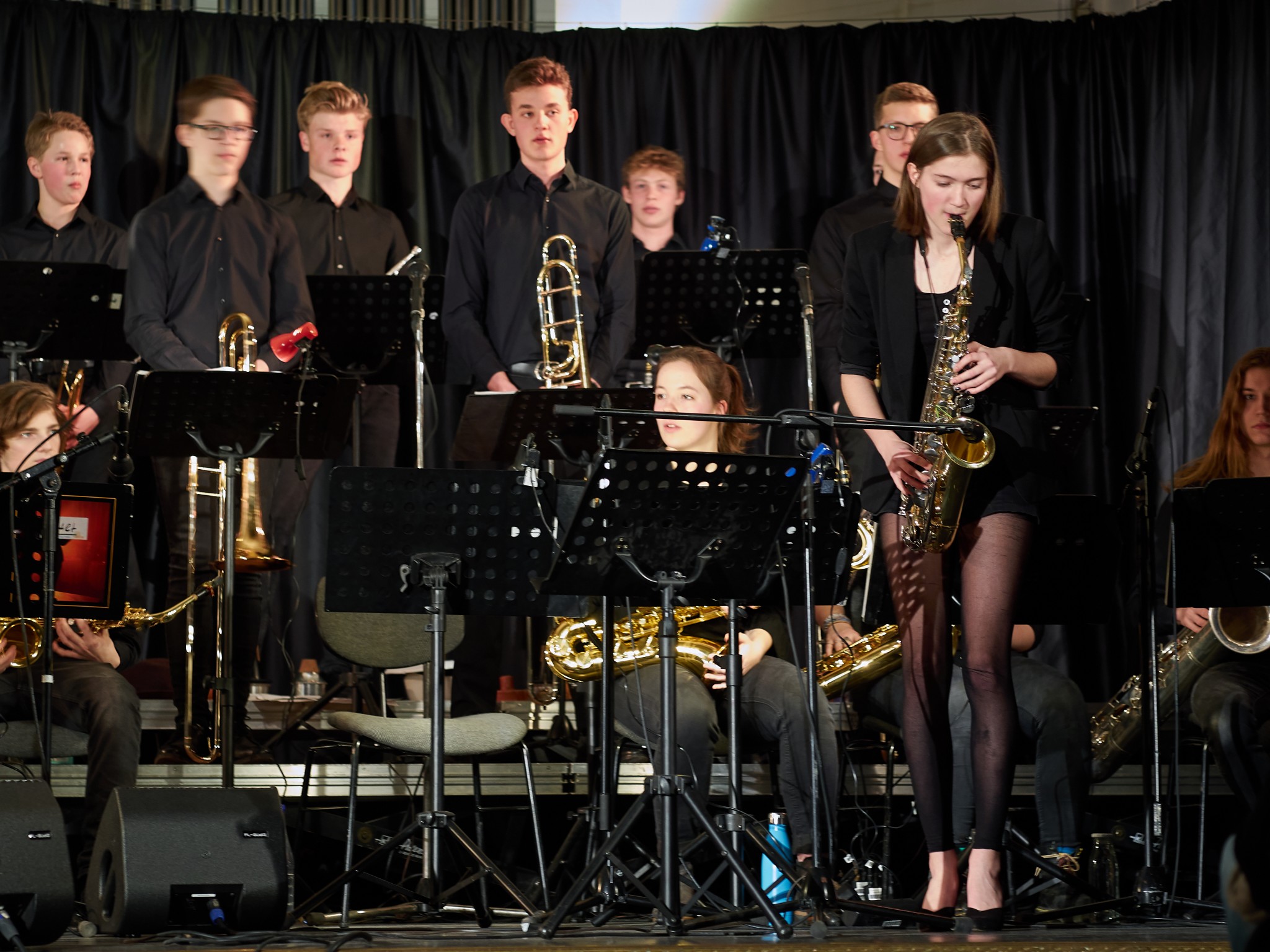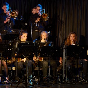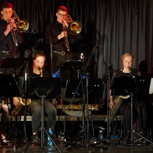 Neben den Soli der Trompeten, Saxophone und Posaunen besaß auch ein Großteil der Rhythmusgruppe die Ehre, ein Solo zu spielen. Generell kennt man eine Bigband mit der unterstützenden Rhythmusgruppe und den Solo-Einlagen der Bläser. Doch unsere Bigband ist eben besonders, denn zu den „klassischen“ Soli der Bläser kamen auch regelmäßig atemberaubende Einsätze der Rhythmusgruppe. So zeigten z.B. auch die Schlagzeuger und der Pianist ihr Talent. Einige begeisterten das Publikum so sehr, dass sie zum Gesprächsthema in der Pause wurden. Darunter der Pianist Jonte Schröder, wohlgemerkt ein Achtklässler !!, der bewies, auf dem Niveau der ganz Großen mitspielen zu können. Seine mehrfachen Soli führten zu Begeisterungsstürmen. Er hat eindrucksvoll bewiesen, dass man für Jazz nie zu jung ist. Aber auch die „alten Hasen“ spielten mal wieder einzigartig. Die gesamte Band wirkte im Einklang, sodass eine gewisse Musikbegeisterung bei jedem ausgelöst wurde. Überall sah man Fußspitzen im Takt wippen oder Hände zum Takt auf den Oberschenkel klatschen. Eine Atmosphäre, die sehr selten in der Aula vorkommt, besonders wenn man bedenkt, dass dort sonst Klausuren geschrieben werden.