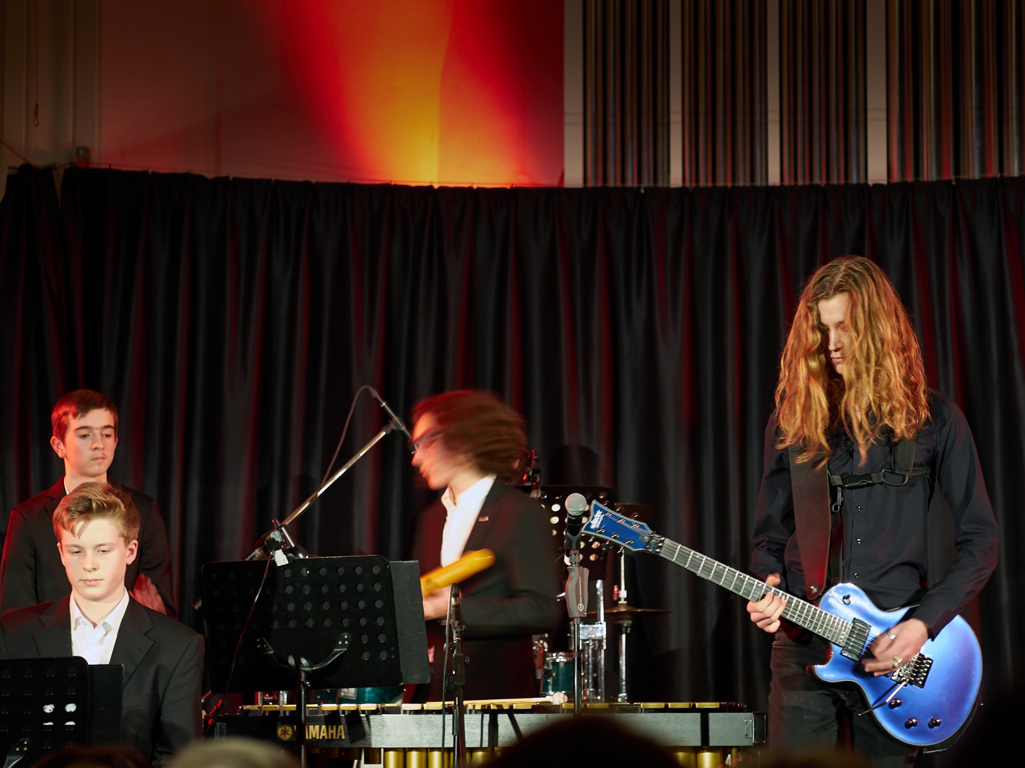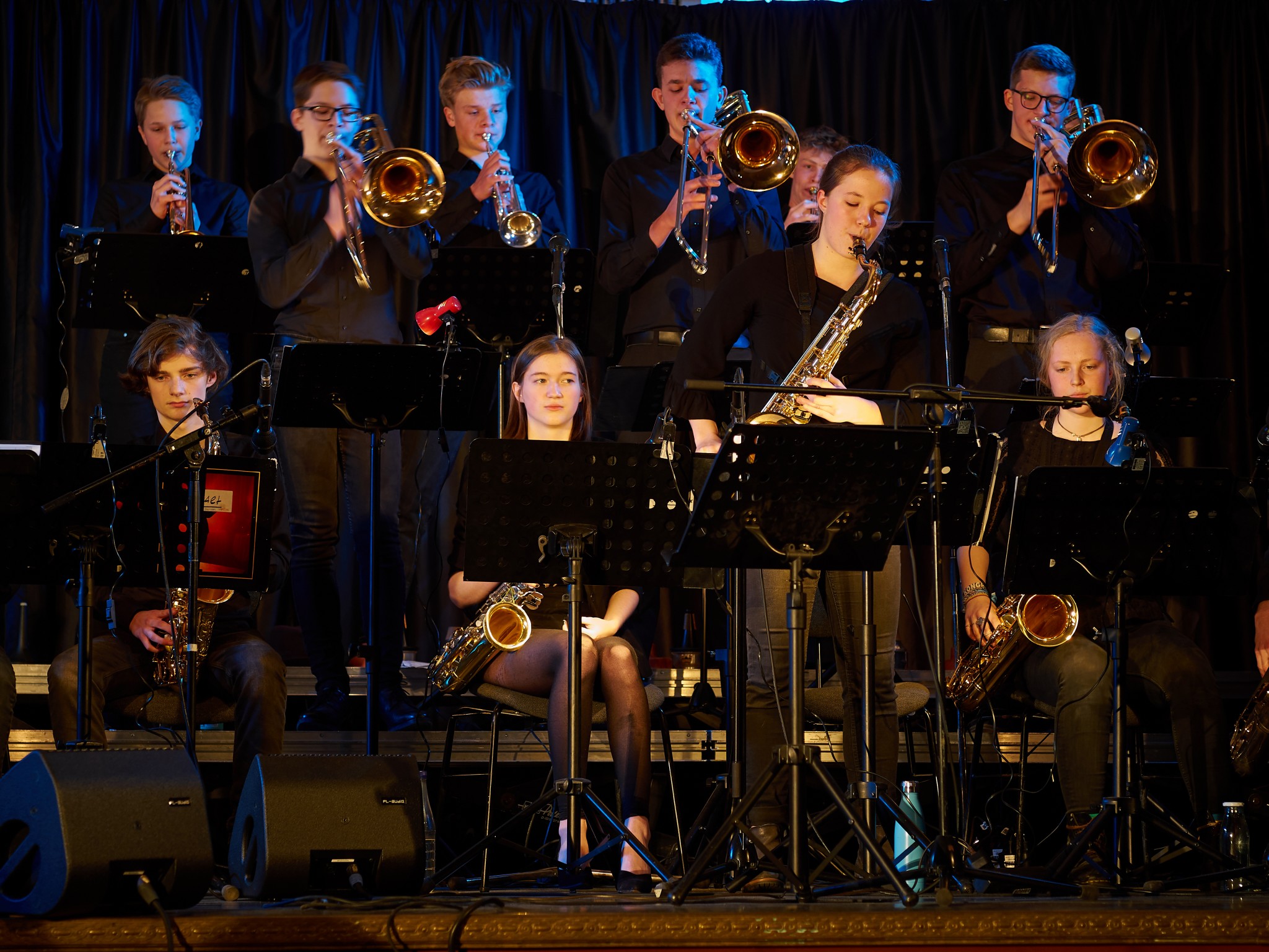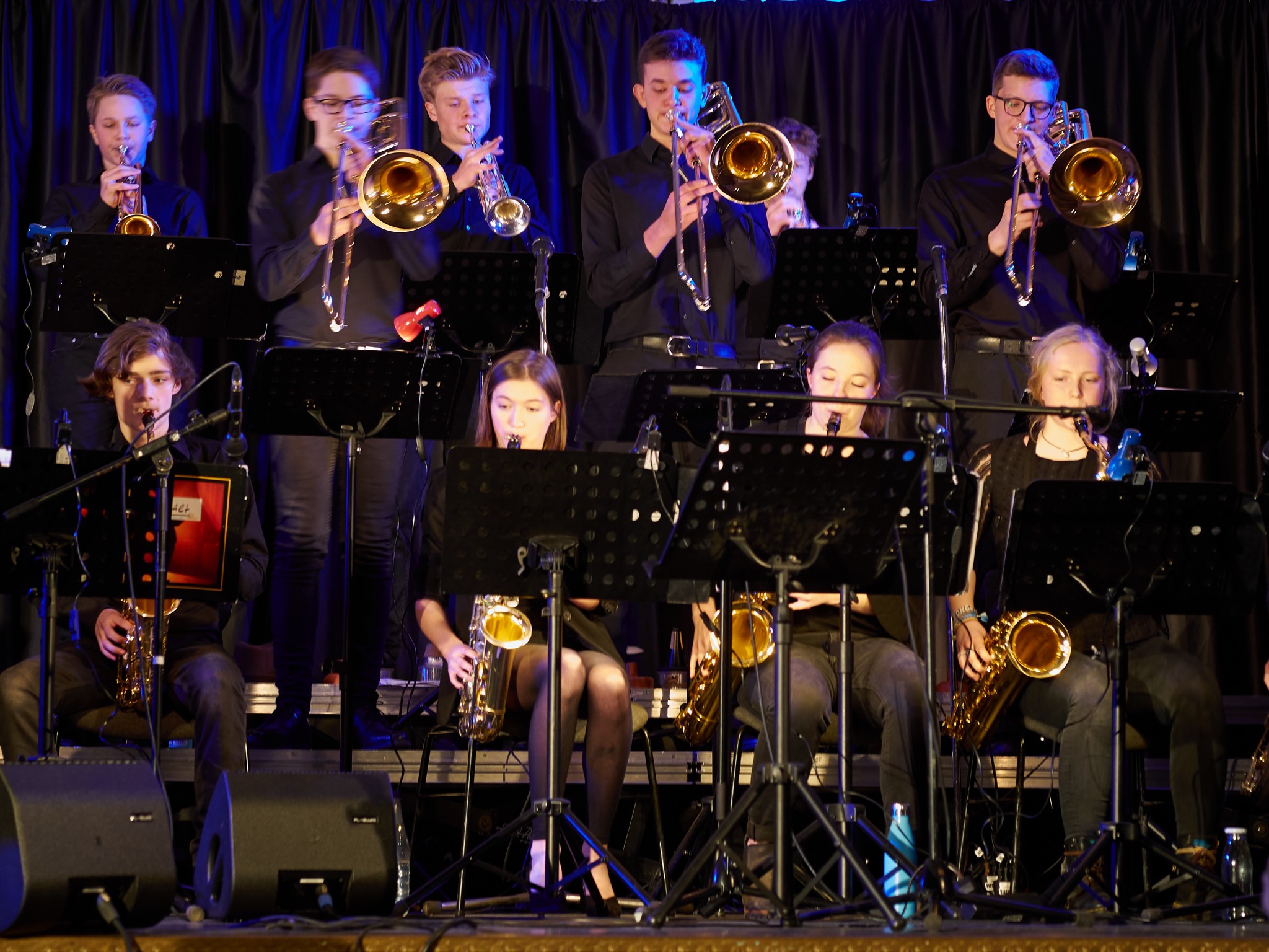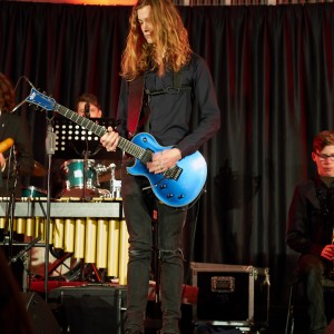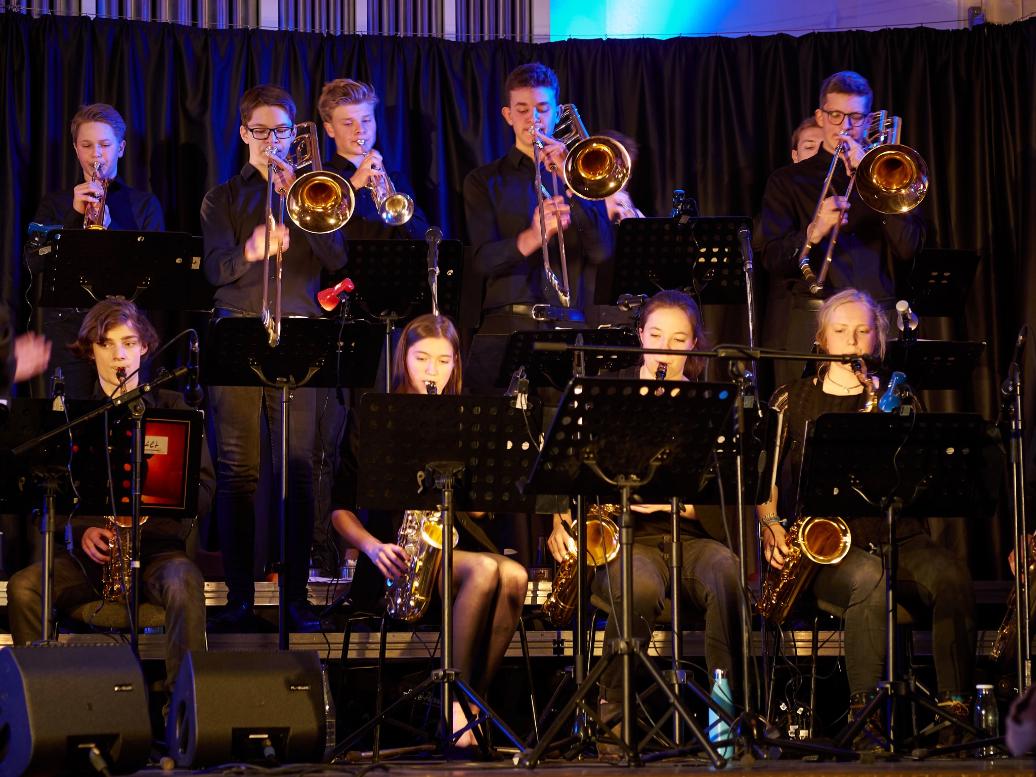 Neben den Soli der Trompeten, Saxophone und Posaunen besaß auch ein Großteil der Rhythmusgruppe die Ehre, ein Solo zu spielen. Generell kennt man eine Bigband mit der unterstützenden Rhythmusgruppe und den Solo-Einlagen der Bläser. Doch unsere Bigband ist eben besonders, denn zu den „klassischen“ Soli der Bläser kamen auch regelmäßig atemberaubende Einsätze der Rhythmusgruppe. So zeigten z.B. auch die Schlagzeuger und der Pianist ihr Talent. Einige begeisterten das Publikum so sehr, dass sie zum Gesprächsthema in der Pause wurden. Darunter der Pianist Jonte Schröder, wohlgemerkt ein Achtklässler !!, der bewies, auf dem Niveau der ganz Großen mitspielen zu können. Seine mehrfachen Soli führten zu Begeisterungsstürmen. Er hat eindrucksvoll bewiesen, dass man für Jazz nie zu jung ist. Aber auch die „alten Hasen“ spielten mal wieder einzigartig. Die gesamte Band wirkte im Einklang, sodass eine gewisse Musikbegeisterung bei jedem ausgelöst wurde. Überall sah man Fußspitzen im Takt wippen oder Hände zum Takt auf den Oberschenkel klatschen. Eine Atmosphäre, die sehr selten in der Aula vorkommt, besonders wenn man bedenkt, dass dort sonst Klausuren geschrieben werden.