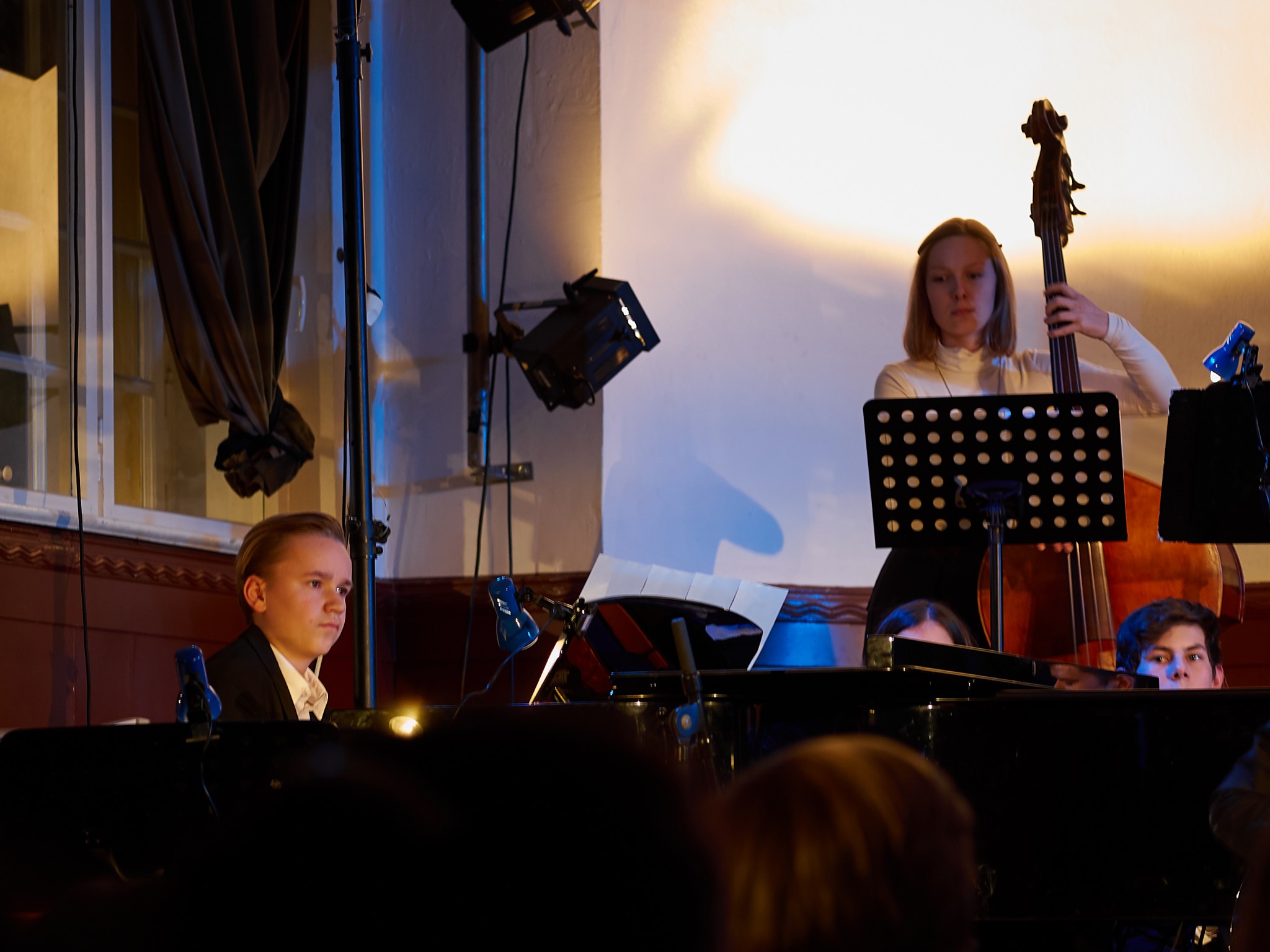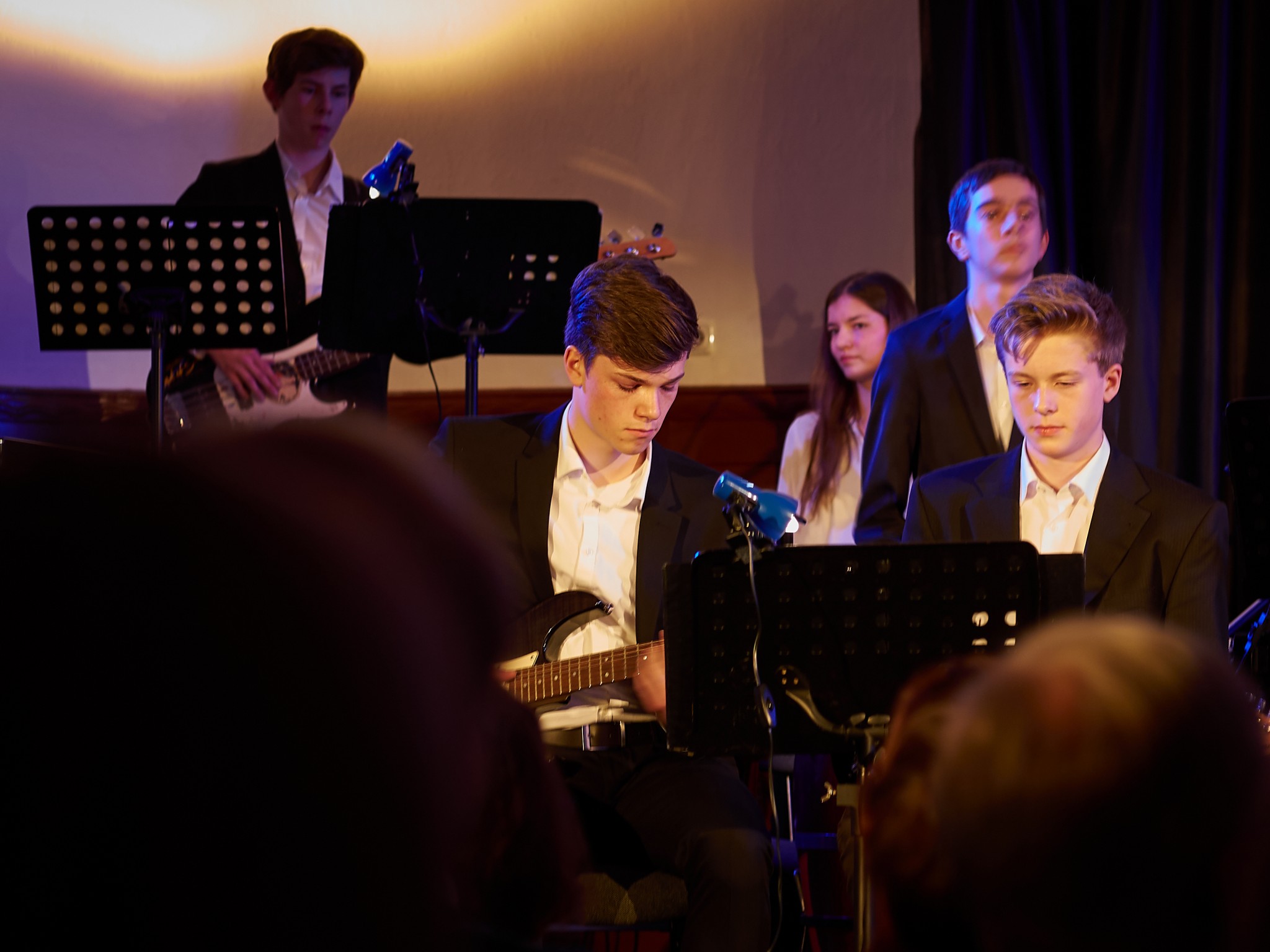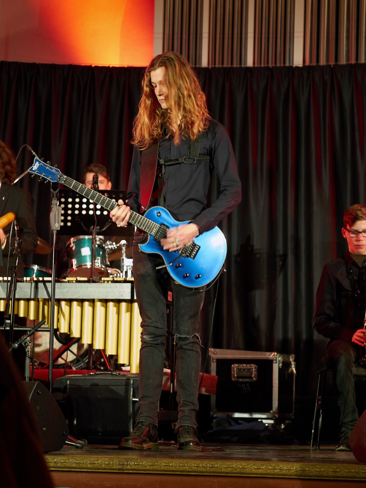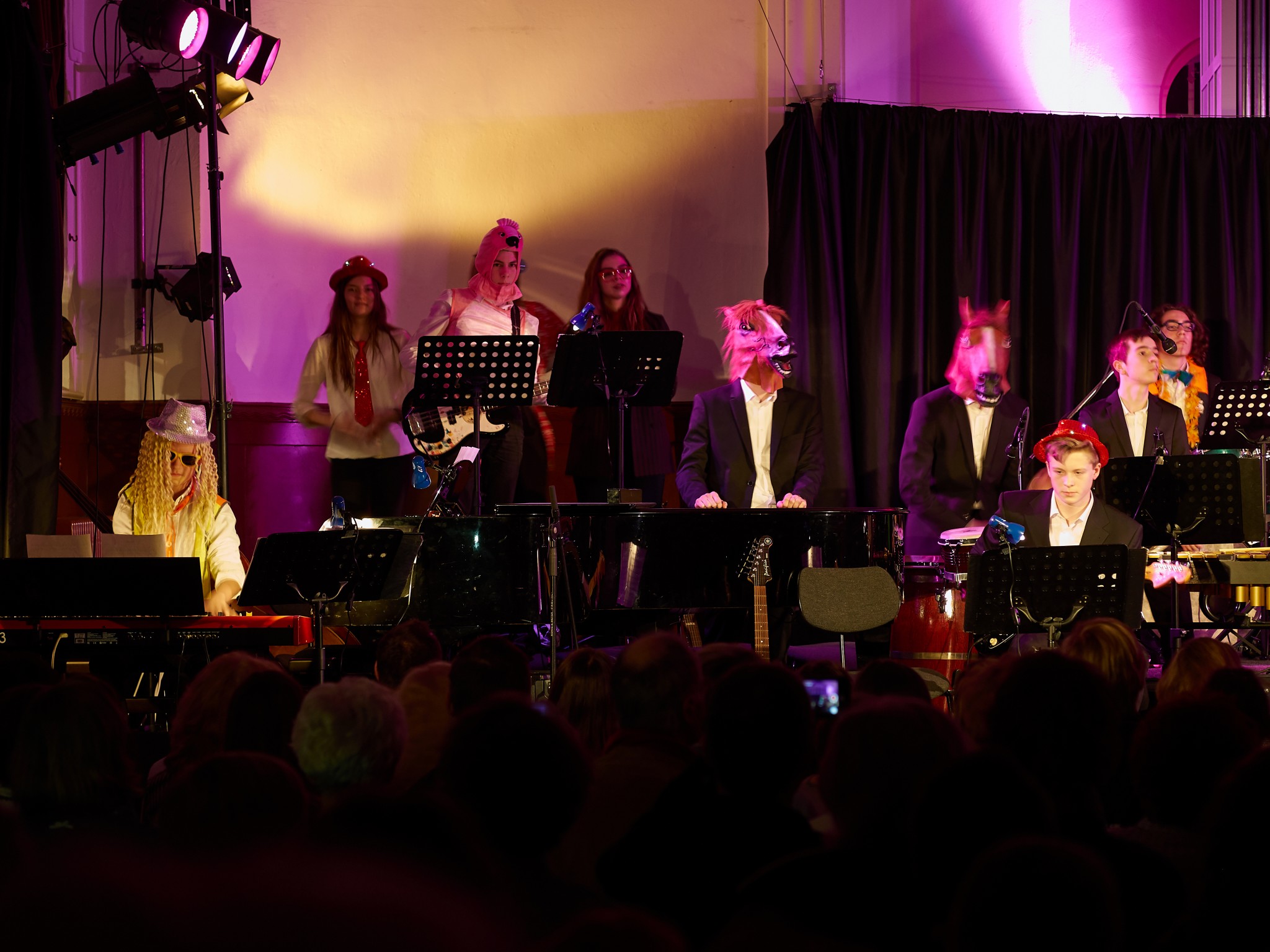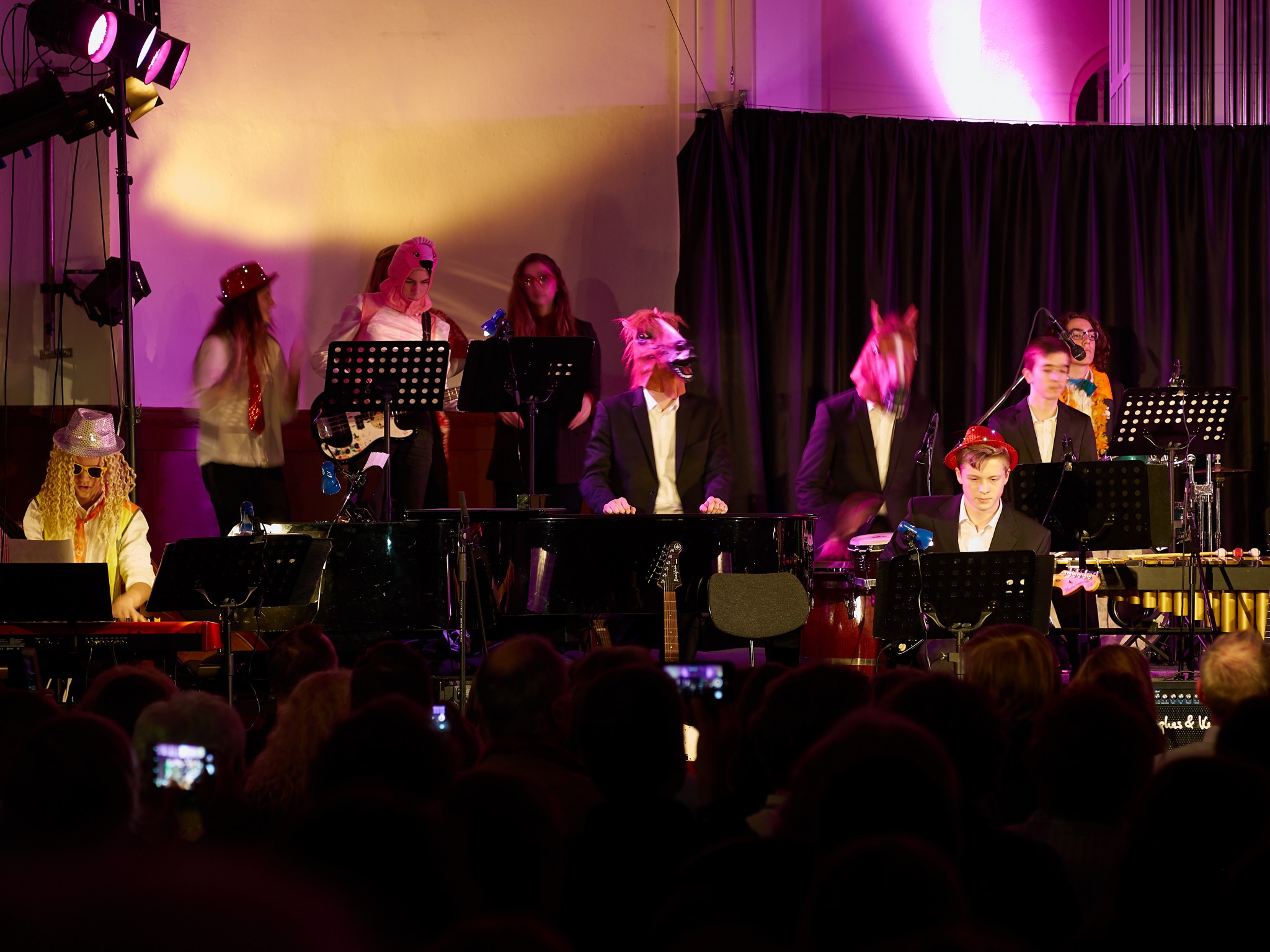 Neben den Soli der Trompeten, Saxophone und Posaunen besaß auch ein Großteil der Rhythmusgruppe die Ehre, ein Solo zu spielen. Generell kennt man eine Bigband mit der unterstützenden Rhythmusgruppe und den Solo-Einlagen der Bläser. Doch unsere Bigband ist eben besonders, denn zu den „klassischen“ Soli der Bläser kamen auch regelmäßig atemberaubende Einsätze der Rhythmusgruppe. So zeigten z.B. auch die Schlagzeuger und der Pianist ihr Talent. Einige begeisterten das Publikum so sehr, dass sie zum Gesprächsthema in der Pause wurden. Darunter der Pianist Jonte Schröder, wohlgemerkt ein Achtklässler !!, der bewies, auf dem Niveau der ganz Großen mitspielen zu können. Seine mehrfachen Soli führten zu Begeisterungsstürmen. Er hat eindrucksvoll bewiesen, dass man für Jazz nie zu jung ist. Aber auch die „alten Hasen“ spielten mal wieder einzigartig. Die gesamte Band wirkte im Einklang, sodass eine gewisse Musikbegeisterung bei jedem ausgelöst wurde. Überall sah man Fußspitzen im Takt wippen oder Hände zum Takt auf den Oberschenkel klatschen. Eine Atmosphäre, die sehr selten in der Aula vorkommt, besonders wenn man bedenkt, dass dort sonst Klausuren geschrieben werden.