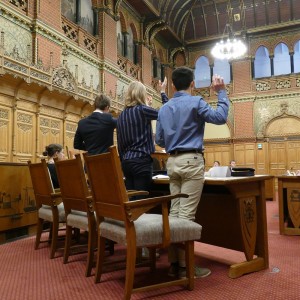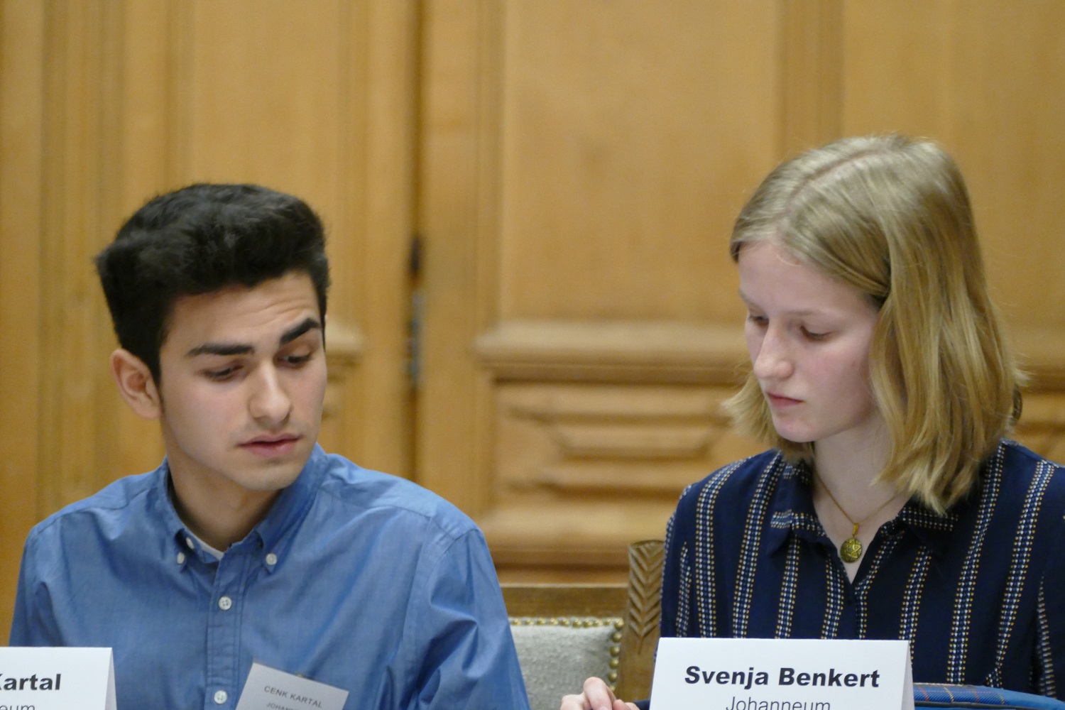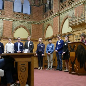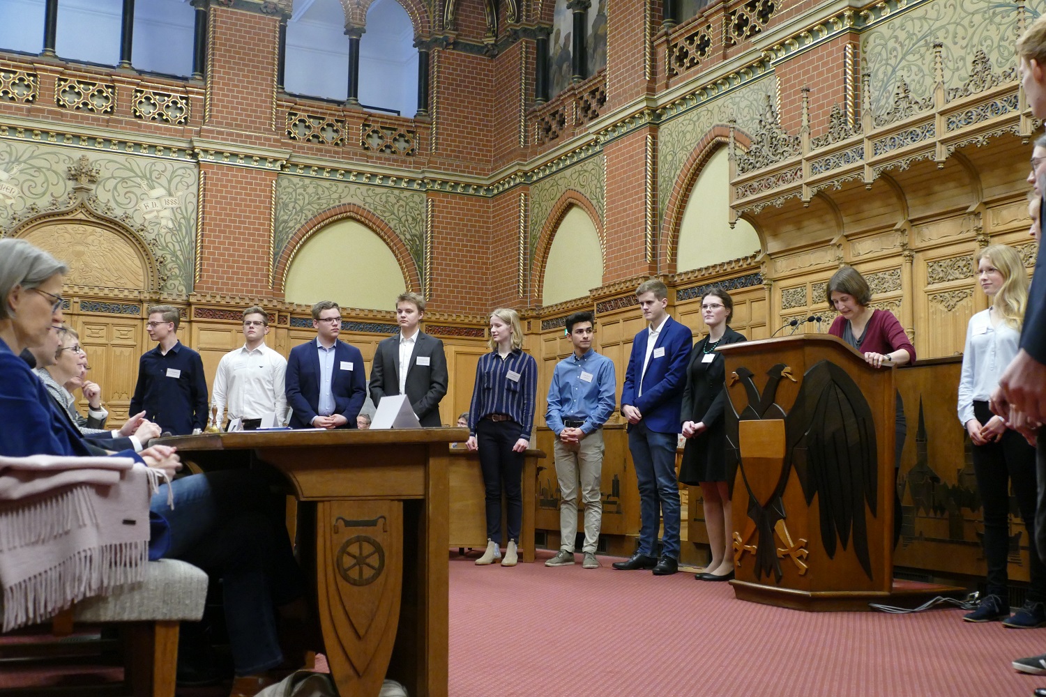 Aber durch das intensive Training wurden uns das Format vom Reden Halten und Debattieren am Ende so vertraut, dass wir schließlich im Rathaus vor großem Publikum mehr oder weniger gelassen auftreten konnten. Im Bürgerschaftssaal, wo sonst das Stadtparlament tagt und seine Debatten hält, wurden zunächst in zwei Halbfinalen die Teilnehmer der Finaldebatte bestimmt. Obwohl wir nicht zu diesen „Auserwählten“ gehörten, war es trotzdem sehr spannend, die hitzige Finaldebatte zu verfolgen, aus der schließlich die eröffnende Opposition, das Team des Trave-Gymnasiums, als Sieger hervorging.
