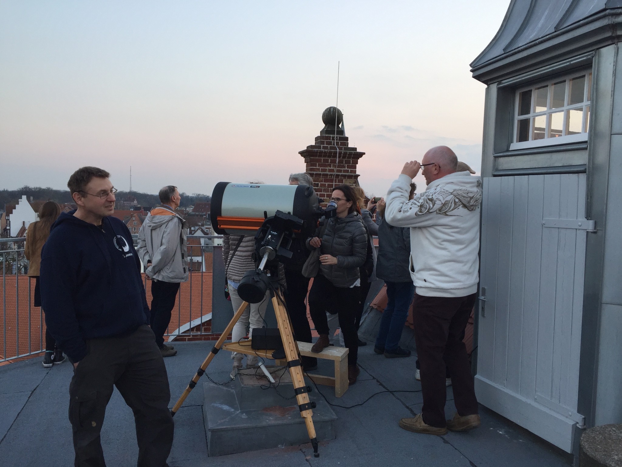 Auch die Sternwarte des Johanneums auf der Astroplattform ist noch nicht ganz fertig, aber wieder einen großen Schritt vorangekommen. So konnten diesmal viele Interessierte die herrliche Aussicht vom Schuldach aus genießen oder das schuleigene Teleskop bestaunen und – noch bei Tageslicht – einen Blick entweder auf zwei über zwölf Kilometer entfernte Windräder östlich vom Ratzeburger See oder auf den Hahn auf dem Dachreiter von St. Marien werfen.