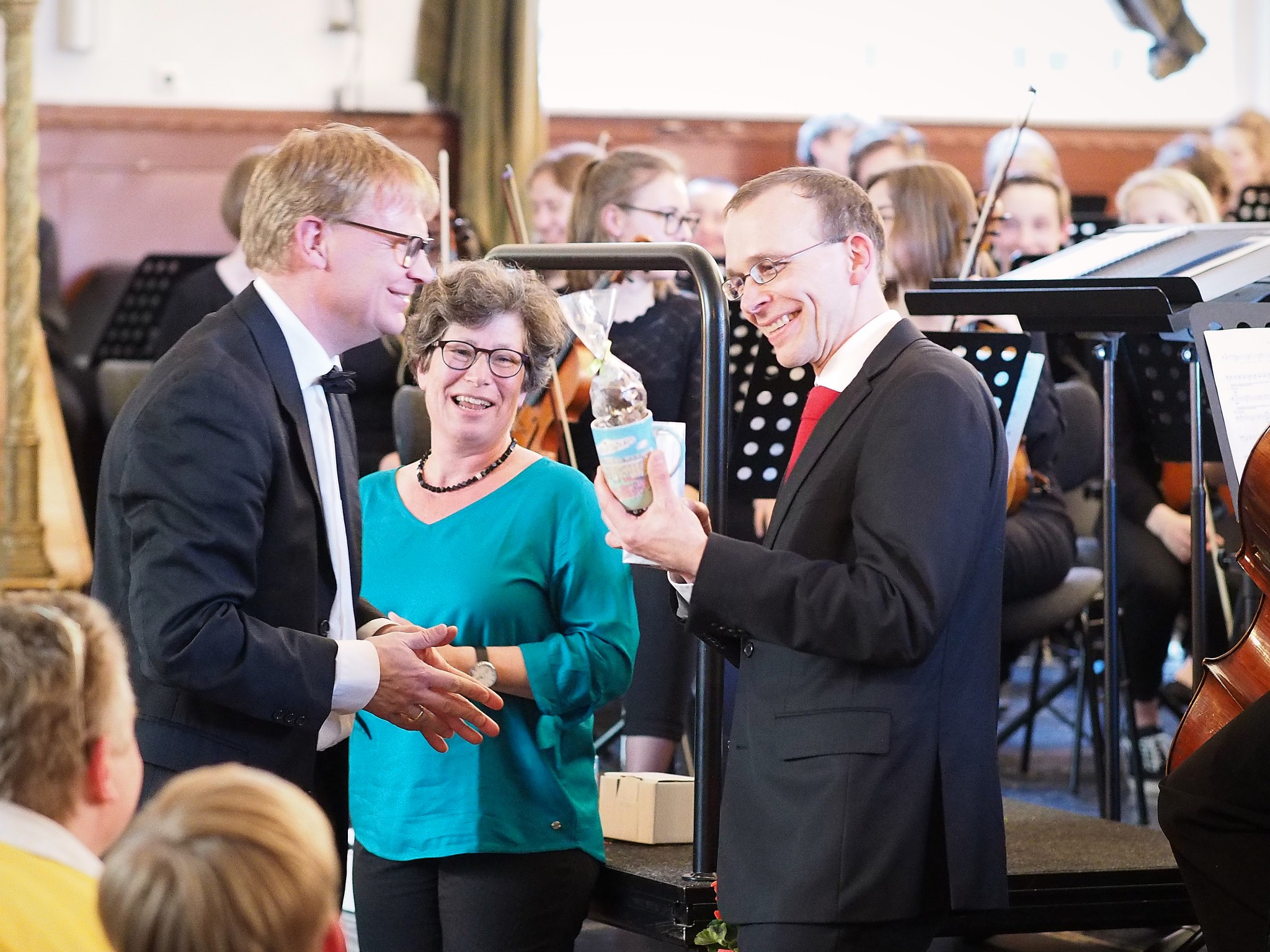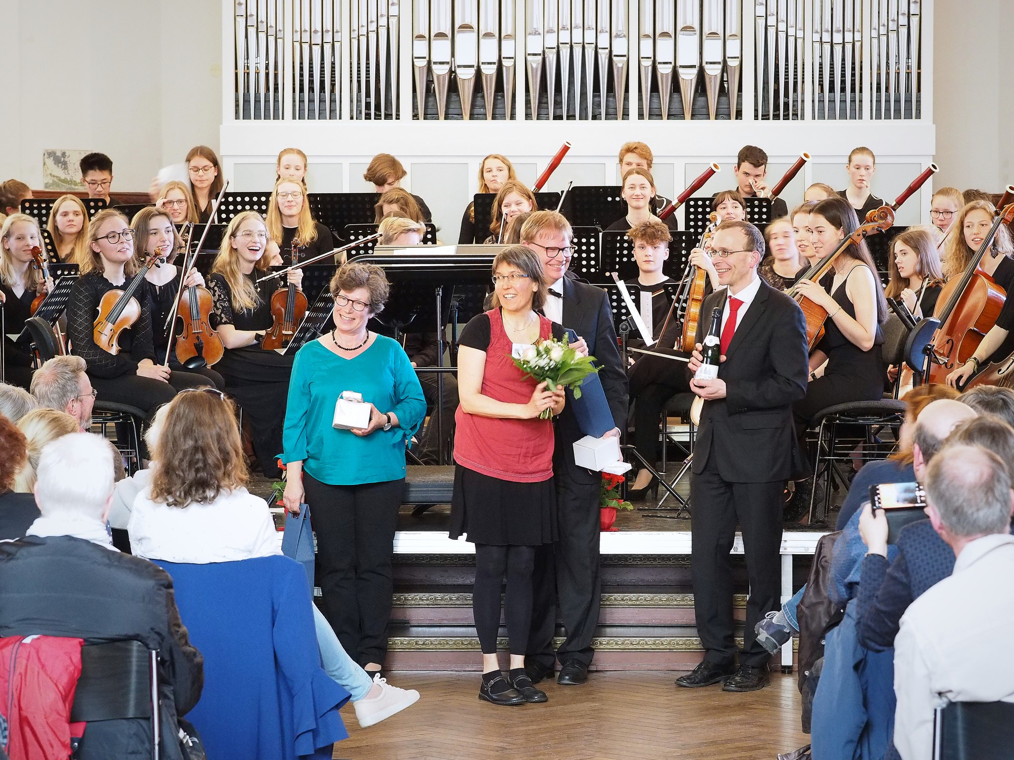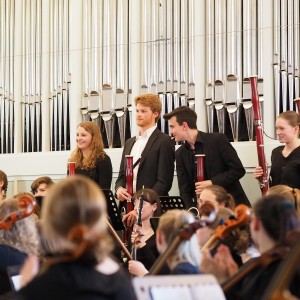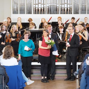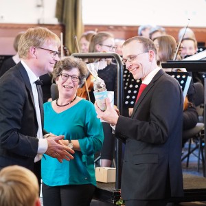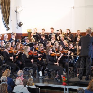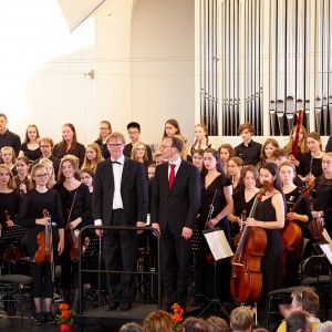 Ich habe die Bühne der Aula noch nie so voll gesehen und vielleicht war auch Zauberei im Spiel, dass zwei große Orchester Platz fanden. Nach dem ersten gemeinsamen Stück spielte das Orchester des Johanneums allein eine Uraufführung: Es erklang das spannende Stück „Baba Yaga – Tour de force in 125 Takten“ des Berliner Komponisten Benjamin Schweitzer, der früher selbst Schüler des Johanneums war. Er erzählte nach dem Stück, wie er damals in der Aula am Cello saß… Er kam sogar extra mehrfach aus Berlin angereist, um mit dem Orchester zu proben und sein Stück im Konzert zu hören. Danach spielte das Ludwigsburger Orchester den „Hexenritt“ aus der Oper „Hänsel und Gretel“ und eine Ballettmusik aus der Oper „Faust“.