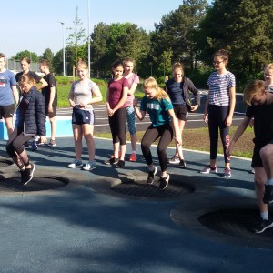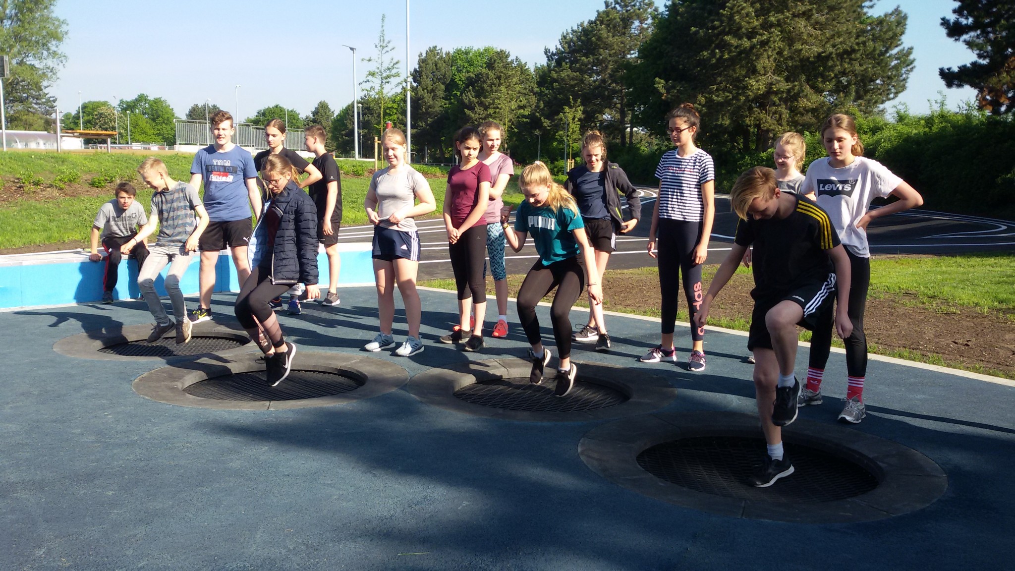 Durftet Ihr schon einmal etwas einweihen? Wir haben es getan: Am Donnerstag durften wir gemeinsam mit der 8d als allererste Klassen überhaupt den neuen Sportplatz an der Falkenwiese erkunden und sogar den brandneuen Spielplatz ausprobieren. Auf der renovierten Falkenwiese gibt es großartige Geräte: Trampoline, eine Kletterwand und sogar einen Parcourlauf.