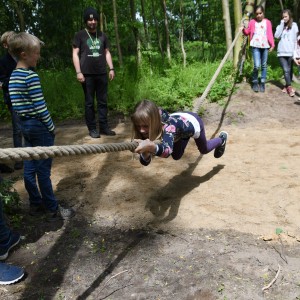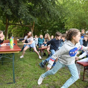 Der Tag fing an und die meisten waren relativ früh wach. Dann gab es Frühstück. Es war sehr lecker. Meine Zimmergenossen, 1-2 aus anderen Zimmern und ich räumten den Tisch ab. Nach dem Frühstück wurde angekündigt, dass Erlebnispädagogen kommen. Aber davor durften wir kurz raus. Die Erlebnispädagogen waren super freundlich und nett und teilten uns in zwei Gruppen auf. Zuerst spielten wir Po-Alphabet. Es klang lustig und das war es auch, denn man musste zu einem Netz laufen und seinen Namen mit dem Po in die Luft schreiben. Danach wurden wir wieder eine große Gruppe. Uns wurde eine Geschichte erzählt, dass wir in einem Flugzeug gesessen haben, es auf einer einsamen Insel eine Bruchlandung hingelegt hat, aber alle überlebt haben. Wir mussten durchzählen, nur leider war es im Flugzeug „ dunkel „ also einigten wir uns, die Klassenliste ins Spiel zu bringen. Dann sind wir raus aus dem Flugzeug gegangen, aber wir mussten davor noch durch eine Drehtür laufen. Ein Springseil stellte dies dar. Als wir draußen waren, mussten wir im Gleichschritt gehen, weil das eine besondere Insel war, auf der wir gestrandet waren. Dann waren wieder die Gruppen gefragt. Wir spielten kleine Minispiele rund ums Überleben in der Wildnis. Am besten fand ich das „ Apfel auf einem Ring in eine Kiste balancieren“. Und noch einige andere Spiele. Dann hatten wir wieder Freizeit. Nach alledem waren wir ziemlich hungrig und dann gab es auch schon wieder Mittag. Es gab Hackbraten mit Bohnen und Kartoffeln. Als nächstes gingen wir in den nahe liegenden (Mini) Wald. Dort wurde uns gezeigt, wie man auf verschiedenste Weise Feuer macht und alle möglichen Überlebenstipps erklärt. Wir haben auch Marshmallows und Schokobananen gemacht. Dann wurde es erneut dunkel und es gab Abendbrot. Nicht viel später begann der Spieleabend mit einem Rätsel. Danach haben wir in kleinen Gruppen Gemeinschaftsspiele gespielt.