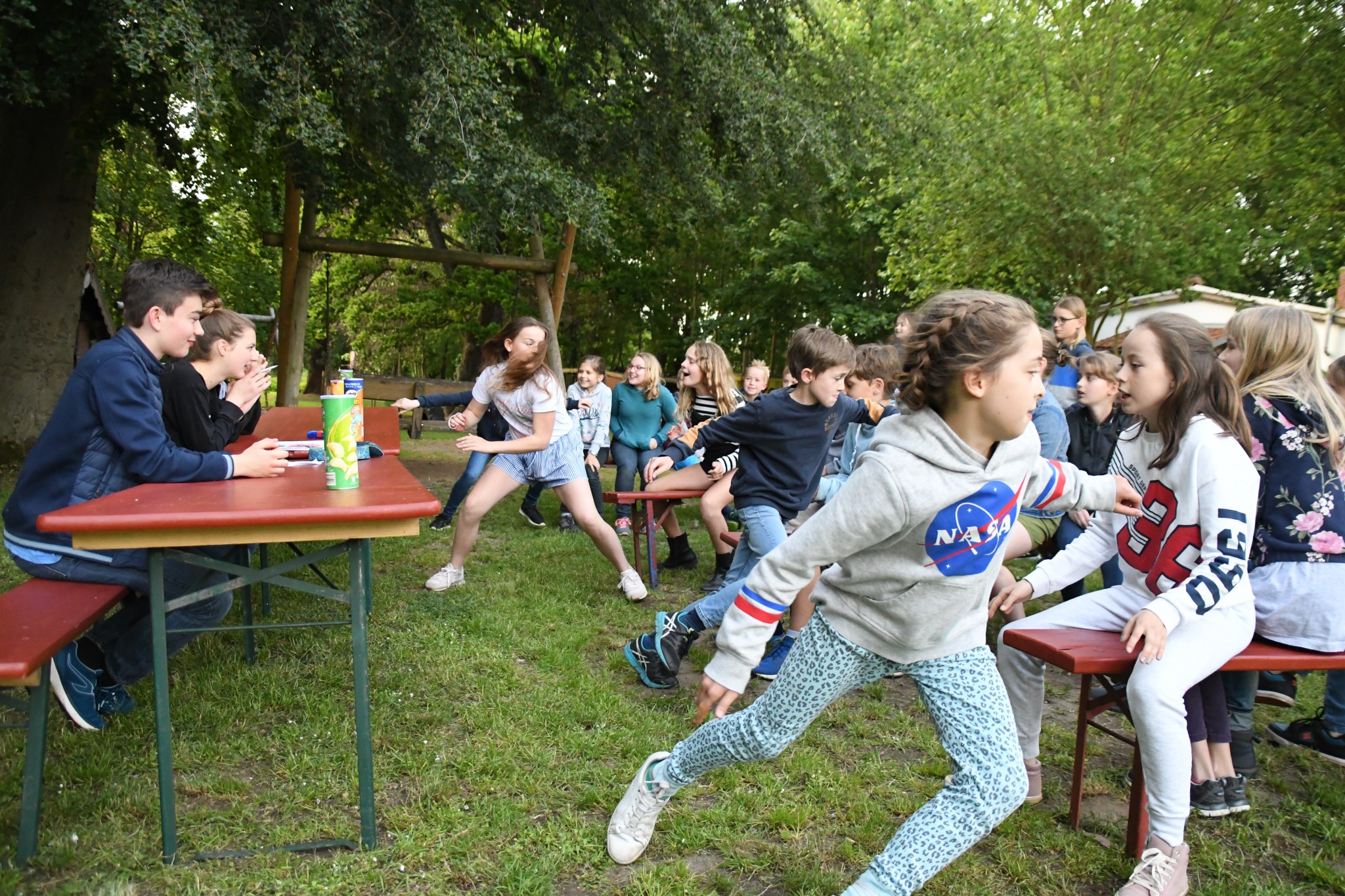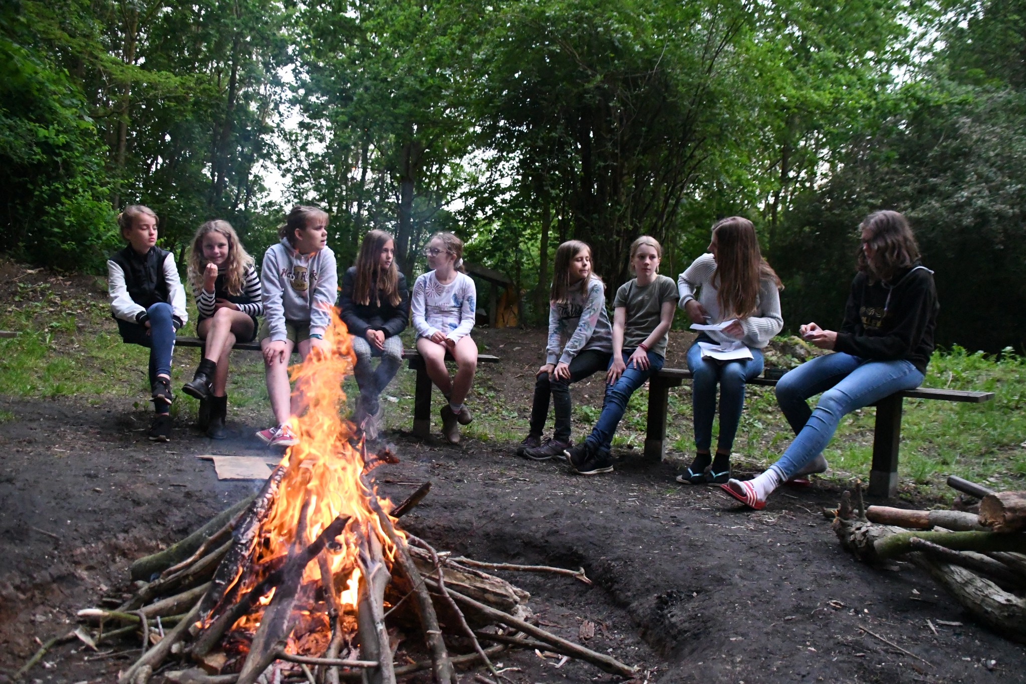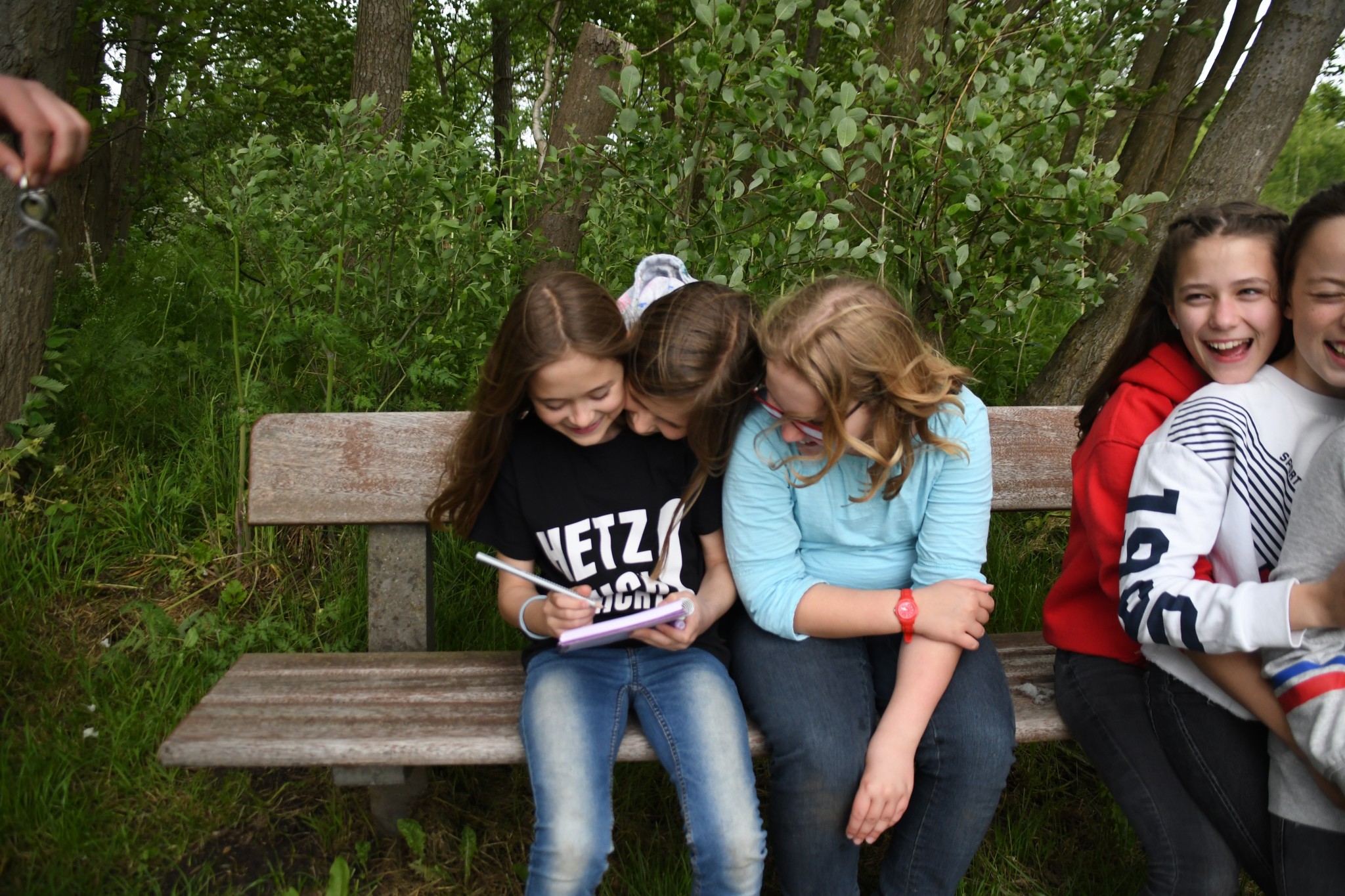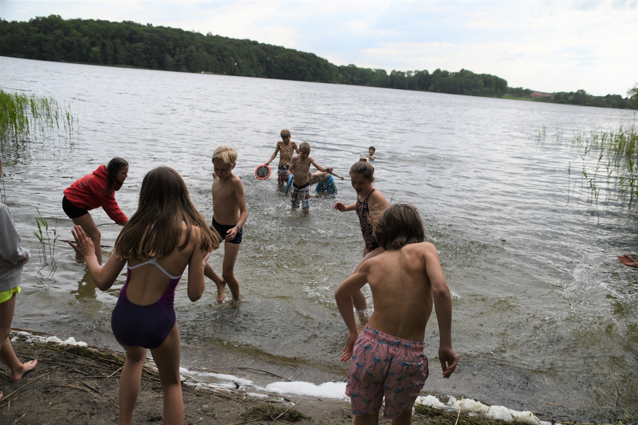Innerhalb meines Zimmers und des anderen Mädchenzimmers haben wir Werwolf gespielt. Anschließend sind wir allesamt zum See gegangen. Fast alle waren Schwimmen. Jemand berichtete von einem Spinnen-Grashüpfer, der sich als Blutegel entpuppte. Danach gab es noch eine spontane kleine Wanderung. Wir hatten kein Ziel, also sind wir irgendwann umgekehrt. Dann wurde es auch langsam dunkel und es gab auch Abendbrot. Ein bisschen später hatten die Paten ein Spiel vorbereitet. Es wurde draußen gespielt und heißt: Tisch des Hauses. Es geht so: die Paten nannten einen Gegenstand, wie z. B. Haarbürste, dann musste man so schnell wie möglich in ein X-beliebiges Zimmer laufen und den Gegenstand holen, dann wieder raus laufen und den Gegenstand auf den Tisch, an dem die Paten saßen, legen. Wir saßen auf Bänken. Es gab vier Teams. Es gab auch Challenges wie beispielsweise: verwandelt ein Mädchen in einen Jungen und umgekehrt oder findet ein Liebespaar und erfindet eine Lovestory. Als das Spiel zu Ende war, mussten einige ihre Sachen suchen, aber es fand sich alles wieder an. Am späten Abend gab es noch ein Lagerfeuer. Dort wurde erneut Werwolf gespielt.
