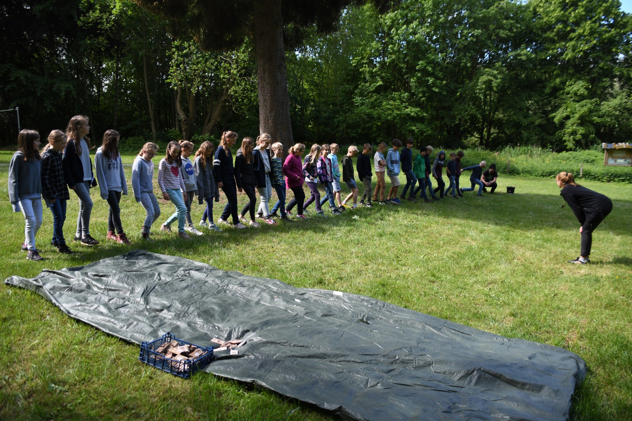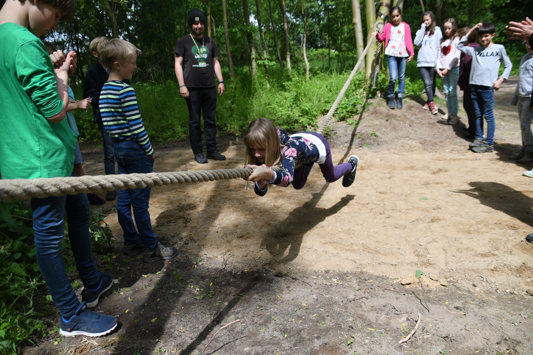 Der Tag fing an und die meisten waren relativ früh wach. Dann gab es Frühstück. Es war sehr lecker. Meine Zimmergenossen, 1-2 aus anderen Zimmern und ich räumten den Tisch ab. Nach dem Frühstück wurde angekündigt, dass Erlebnispädagogen kommen. Aber davor durften wir kurz raus. Die Erlebnispädagogen waren super freundlich und nett und teilten uns in zwei Gruppen auf. Zuerst spielten wir Po-Alphabet. Es klang lustig und das war es auch, denn man musste zu einem Netz laufen und seinen Namen mit dem Po in die Luft schreiben. Danach wurden wir wieder eine große Gruppe. Uns wurde eine Geschichte erzählt, dass wir in einem Flugzeug gesessen haben, es auf einer einsamen Insel eine Bruchlandung hingelegt hat, aber alle überlebt haben. Wir mussten durchzählen, nur leider war es im Flugzeug „ dunkel „ also einigten wir uns, die Klassenliste ins Spiel zu bringen. Dann sind wir raus aus dem Flugzeug gegangen, aber wir mussten davor noch durch eine Drehtür laufen. Ein Springseil stellte dies dar. Als wir draußen waren, mussten wir im Gleichschritt gehen, weil das eine besondere Insel war, auf der wir gestrandet waren. Dann waren wieder die Gruppen gefragt. Wir spielten kleine Minispiele rund ums Überleben in der Wildnis. Am besten fand ich das „ Apfel auf einem Ring in eine Kiste balancieren“. Und noch einige andere Spiele. Dann hatten wir wieder Freizeit. Nach alledem waren wir ziemlich hungrig und dann gab es auch schon wieder Mittag. Es gab Hackbraten mit Bohnen und Kartoffeln. Als nächstes gingen wir in den nahe liegenden (Mini) Wald. Dort wurde uns gezeigt, wie man auf verschiedenste Weise Feuer macht und alle möglichen Überlebenstipps erklärt. Wir haben auch Marshmallows und Schokobananen gemacht. Dann wurde es erneut dunkel und es gab Abendbrot. Nicht viel später begann der Spieleabend mit einem Rätsel. Danach haben wir in kleinen Gruppen Gemeinschaftsspiele gespielt.