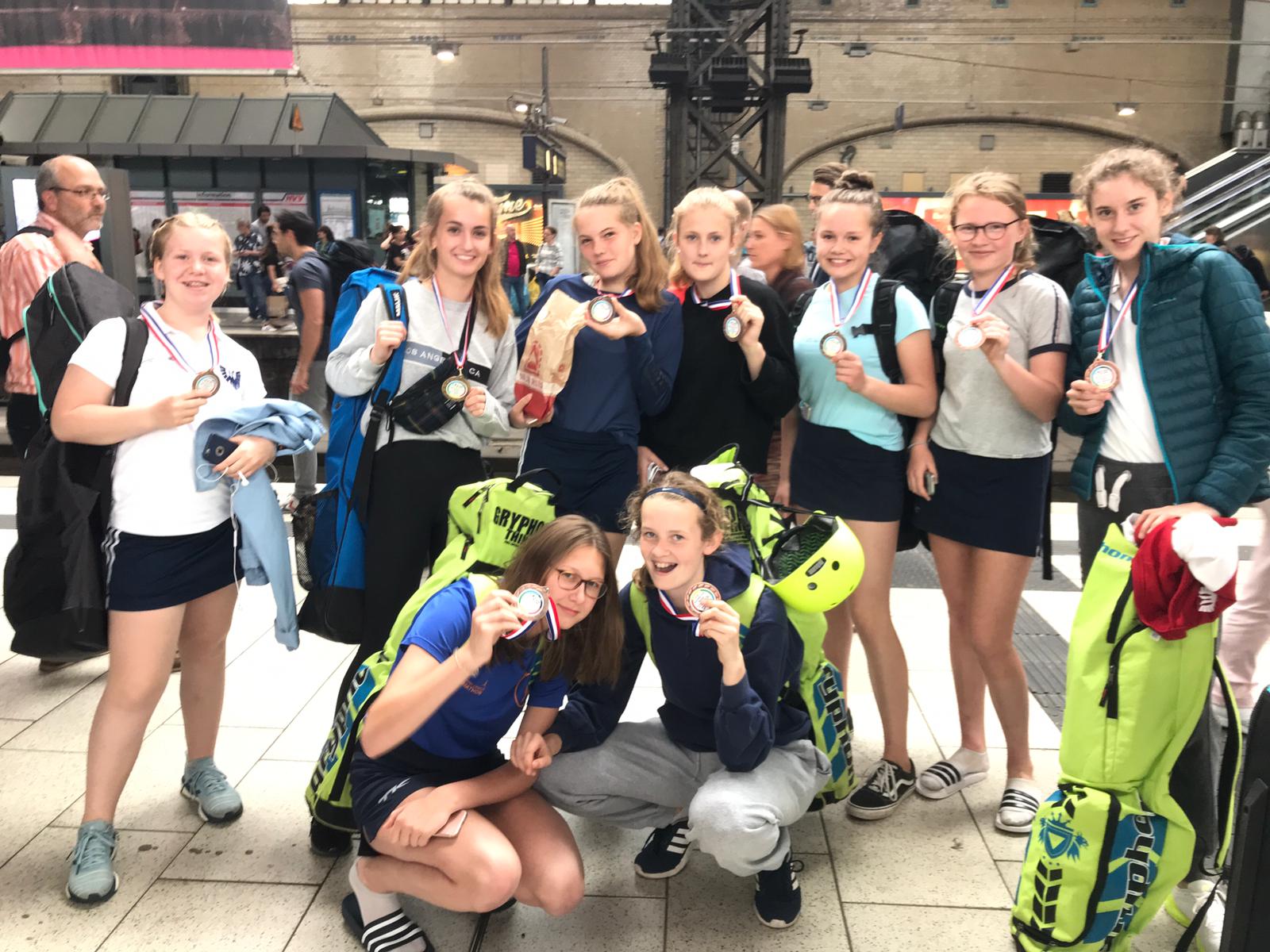 Am 6. Juni fuhr Frau Böttger mit elf Hockey-Mädchen zum Landesentscheid Jugend trainiert für Olympia nach Wohlstorf bei Hamburg. Ein Gewitterguss ging zur Begrüßung herunter, aber danach lief es recht gut. Leider waren zwei Mannschaften stärker als unsere Mädels, die sich trotzdem tapfer geschlagen haben. So bekamen sie am Schluss die Bronzemedaille überreicht, und nach Berlin fahren dann die Mädchen aus Henstedt Ulzburg.