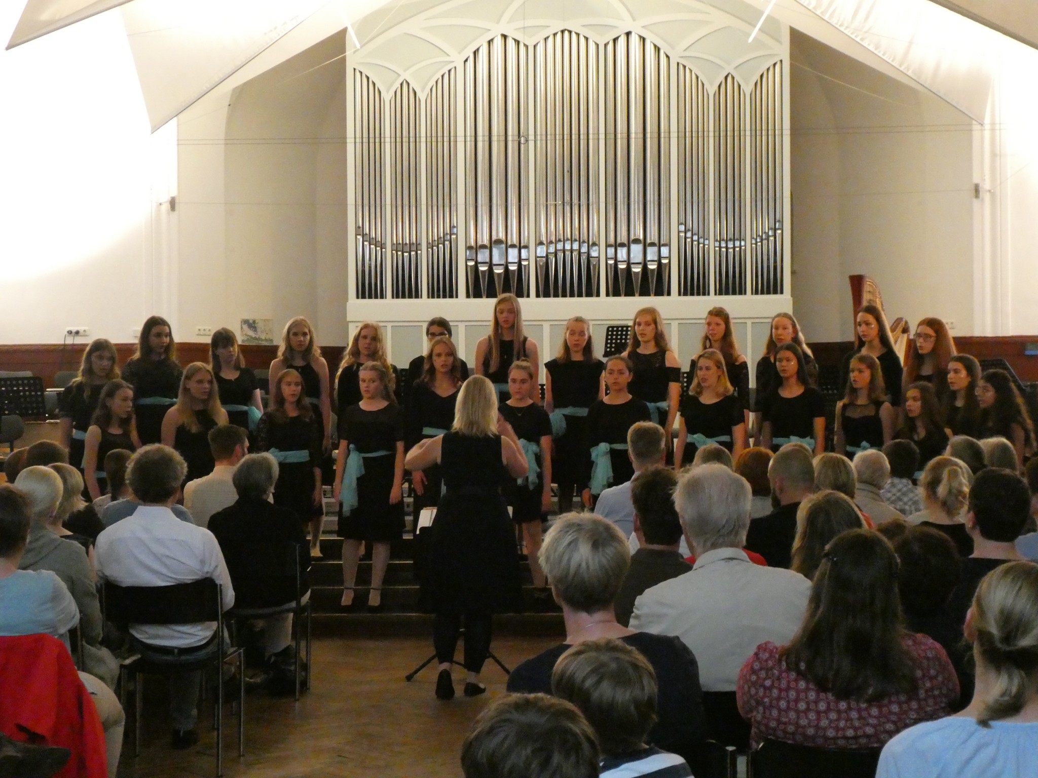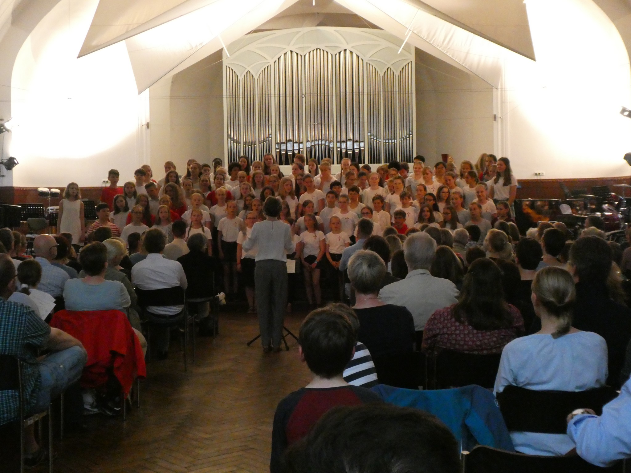 Zarte, helle und perfekt getroffene Töne schallten am späten Nachmittag zweimal durch die vollbesetzte Aula, und der Junge Chor sang mit über 100 Stimmen das ellenlange Wort „Supercalifragilisticexpialidocious“. Aber auch mit Disney-Liedern wie „I See the Light“ aus dem Märchen Rapunzel wurde das Publikum begeistert, das am 6. Juni um 17:30 und um 19:00 Uhr in der Aula saß.