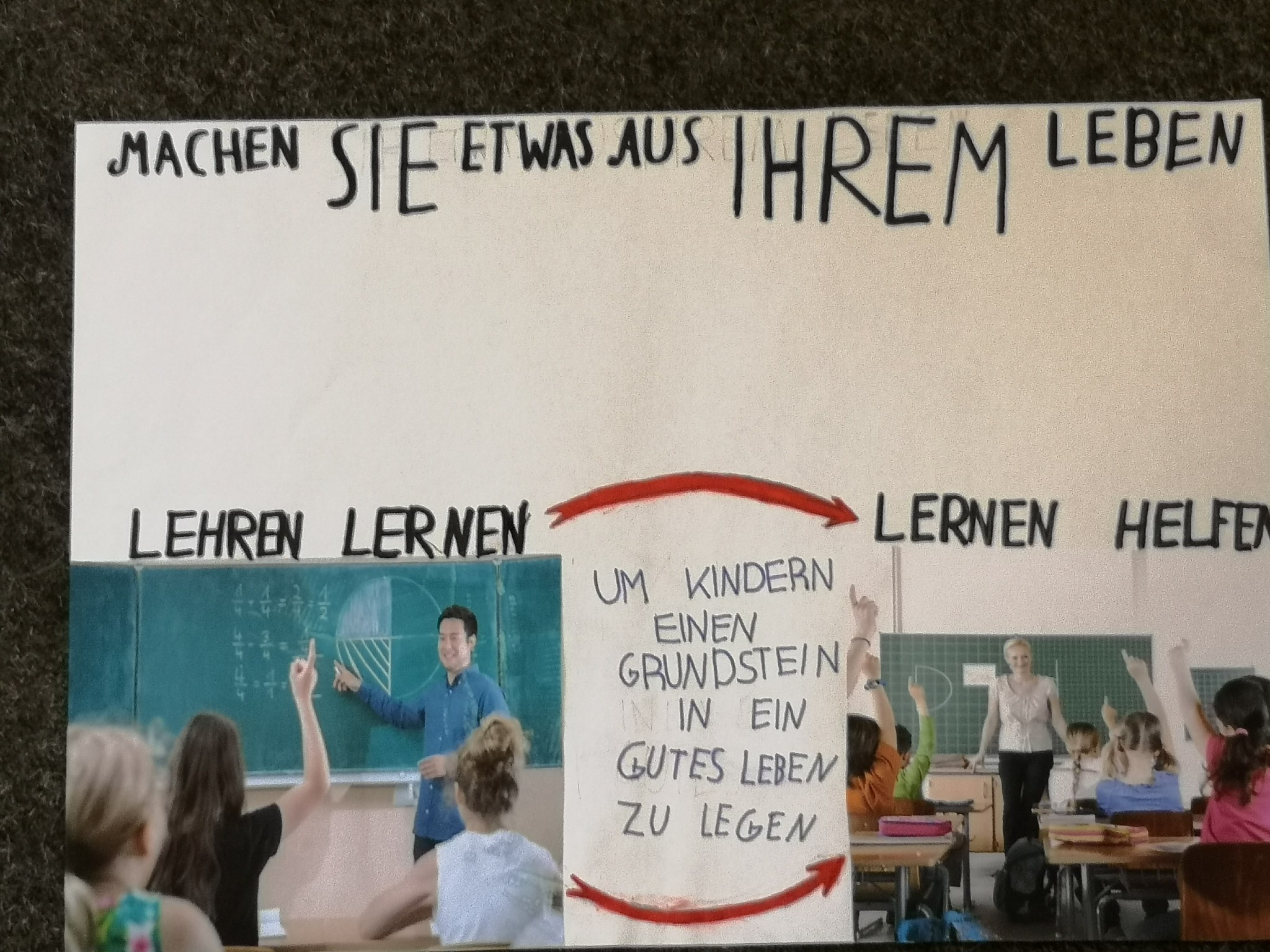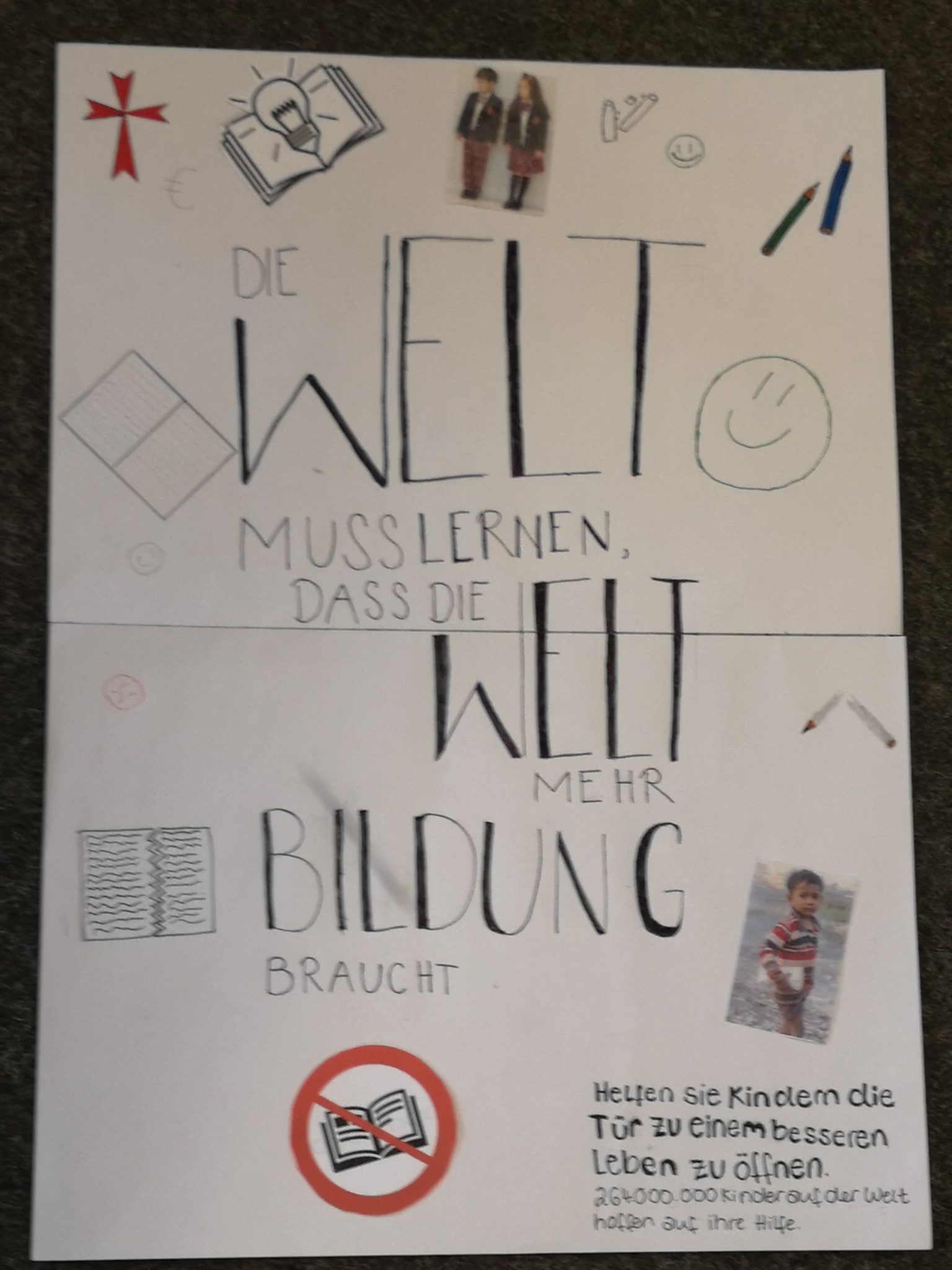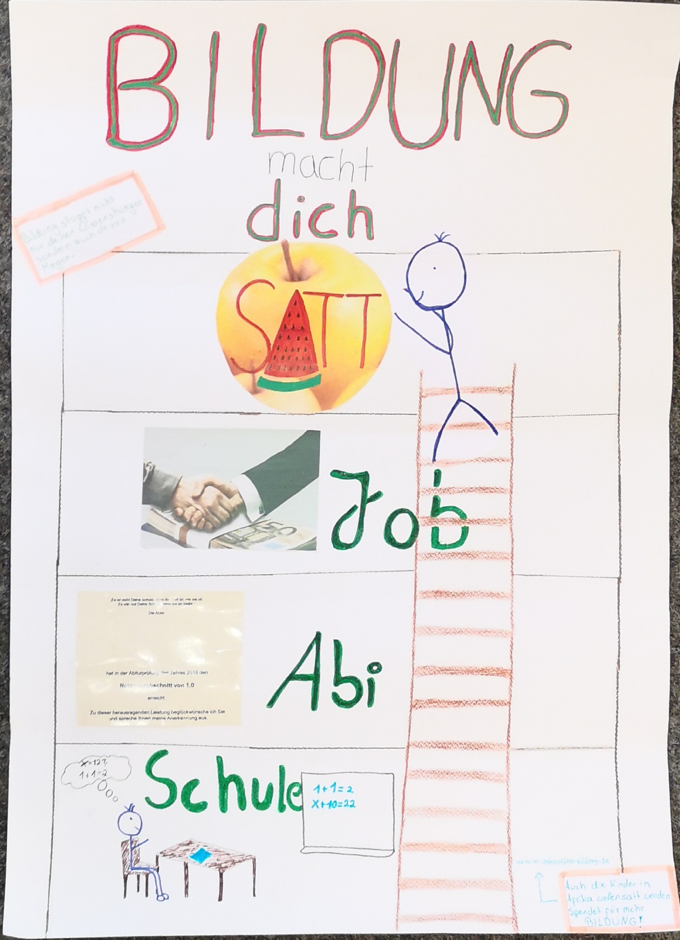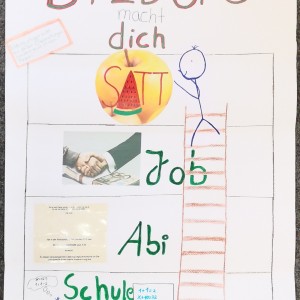 Kann man für Bildung werben? Die Klasse 7a hat sich im Deutschunterricht mit der Analyse von Werbung beschäftigt und unterschiedliche Werbestrategien hinterfragt. In einer eigenen Kampagne zum Thema „Bildung“ haben die Schülerinnen und Schüler ihr Wissen angewendet und eigene Werbeplakate und -filme erstellt. Sehen Sie selbst, wieviel Freude das Lernen machen kann.