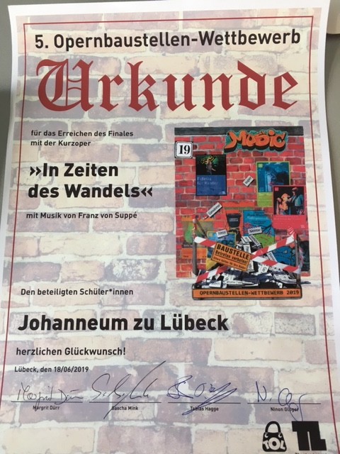 Heiß war es, das Finale in den Kammerspielen des Theaters! Vor vollem Haus wetteiferte die Ea mit zwei weiteren Lübecker Schülergruppen um den Pokal. Letztlich gab die Publikumsstimme den Ausschlag, wobei die Applausstärke in Dezibel gemessen wurde. So siegte eine 9. Klasse von der Schule an der Wakenitz mit ihrer Kurzoper „Transegal“ mit drei Stimmen vor dem Johanneum und dem Katharineum (jeweils zwei Stimmen).