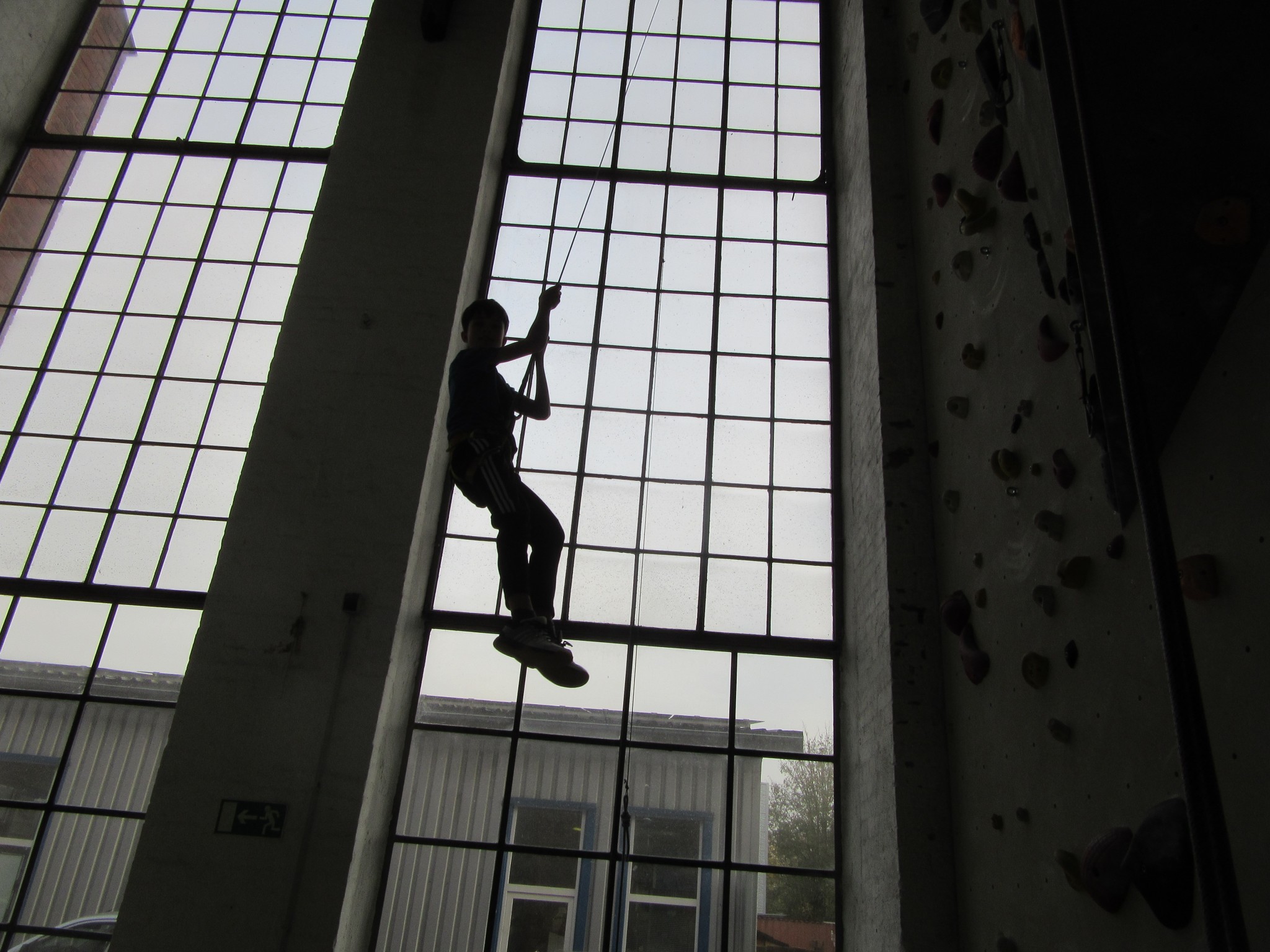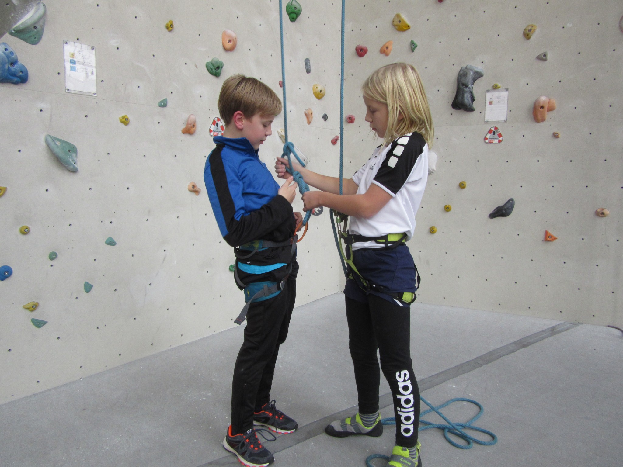 Dann holen wir uns die Gurte und wir gehen runter, um dann ganz hoch zu klettern. Es gibt auch Automaten, die selbst sichern, aber wir lernen auch, uns gegenseitig zu sichern und den Partnercheck nicht zu vergessen.