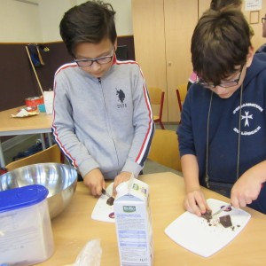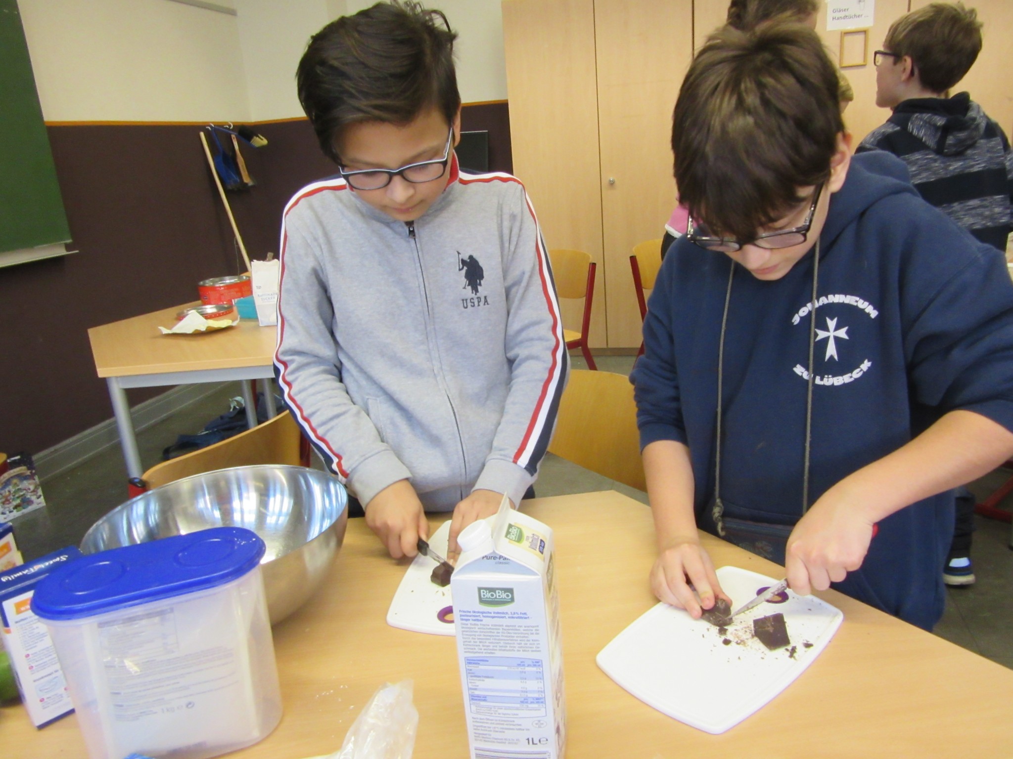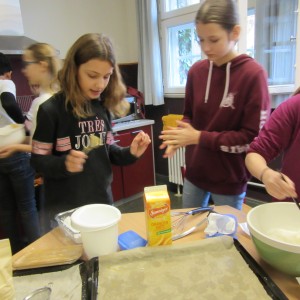 Zuvor hatten wir die Teams eigeteilt und jeder war für seine eigenen Kekse zuständig. Manche brachten schon den fertigen Teig mit, andere mussten noch alles zusammenmischen. Als eine Gruppe dann noch die Schokolade im Wassserbad schmelzen musste, bekam Frau Böttger fast zu viel.