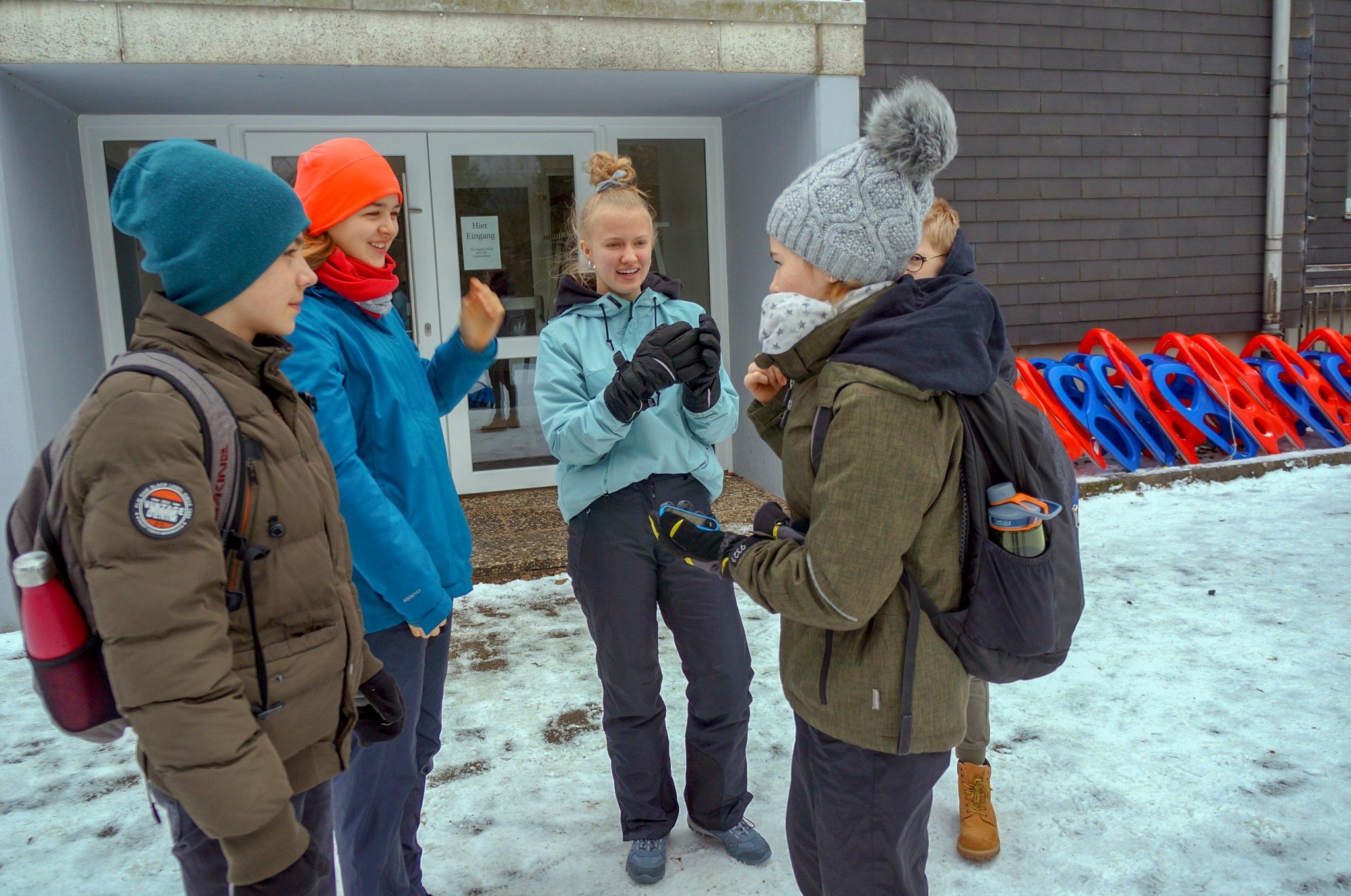 Am Dienstagmorgen erwachten wir in Winterlaune – es hatte über Nacht geschneit! Einige Klassen fuhren mit dem Bus nach Braunlage und liefen Schlittschuh. Frau Scheibe zeigte uns einige Profitricks. Danach wanderten wir den Weg zur Herberge zurück, umgeben von einer tollen Winterlandschaft. Der ein oder andere Schneeball flog natürlich auch.