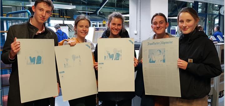 Unsere wichtigste Station und der Hauptgrund für die Frankfurt-Reise stand als nächstes auf dem Programm: Der Besuch in der Redaktion der Frankfurter Allgemeinen Zeitung, wo die Projektbetreuerin Frau Becker mit uns jeden einzelnen Artikel durchgesprochen und Vorschläge zur Verbesserung gemacht hat und uns einen kurzen Einblick in den Tagesablauf in der Redaktion und die Organisation einer Zeitung gewährte. Anschließend wurden wir – jetzt tatsächlich bei dem von Sabine versprochenen Sturm und Regen – zur Druckerei gefahren und konnten uns erklären lassen, in welchen Schritten eine Zeitung gedruckt wird.