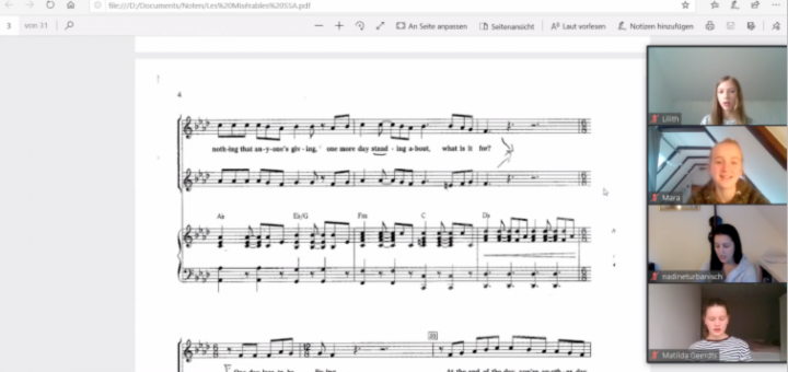 Normalerweise sitzen wir mittwochs in vollen Stuhlreihen im Studio und studieren die verschiedensten Lieder ein. Doch jetzt? Wie können wir unsere Stimme weiterhin trainieren, damit sie nicht einrostet? Und die Lieder weiter singen, um den Text und die Melodie zu lernen? Wir trafen uns einfach übers Internet! Wir schalteten alle unsere Mikrofone aus, nur das von Frau Salomon oder von Nadine, unserer Studentin, blieb an, somit konnten wir zu einer Stimme dazu singen. Frau Salomon zeigte uns allen über ihren Bildschirm die Noten, weil wir die Stimmen nicht zu Hause haben.