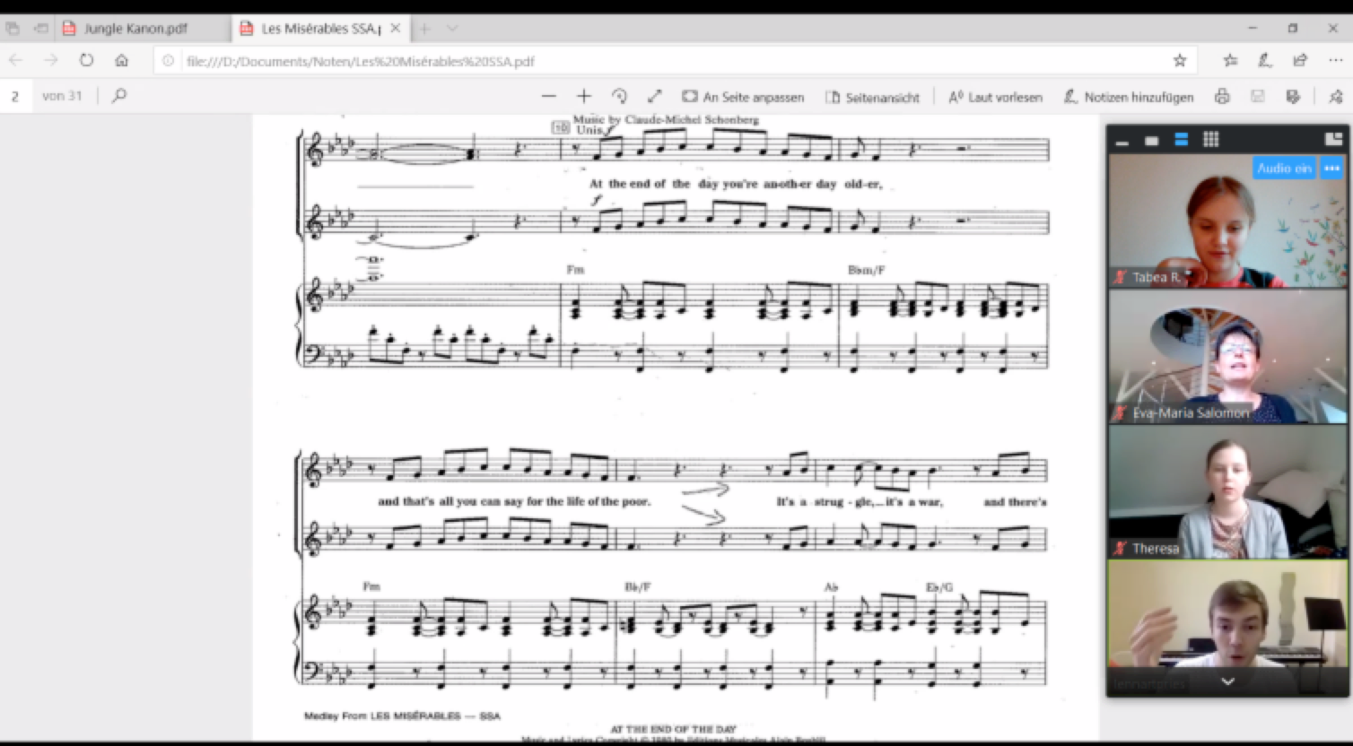 Doch es war ein sehr komisches Gefühl, alleine in seinem Zimmer zu singen, ohne andere zu hören, gerade weil ein Chor ja eigentlich aus dem gemeinsamen Singen besteht. Als Experiment versuchten wir alle zusammen zu singen, indem wir alle Mikros laut stellten und zusammen Lieder von dem Film und Roman Les Miserables anstimmten, doch die Verzögerung war zu groß:) Aber man muss Alternativen finden, und das haben wir auf jeden Fall versucht!