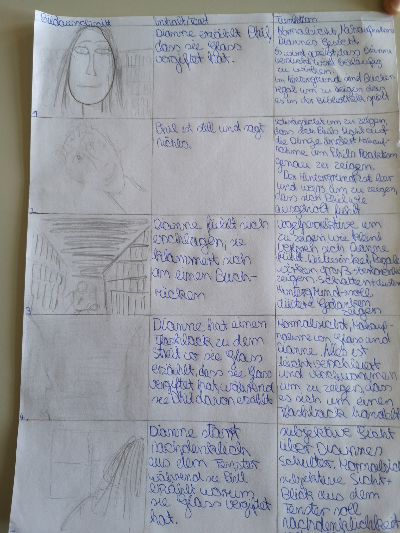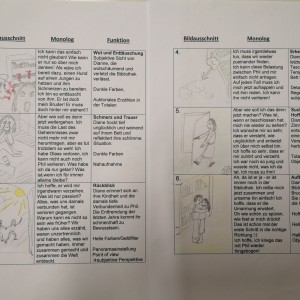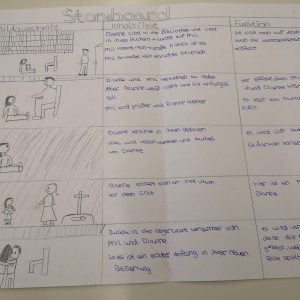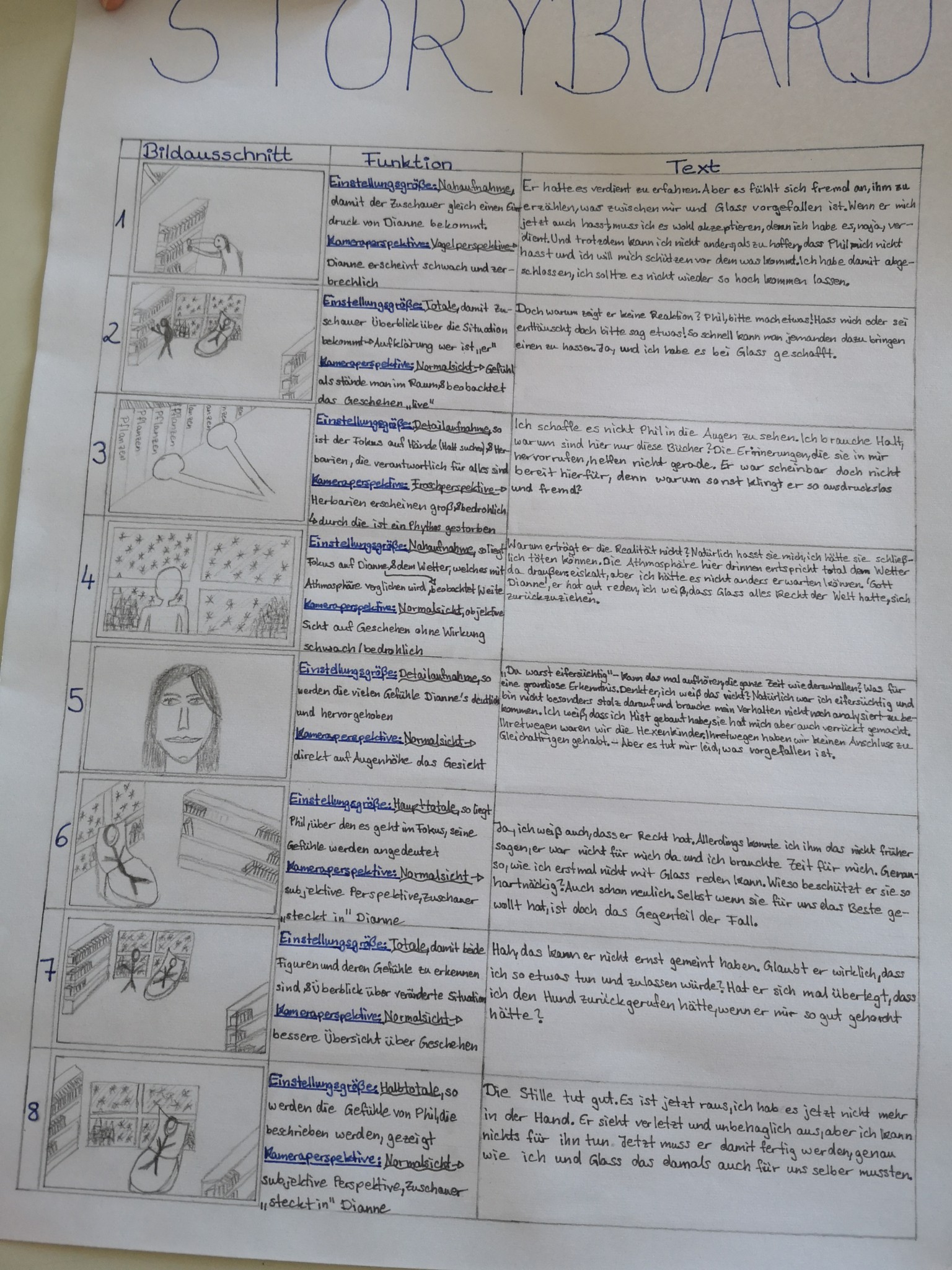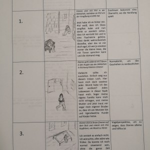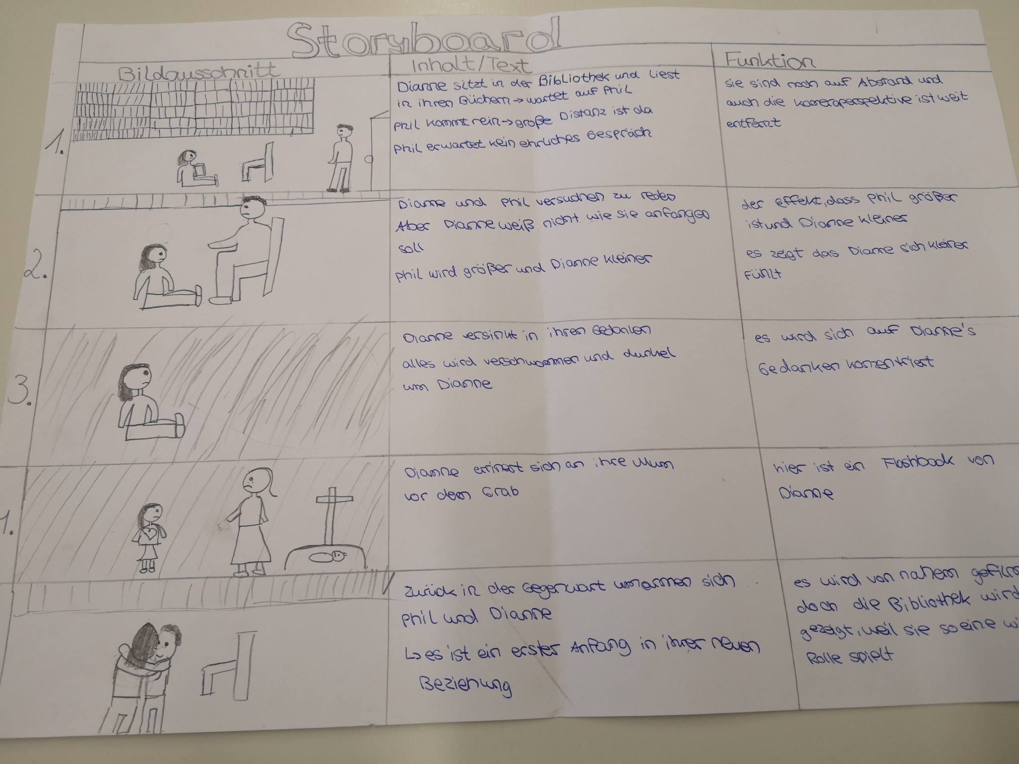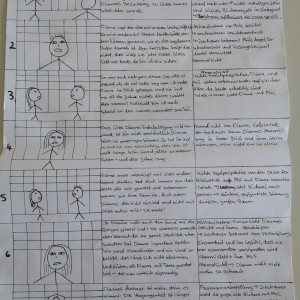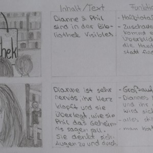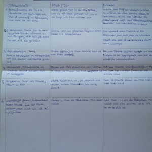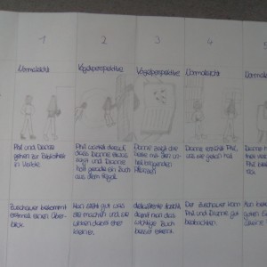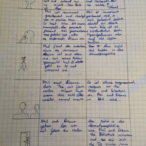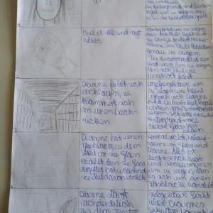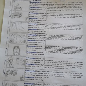 Über die Homeschooling-Zeit des mündlichen Abiturs hat die 9a ein Storyboard zu dieser wichtigen Szene entwickelt. Ein Storyboard ist eine Art bildliche Darstellung dessen, was der Regisseur später im Film sehen möchte. Dabei wird auf Kameraeinstellung, Musik, Regieanweisungen, aber auch den Inhalt (also was sprechen die Figuren) eingegangen.