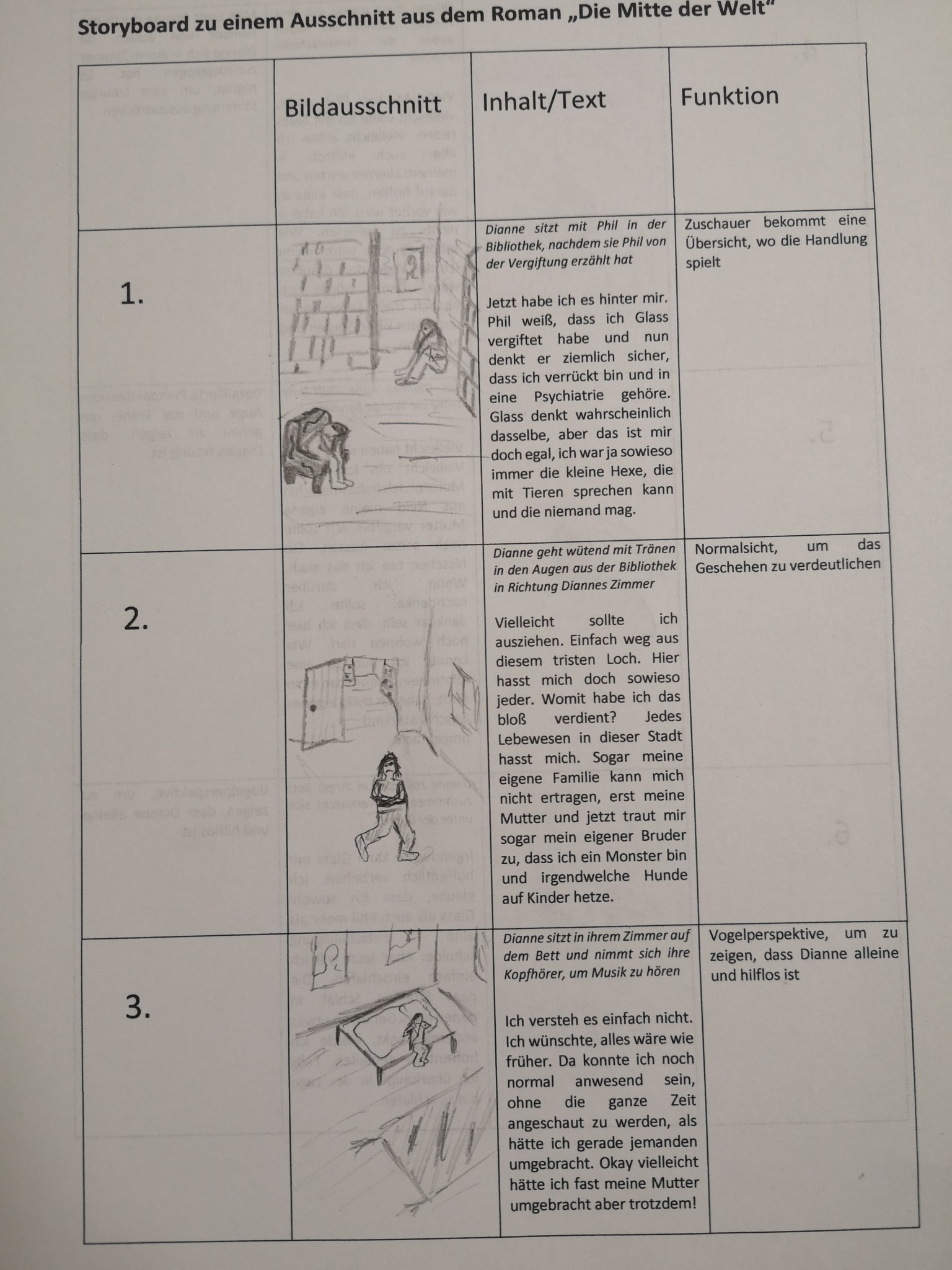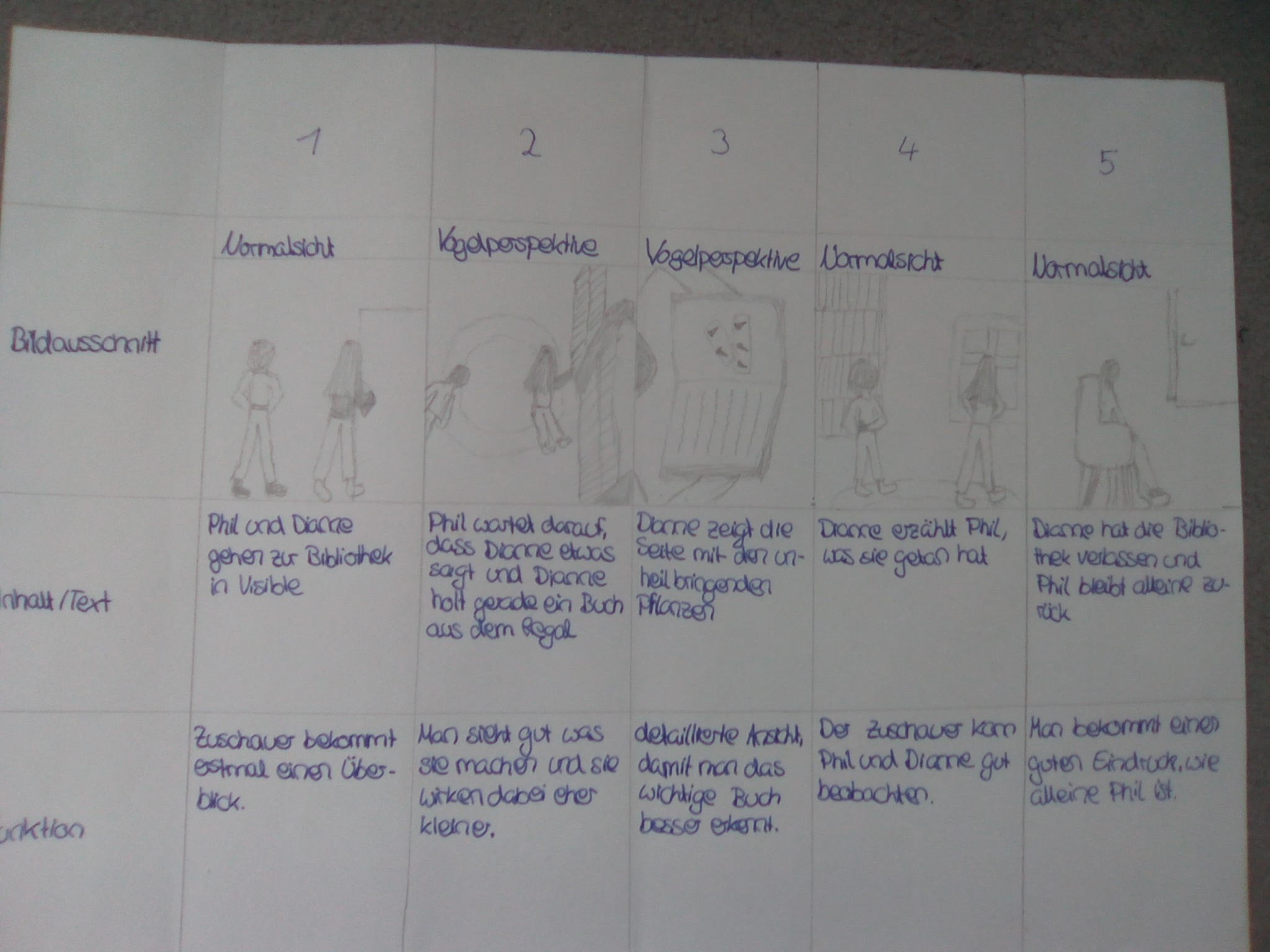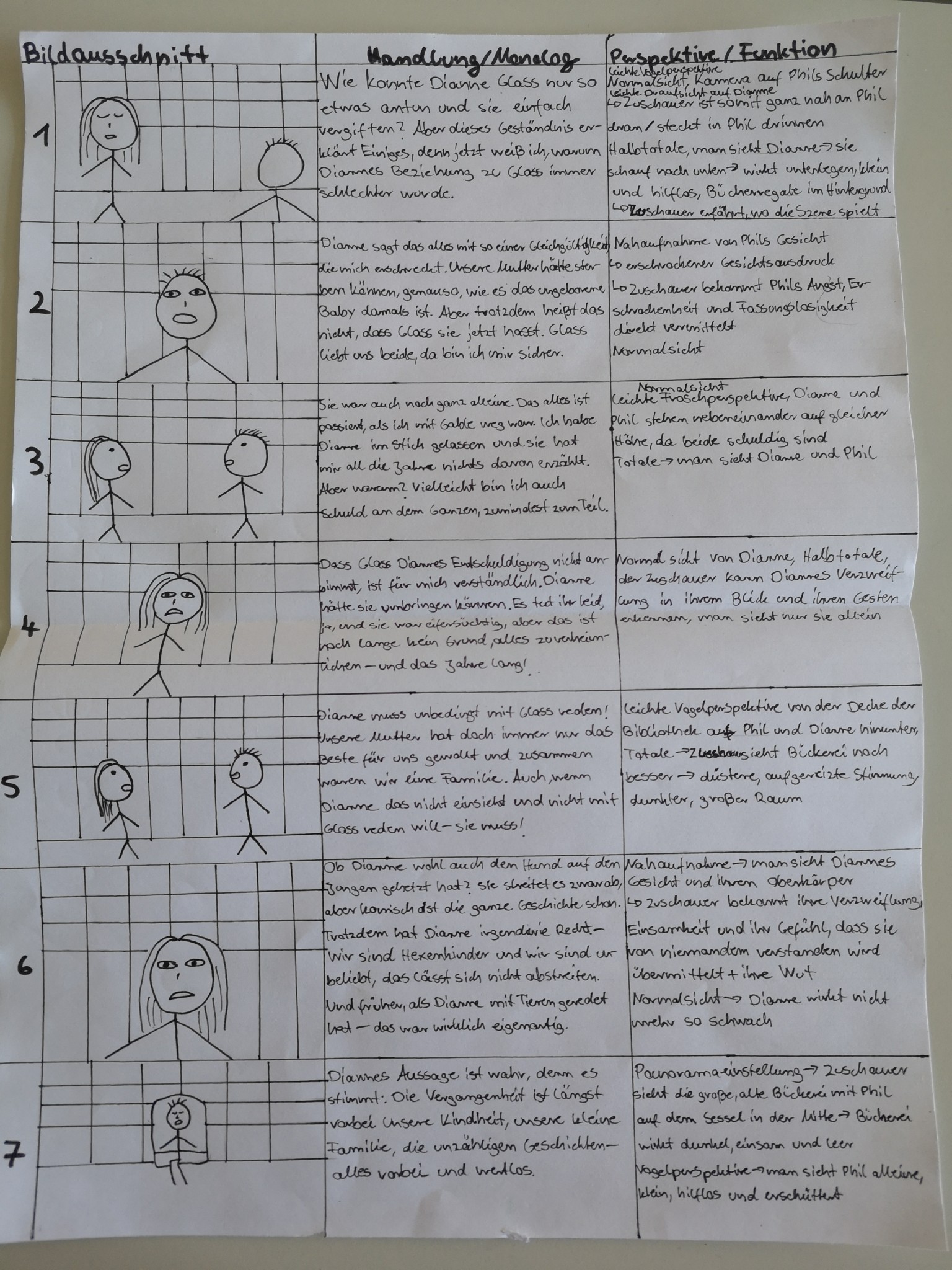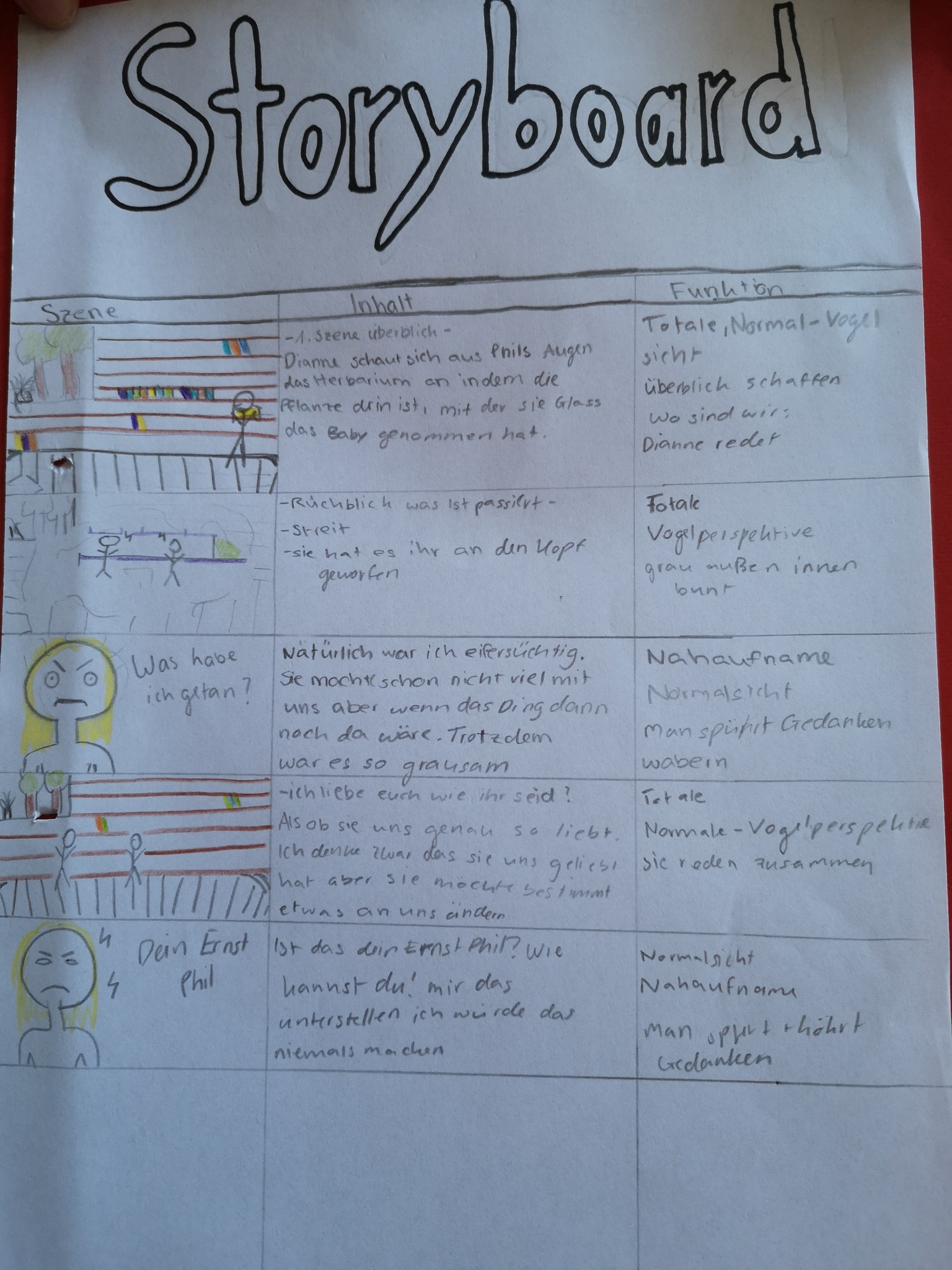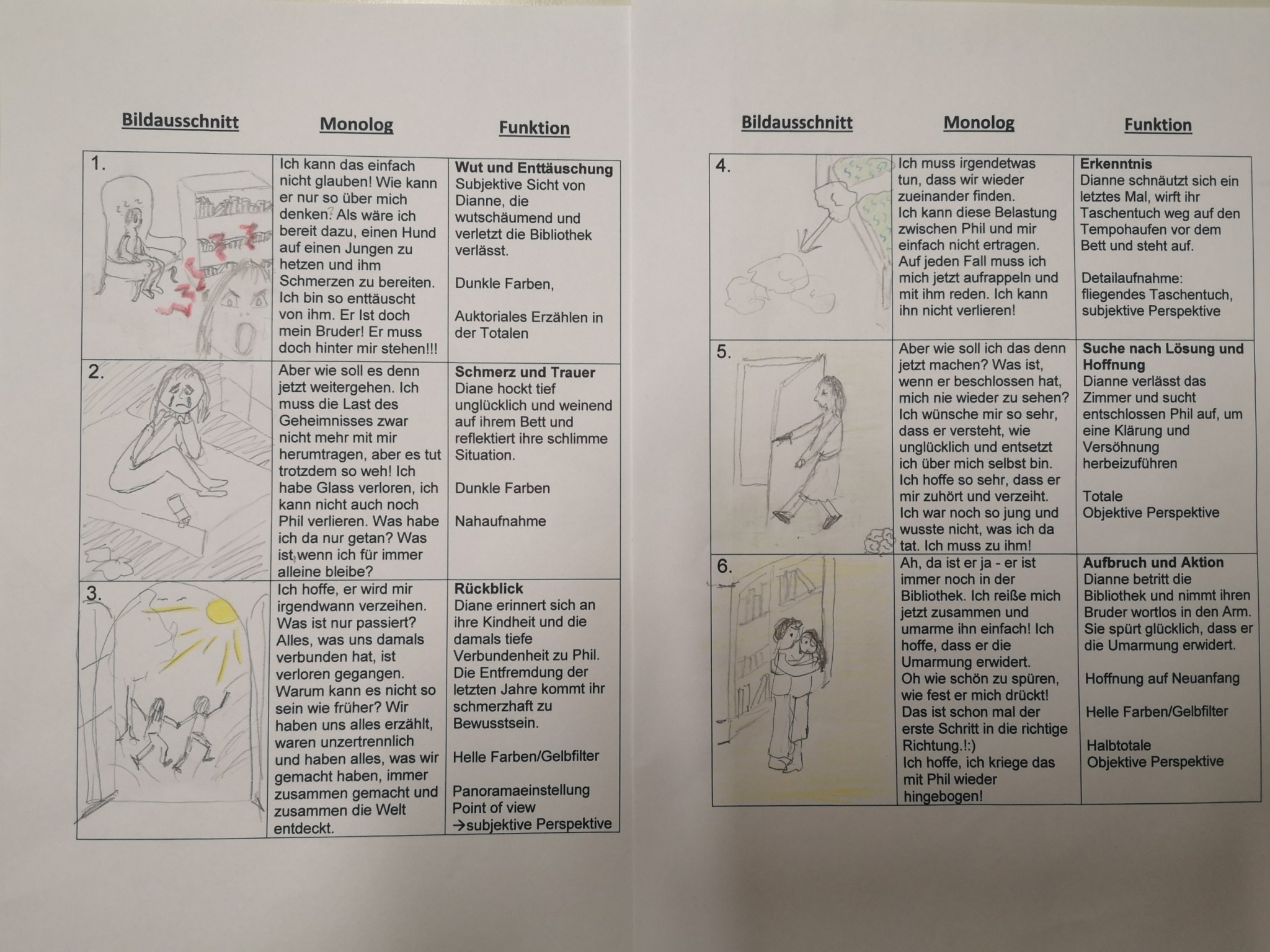 Über die Homeschooling-Zeit des mündlichen Abiturs hat die 9a ein Storyboard zu dieser wichtigen Szene entwickelt. Ein Storyboard ist eine Art bildliche Darstellung dessen, was der Regisseur später im Film sehen möchte. Dabei wird auf Kameraeinstellung, Musik, Regieanweisungen, aber auch den Inhalt (also was sprechen die Figuren) eingegangen.
