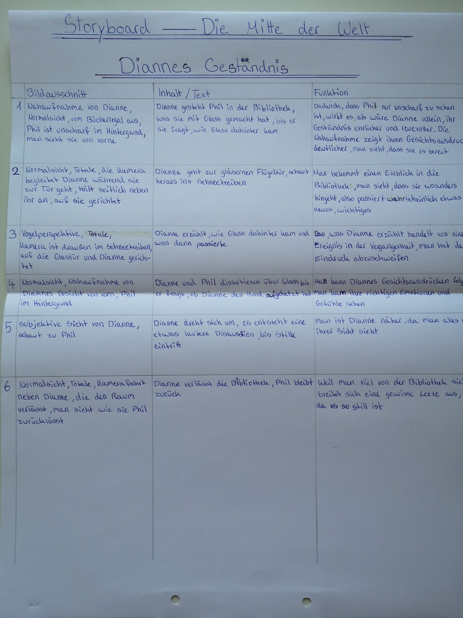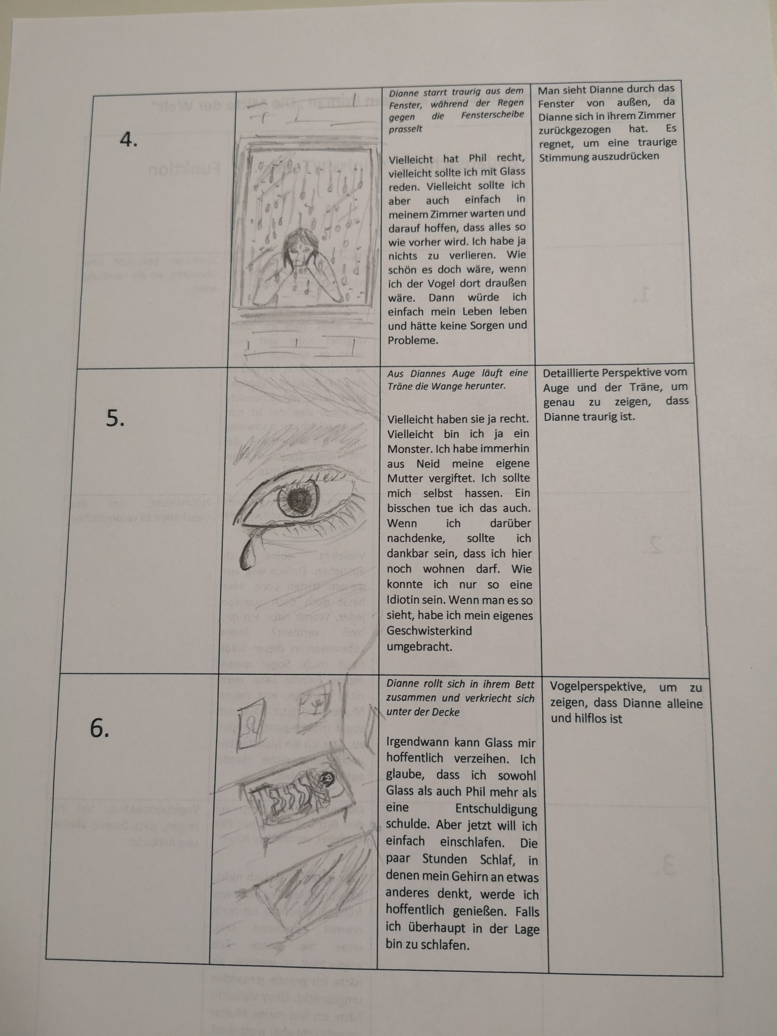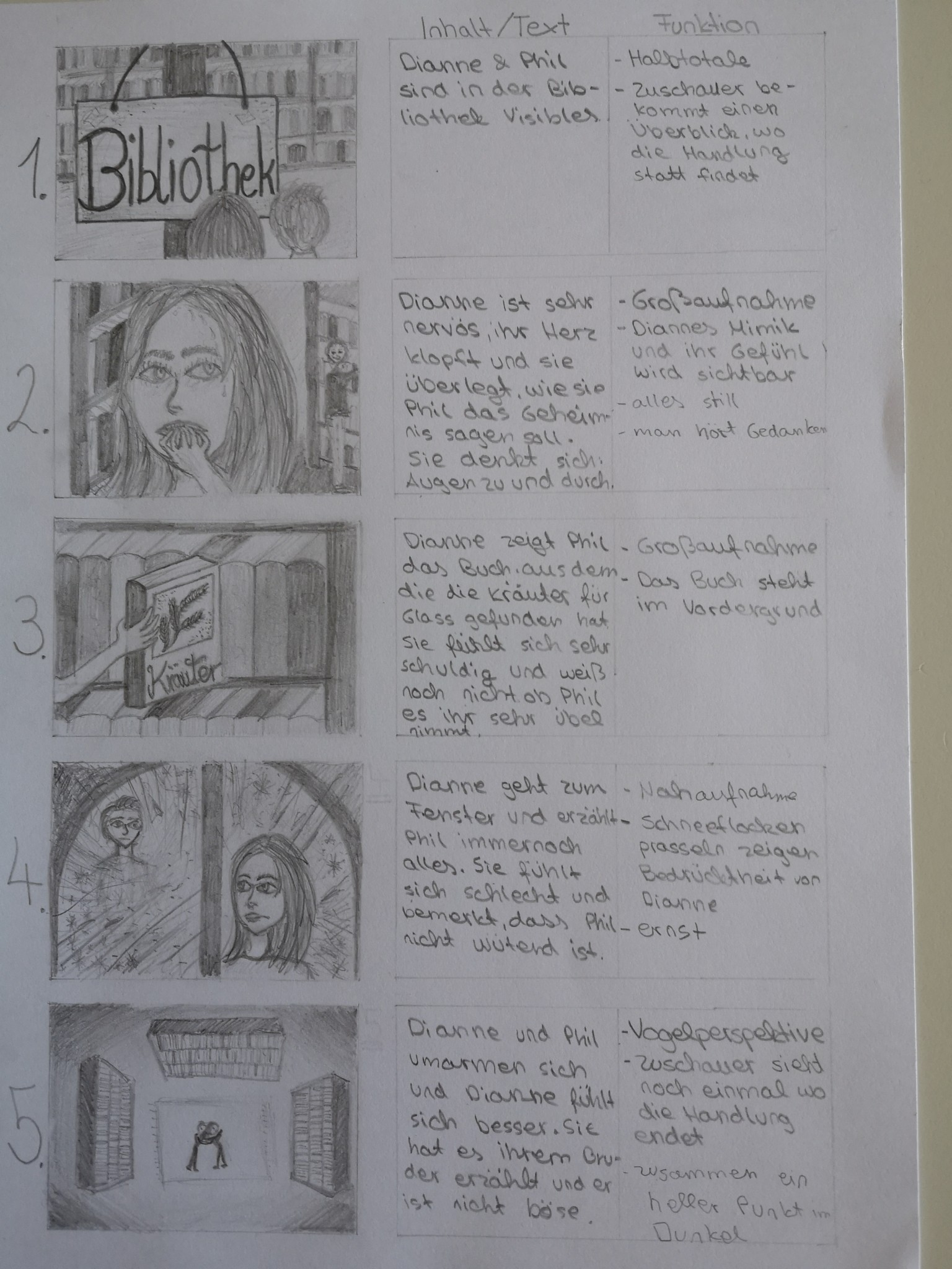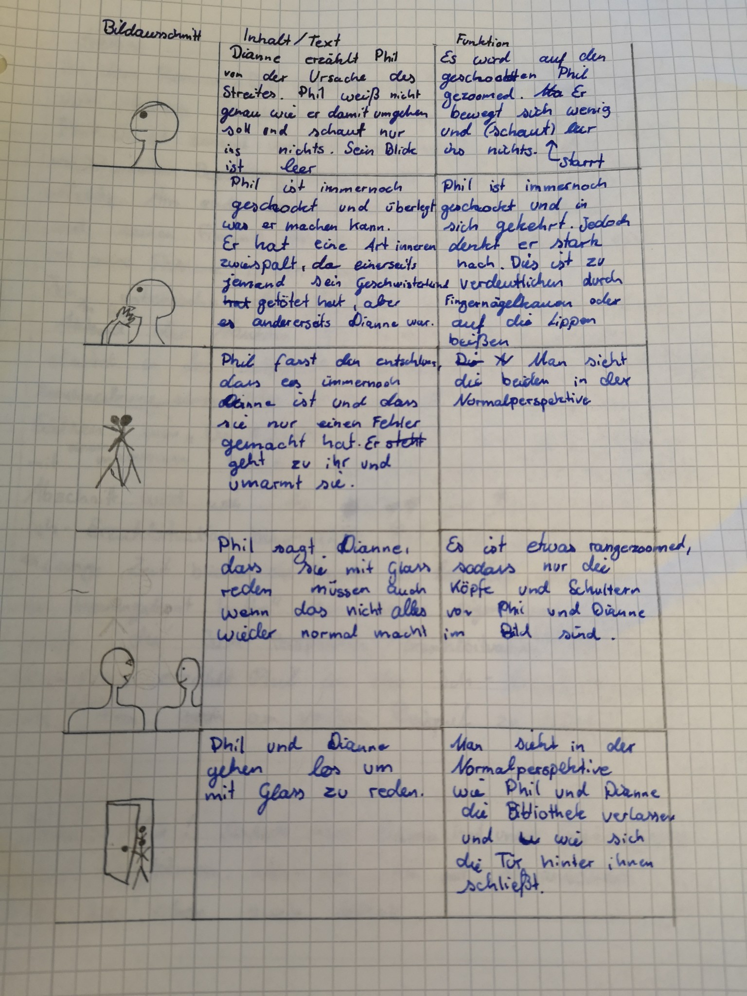 Über die Homeschooling-Zeit des mündlichen Abiturs hat die 9a ein Storyboard zu dieser wichtigen Szene entwickelt. Ein Storyboard ist eine Art bildliche Darstellung dessen, was der Regisseur später im Film sehen möchte. Dabei wird auf Kameraeinstellung, Musik, Regieanweisungen, aber auch den Inhalt (also was sprechen die Figuren) eingegangen.
