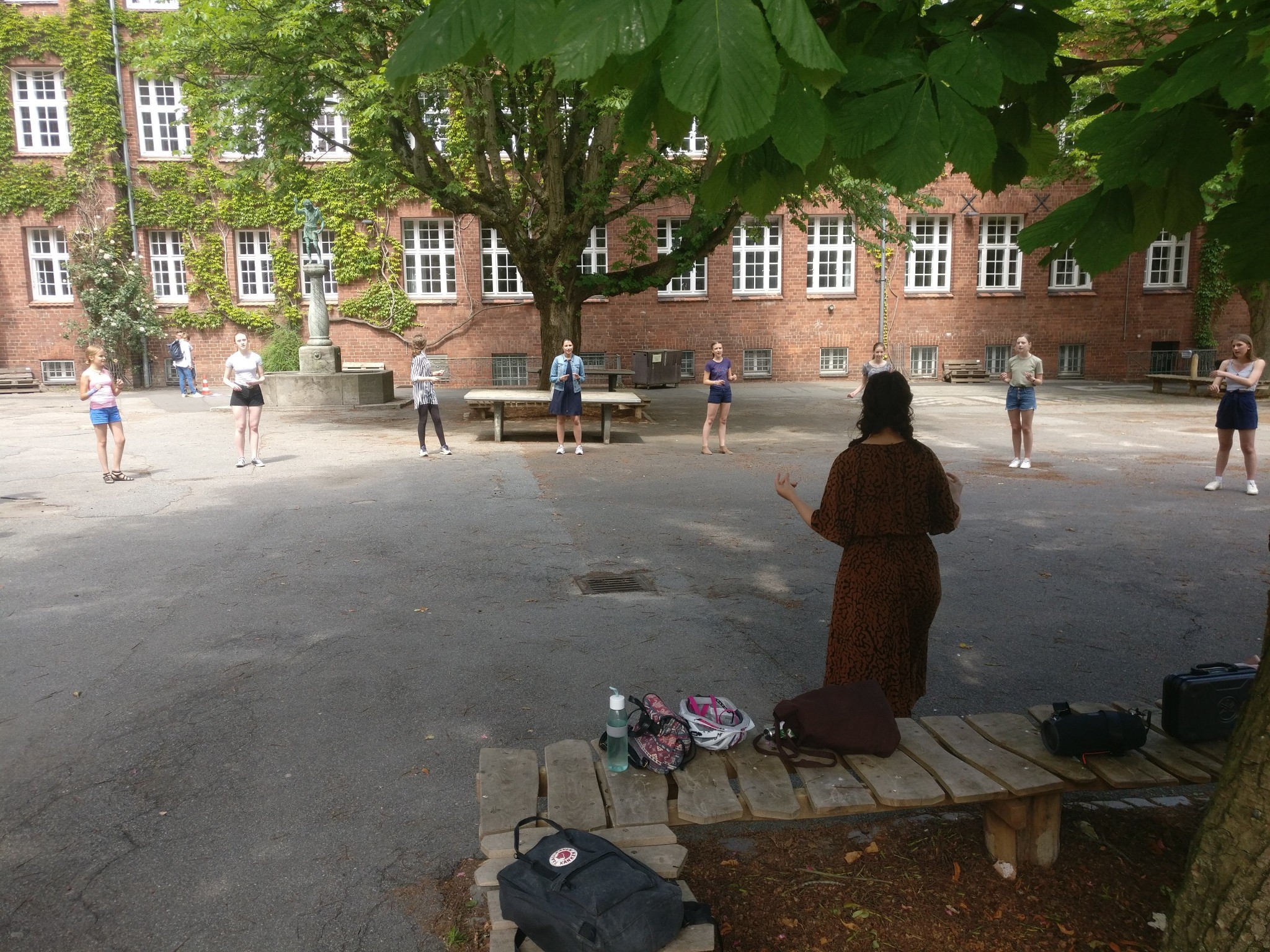 Eine letzte Probe auf dem Schulhof war allen Mittel- und Oberstufenensembles zum Abschluss des Schuljahres einmal möglich und alle hoffen, dass sich das Johanneum im kommenden Schuljahr nach und nach wieder mit Tönen füllt.