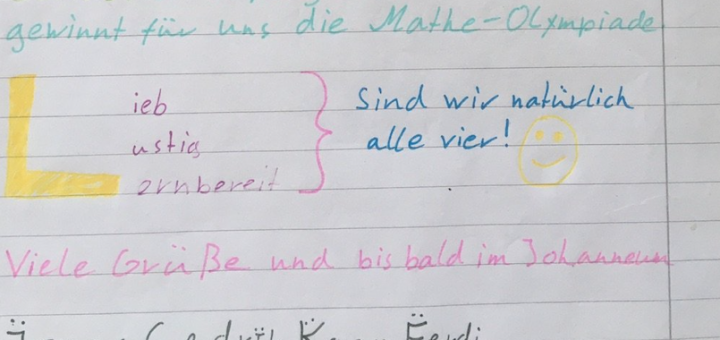 Das Foto zu diesem Beitrag stammt aus einem Brief, den vier Jungs uns im Februar geschickt haben, um zu erklären, warum sich das Johanneum auf sie freuen kann. Wir glauben: Dies gilt für Euch alle 144!