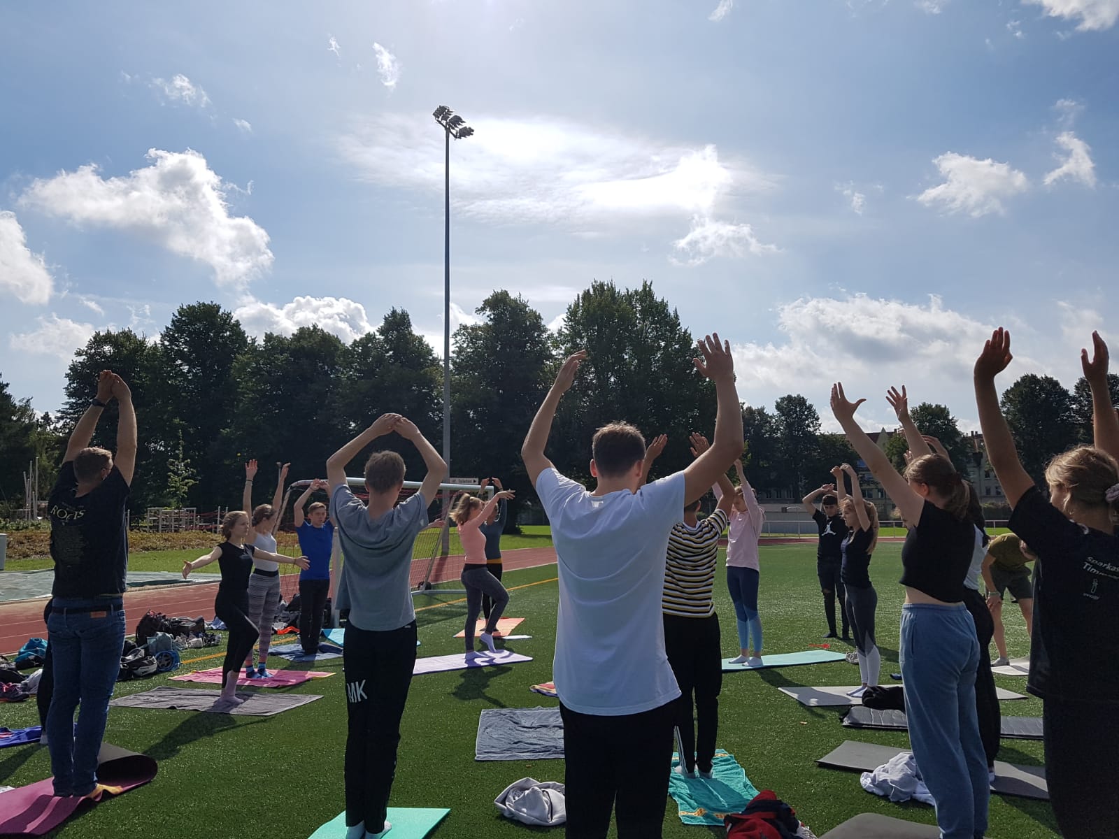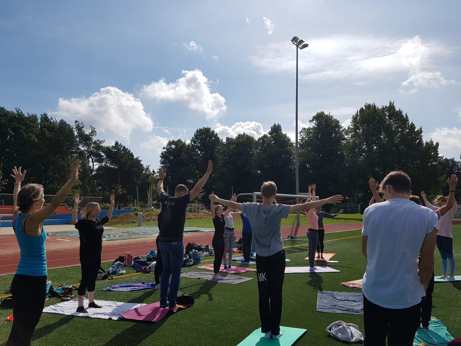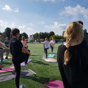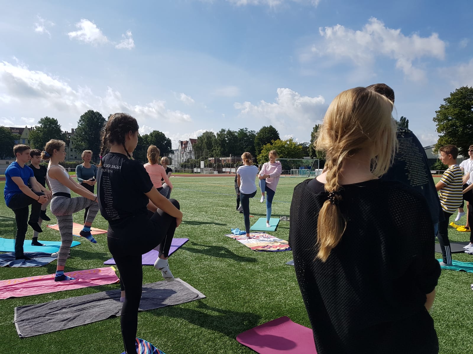 Nach diesem geschichtlichen Exkurs ging es auf den Sportplatz Falkenwiese, wo wir gemeinsam mit Herrn Pfeil und Frau Krimpenfort eine 90-minütige Yogaeinheit absolvierten, was sowohl auf Begeisterung als auch auf misstrauische Blicke traf. Glücklicherweise klarte dann auch der Himmel etwas auf und die Sonne machte sich angenehm bemerkbar. Zum Abschluss dieses gelungenen Wandertages wurde dann noch gemeinsam gegrillt.