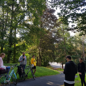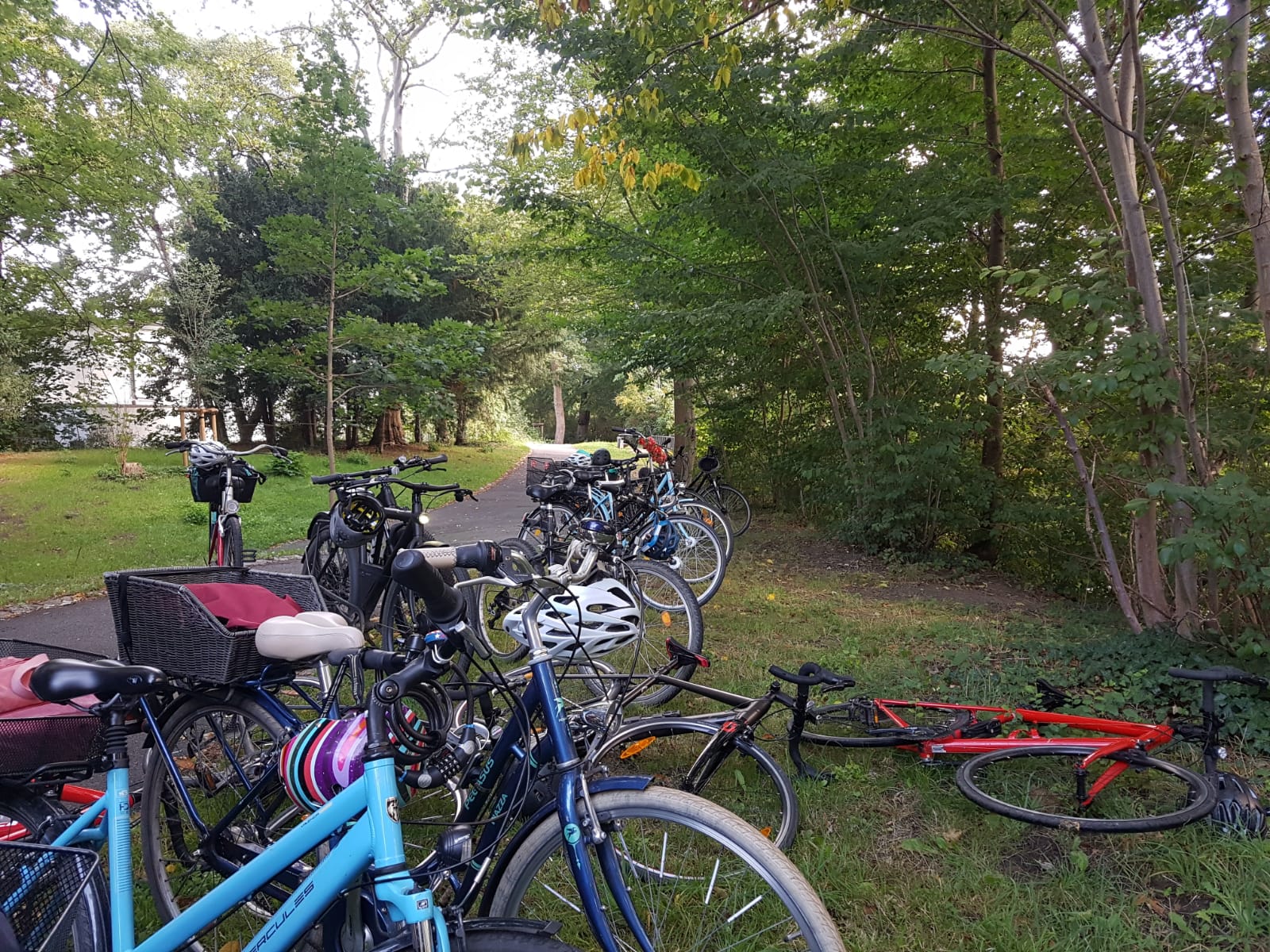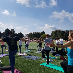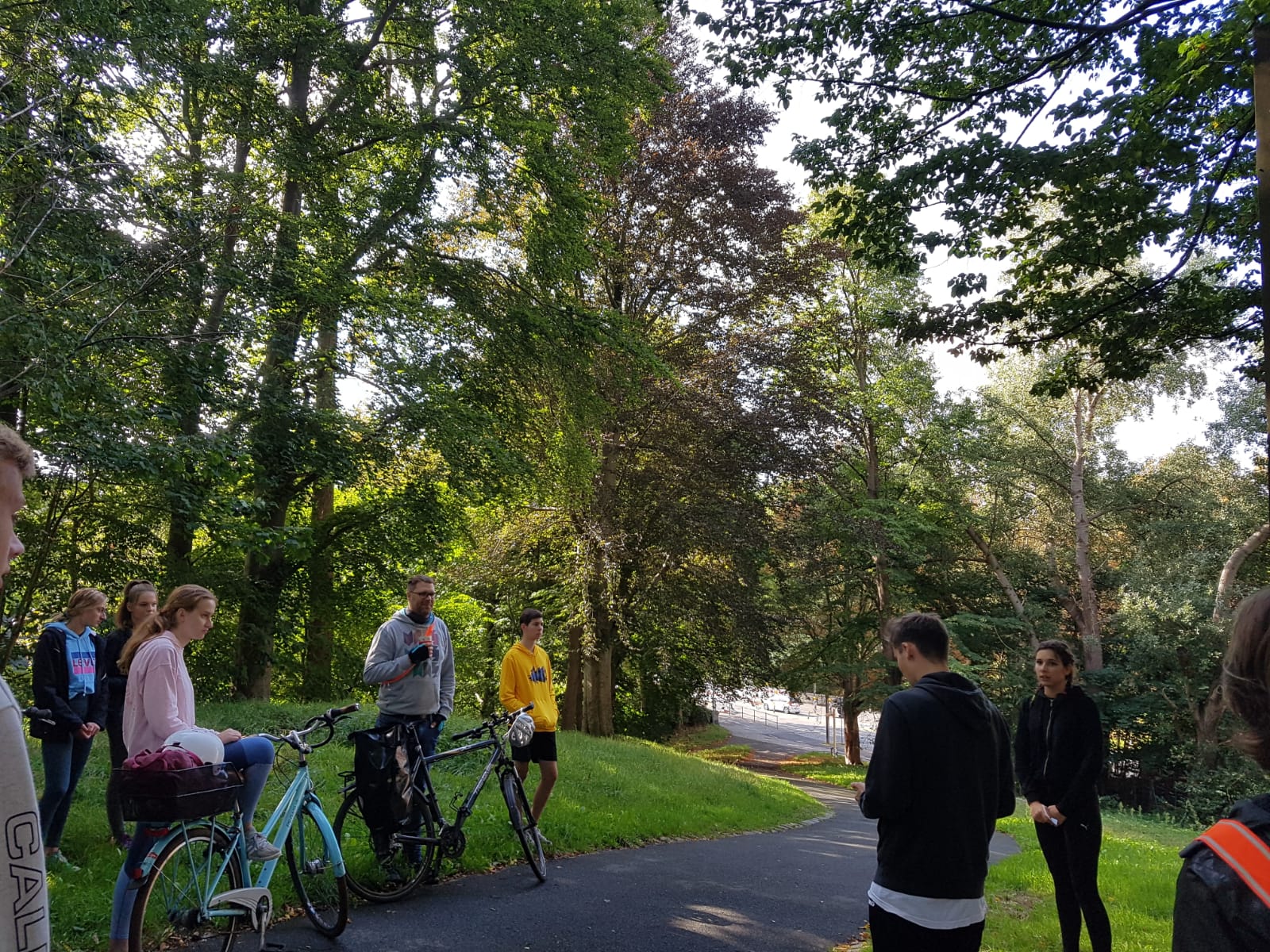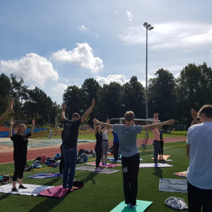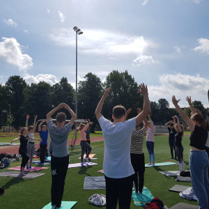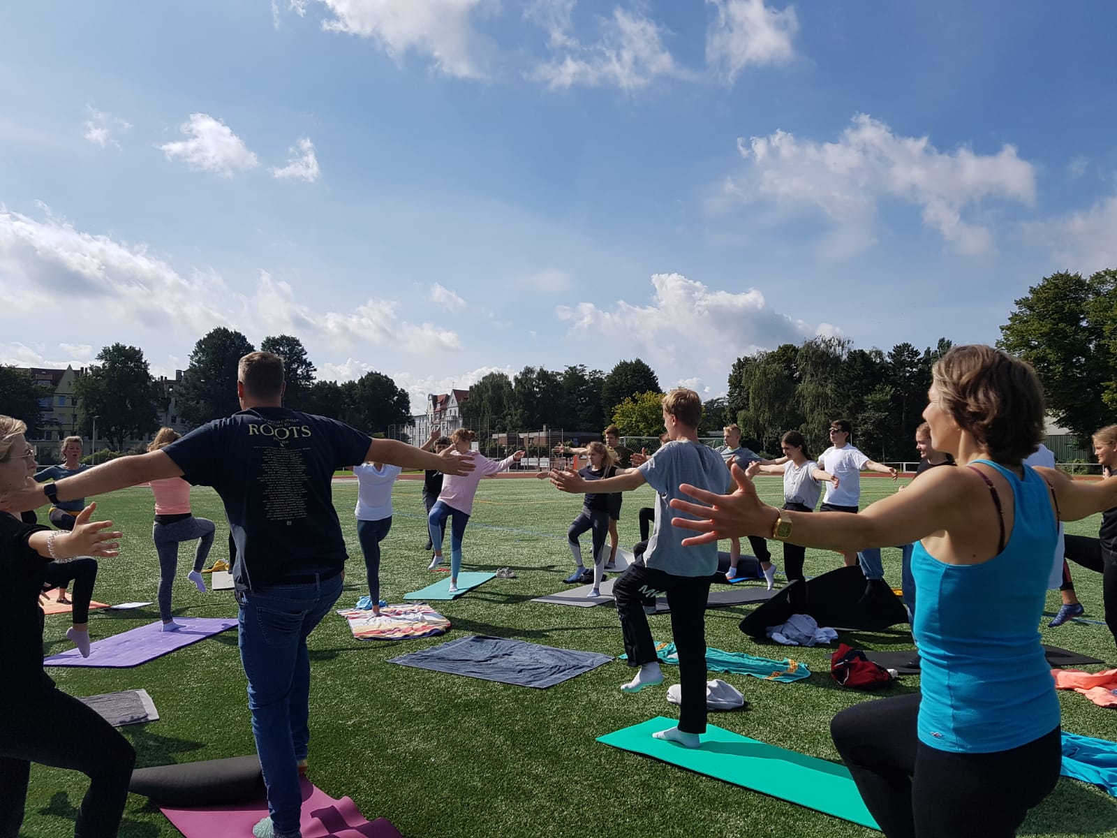 Nach diesem geschichtlichen Exkurs ging es auf den Sportplatz Falkenwiese, wo wir gemeinsam mit Herrn Pfeil und Frau Krimpenfort eine 90-minütige Yogaeinheit absolvierten, was sowohl auf Begeisterung als auch auf misstrauische Blicke traf. Glücklicherweise klarte dann auch der Himmel etwas auf und die Sonne machte sich angenehm bemerkbar. Zum Abschluss dieses gelungenen Wandertages wurde dann noch gemeinsam gegrillt.