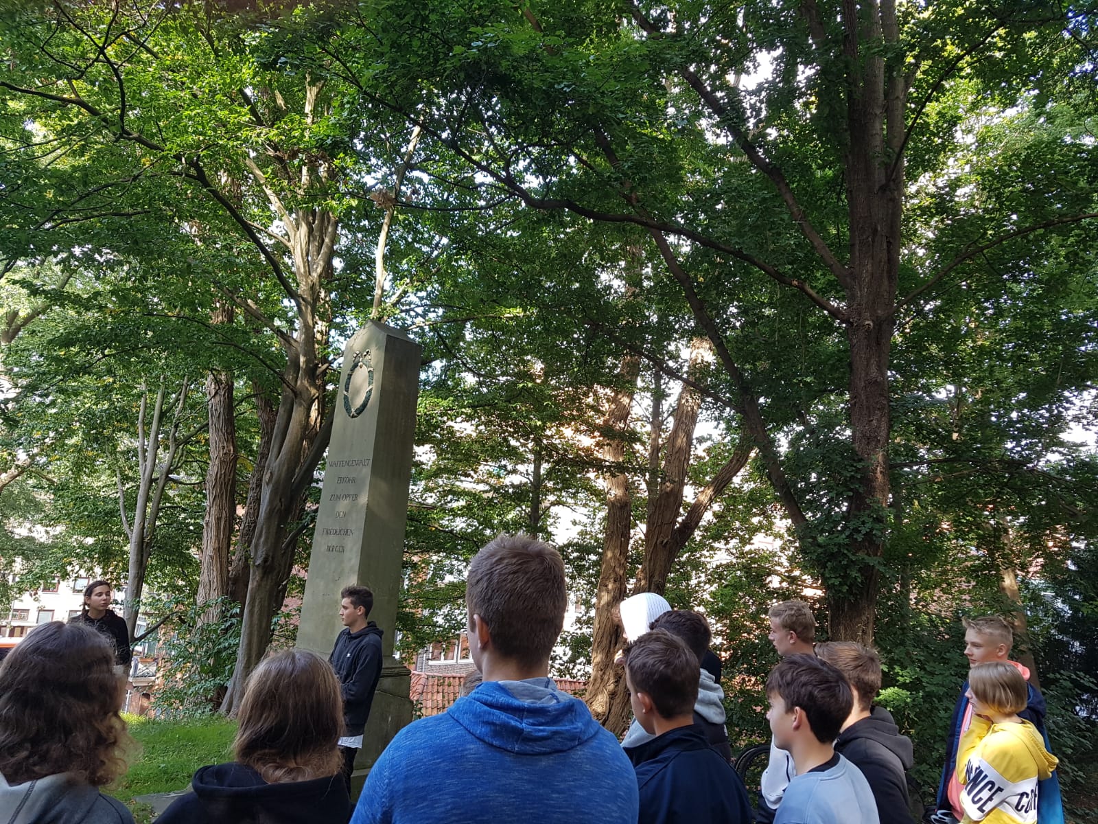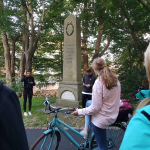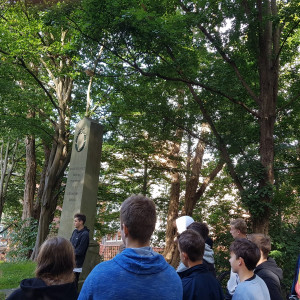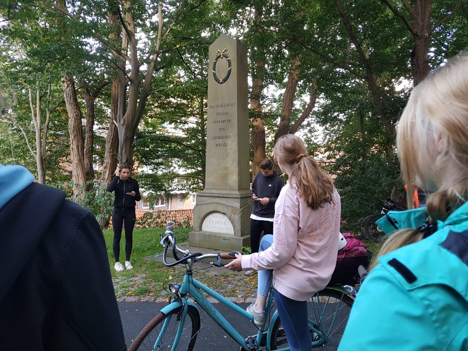 Um solche und viele weitere Denkmäler in Lübeck etwas besser kennenzulernen, machten wir es uns als Geschichtsprofil zur Aufgabe, jeweils zu zweit eines der Denkmäler, die uns von unserem Kurslehrer Herrn Pfeil zusammengestellt wurden, dem Rest des Kurses vorzustellen. Los ging es etwas verspätet um 9 Uhr morgens, natürlich umweltfreundlich mit dem Fahrrad. Nach Besuchen an der bereits besagten Gedenktafel in der Königsstraße und am Lübecker Ehrenfriedhof ging es weiter an den Lindenplatz in der Nähe des Hauptbahnhofs. An diesem zentralen Punkt nahe der Innenstadt steht die aus Bronze gefertigte Statue des ehemaligen deutschen Reichskanzlers Otto von Bismarck, welcher seinen visionären Blick direkt auf das gegenüberliegende Denkmal an Kaiser Wilhelm I. gerichtet hat. Nach diesem weiteren Zwischenstopp kamen wir leider zu der Erkenntnis, dass nicht mehr alle Denkmäler zu schaffen waren. Als letzten geschichtlichen Zwischenstopp blieb nun noch das Denkmal des Lübecker Knochenhauers Prahl. Ja, ganz richtig. Ein Denkmal an einen Lübecker Knochenhauer aus dem frühen 19. Jahrhundert. Prahl wurde damals von einem französischen Erschießungskommando hingerichtet, nachdem er sich gegen die französischen Streitkräfte, die damals tatsächlich unter dem berühmten Staatsoberhaupt Napoleon Bonaparte bis nach Lübeck vorgerückt waren und die Stadt ganze sieben Jahre besetzt hatten, aufgelehnt hatte.