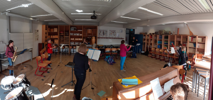 Seit mehreren Wochen darf die Junior-Band wieder proben. Da sie in zwei Gruppen geteilt wurde (die fünften und die sechsten Klassen), sind unsere Probenensembles klein, weil die meisten Siebtklässler:innen in die Concert-Band aufgestiegen sind. Bei uns spielen zwei Querflöten, zwei Klarinetten, eine Trompete, ein Saxophon, eine Gitarre und ich mit Fagott. Sehr interessante Mischung.