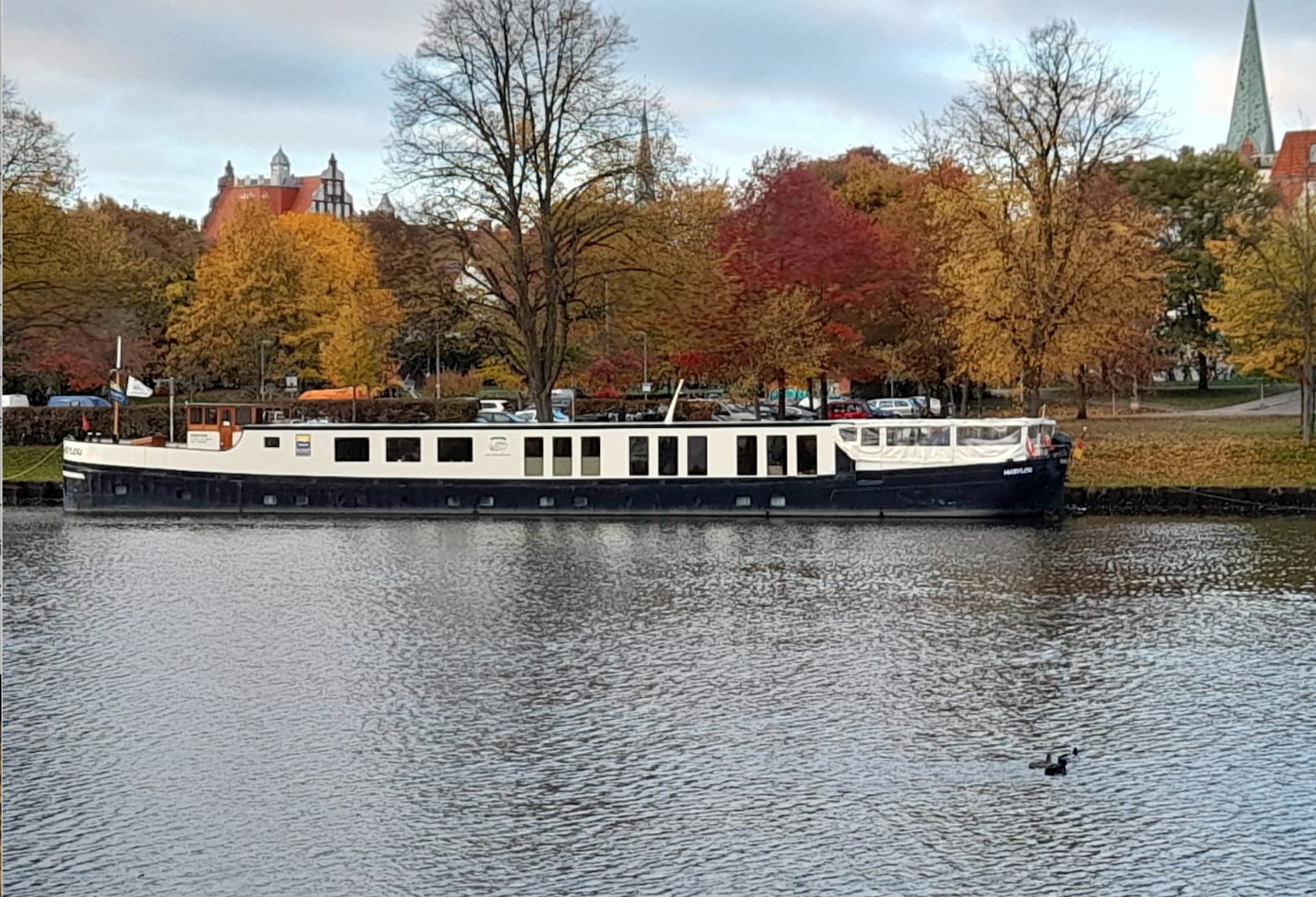 Alle gingen aufgeregt durch den Park ans Wasser. Der Anblick von den vielen bunten Blättern im Sonnenaufgang war sehr schön. Im Wasser spiegelte sich die Sonne und der Weg sah aus, als ob für uns Blumen (na ja Blätter) gestreut worden wären.