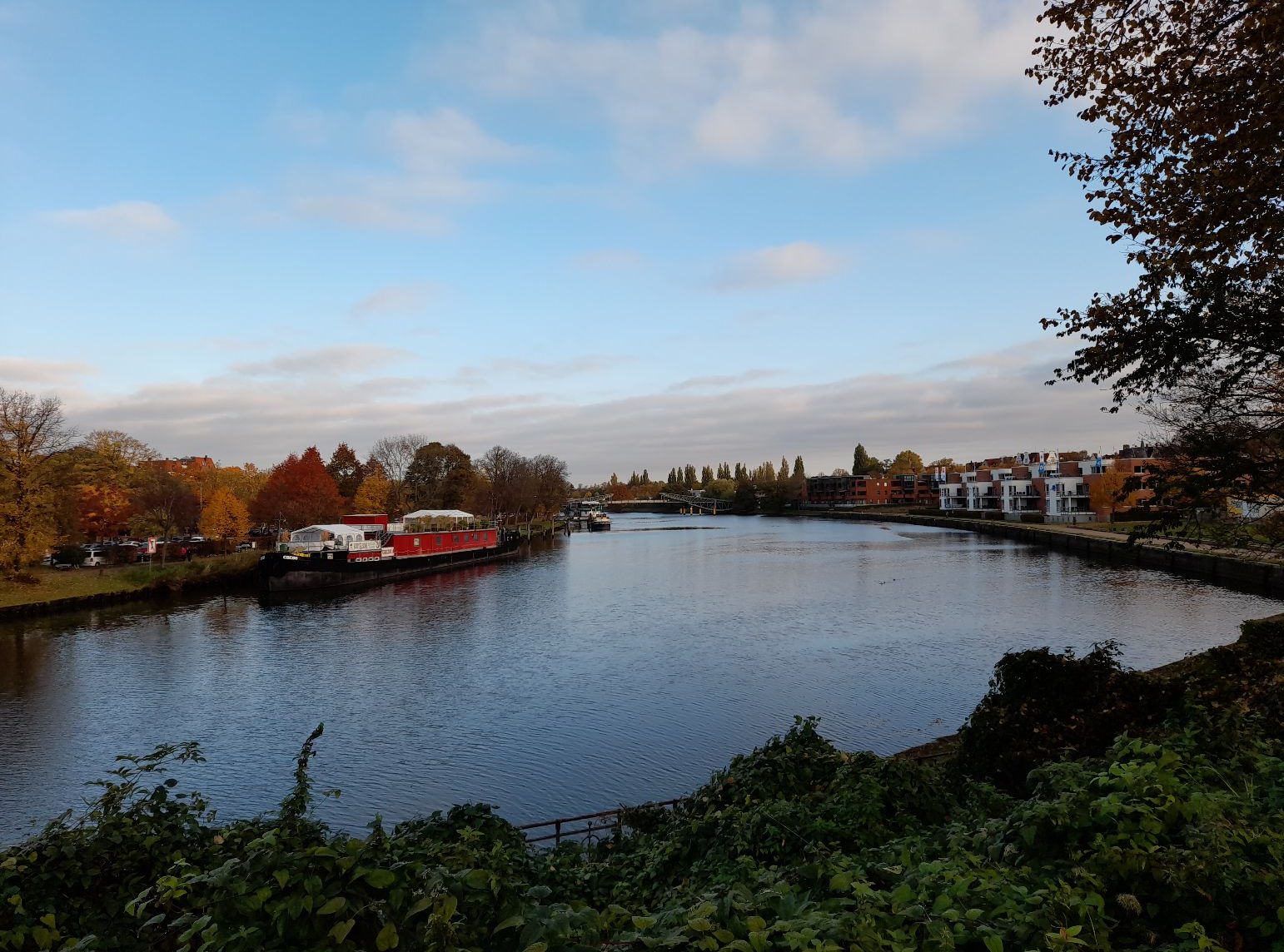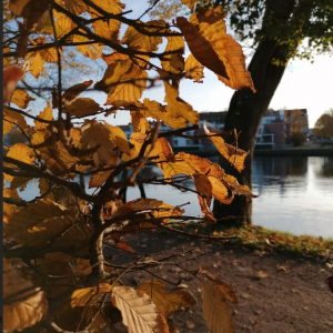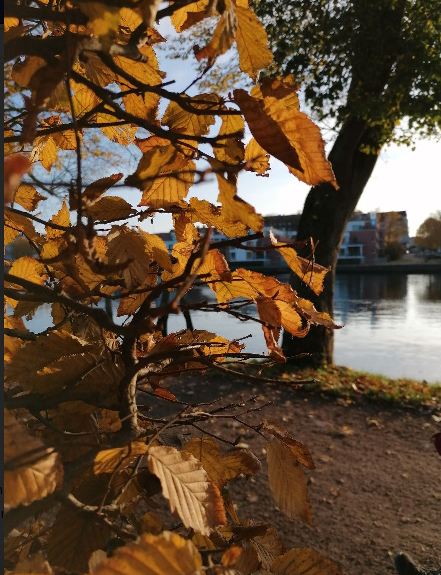 Wir haben heute einen Herbstspaziergang gemacht. Als wir runter zum Kanal gegangen sind, ist mir aufgefallen, dass die Bäume in ziemlich vielen bunten Farben leuchten können. Manche Bäume haben schon ihre Blätter und Früchte verloren, einige sind schon fast kahl. Weil so viele Blätter auf dem Boden lagen, musste ich aufpassen, dass ich nicht ausrutsche. Da die Sonne gerade aufgegangen war, stand sie noch sehr tief und warf ein schönes Licht auf das Wasser. Die beim Spaziergang aufgesagten Gedichte haben so schön nach Herbst geklungen.