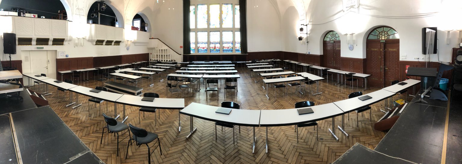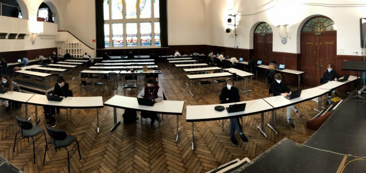 Zuhause und in den Webkonferenzen haben die 25 Musik-Profiler:innen sich in den letzten Wochen mit den ersten Formen der Mehrstimmigkeit und eben auch mit einer Notationssoftware vertraut gemacht. Nun war es soweit: Die erworbenen Kenntnisse waren in der Klausur in durchaus ungewohntem Szenario gefragt. 25 Computerarbeitsplätze in der Jugendstilaula, Musikklausur auf dem USB-Stick – das muss kein Widerspruch sein. Auch das ist das Johanneum!