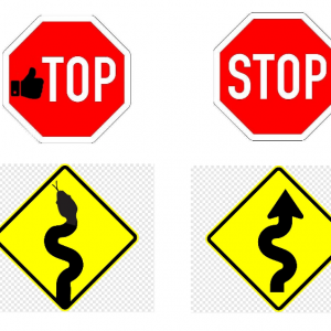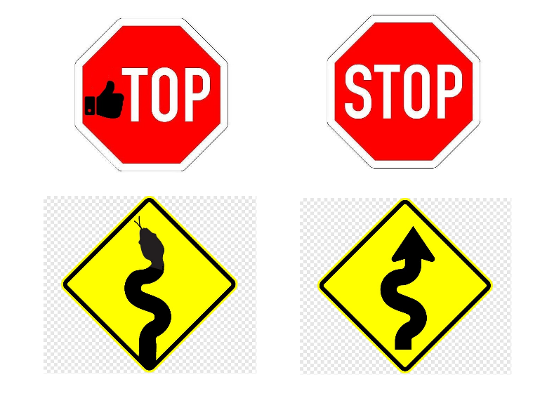 Aus einem „Einfahrt verboten“-Schild wurde ein Burger oder eine Zigarette. Auf einem „Stop“-Schild steht auf einmal „Top“, aus einer Einbahnstraße wird Einschlafstraße und Straßenmännchen fahren Skateboard. Auf einem anderen Schild steht statt „Stop“ „Stop Racism“.