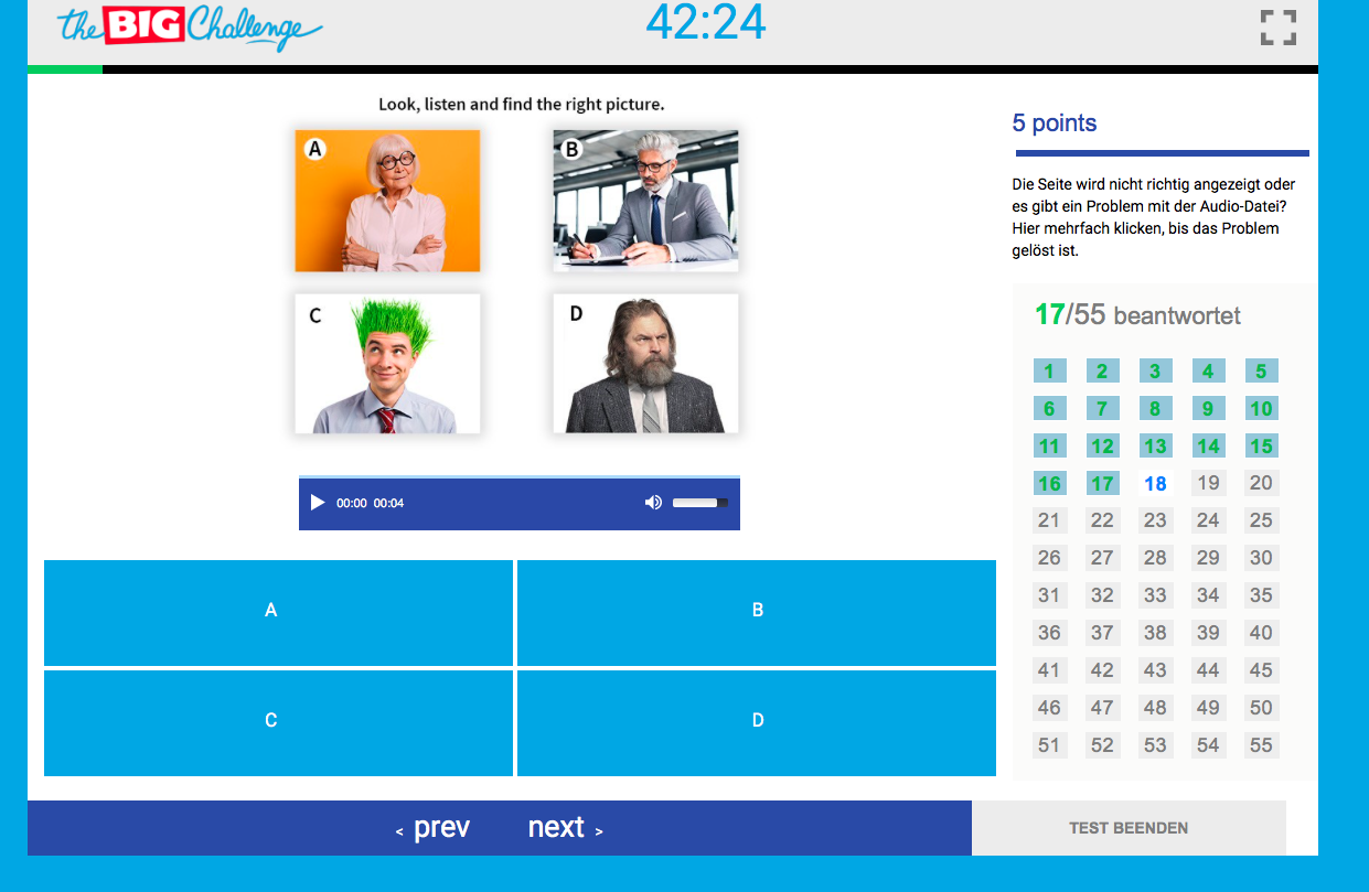 Beim Wechsel zwischen Wortschatz, Phonetik, Grammtik und Landeskunde bleibt da kaum Zeit zum Überlegen. Aber Jari aus der 5d berichtet: “Ich finde,dass die BigChallenge eine angemessene Länge hatte. Mit den Aufgaben bin ich ich ziemlich gut zurechtgekommen. Es hat auch Spaß gemacht, die Fragen zu beantworten.“