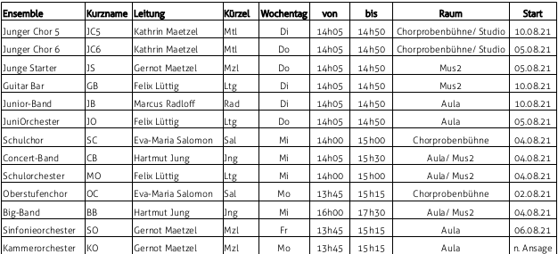 Mit dem neuen Schuljahr hat auch die musikalische Arbeit in den zahlreichen Ensembles begonnen. Neue Mitglieder in Chören, Bands, Orchestern sind herzlich willkommen. Bei Interesse sprecht jederzeit Eure Musiklehrer:innen oder die jeweilige Ensembleleitung an. Oder kommt einfach zum Probentermin zum Reinschnuppern.