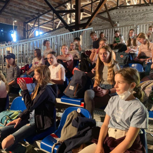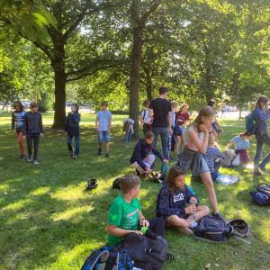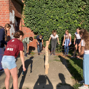 Dort haben wir viele Spiele gespielt, wie Fußball, Frisbee werfen und „Tower of Power“. Bei dem Spiel mussten Zwölf aus der Klasse zwei nebeneinanderliegende Bänder nehmen und zusammen mit den anderen versuchen, sieben Holzklötze zu einem Turm zu stapeln. Dabei musste darauf geachtet werden, dass der Turm nicht umfiel oder die Holzklötze mit den Händen berührt wurden. Dies funktionierte, indem wir einen Anker in einen Spalt führten, der sich in jedem Holzklotz befand. Dann musste der Holzklotz vorsichtig angehoben und auf einen anderen Klotz gestapelt werden. Und tatsächlich haben wir es geschafft, dass alle sieben Holzklötze zu einem Turm gestapelt wurden!