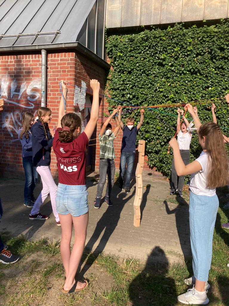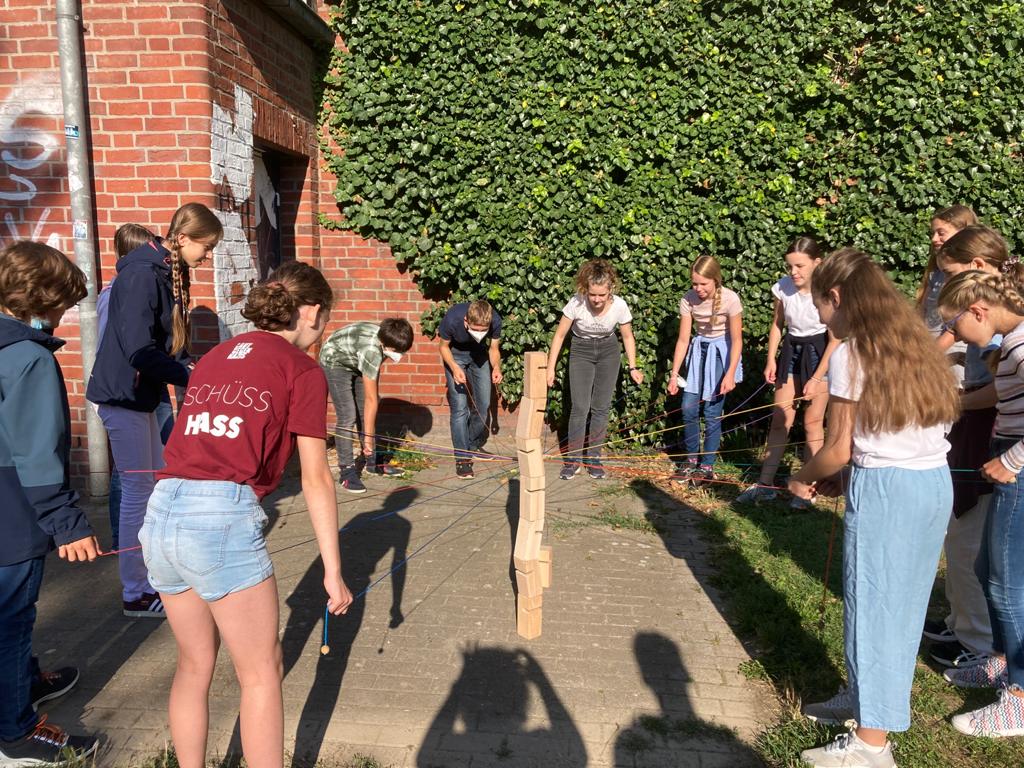 Dort haben wir viele Spiele gespielt, wie Fußball, Frisbee werfen und „Tower of Power“. Bei dem Spiel mussten Zwölf aus der Klasse zwei nebeneinanderliegende Bänder nehmen und zusammen mit den anderen versuchen, sieben Holzklötze zu einem Turm zu stapeln. Dabei musste darauf geachtet werden, dass der Turm nicht umfiel oder die Holzklötze mit den Händen berührt wurden. Dies funktionierte, indem wir einen Anker in einen Spalt führten, der sich in jedem Holzklotz befand. Dann musste der Holzklotz vorsichtig angehoben und auf einen anderen Klotz gestapelt werden. Und tatsächlich haben wir es geschafft, dass alle sieben Holzklötze zu einem Turm gestapelt wurden!