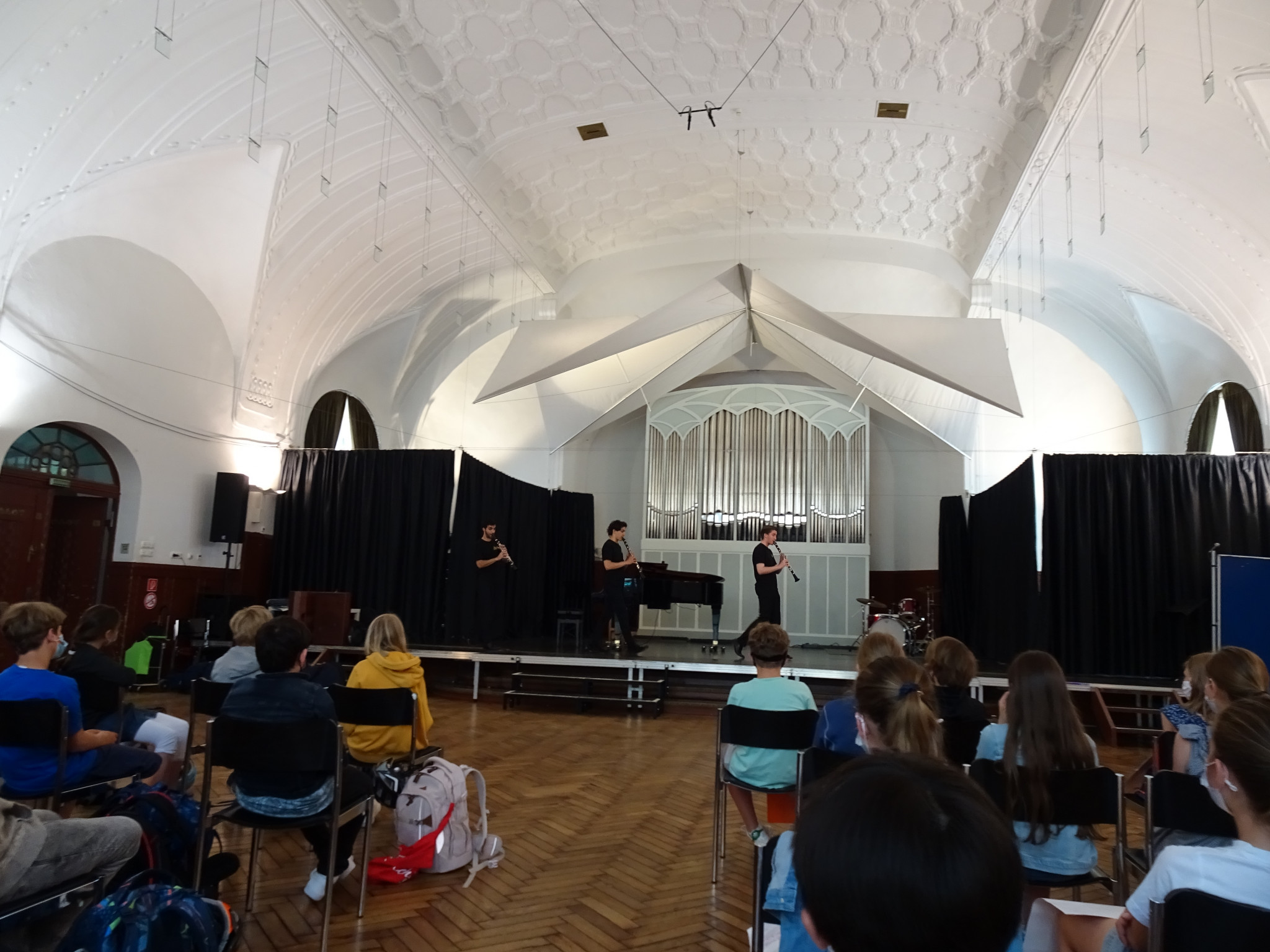 Ilya Ruf spielte neben der Klarinette auch das Klavier, sein Bruder Ivo und ihr Freund Nikolai Gast beide die Klarinette. Besonders gefreut haben wir uns, dass Ilya auf dem Klavier auch Mozarts bekanntes Stück „Rondo alla Turca“ spielte! Das war toll! Bei manchen stücken begleitete Christian die Klarinette auch auf dem Klavier. Er konnte seine Finger so schnell bewegen, das war echt unglaublich! Am Ende waren alle so begeistert, dass „Zugabe“ gerufen wurde. Es war echt sehr spannend und hat superviel Spaß gemacht