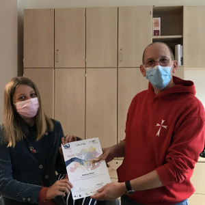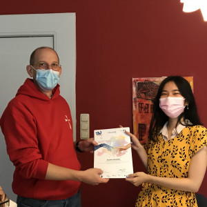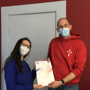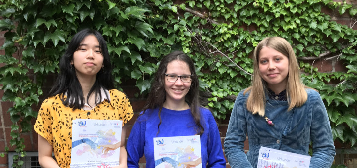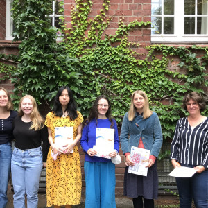 Drei weitere Schülerinnen des Johanneums haben mit sehr unterschiedlichen, aber alle auf ihre eigene Weise umwerfenden Arbeiten Preise auf Landesebene (also aus ganz Schleswig-Holstein) errungen. Leider konnte die Preisübergabe nicht wie in den anderen Jahren in großem Rahmen mit allen anderen Gewinner:innen stattfinden, sondern nur in kleinem Kreis mit Herrn Dr. Janneck und Frau Wagner in unserer Schule. Aber trotzdem herrschte im Schulleiterbüro eine feierliche Stimmung, als die Urkunden und Buchgutscheine einzeln übergeben wurden. Und die Fotos mit unserem Schulleiter Herrn Janneck und den Gewinnerinnen sehen ja auch sehr professionell aus!