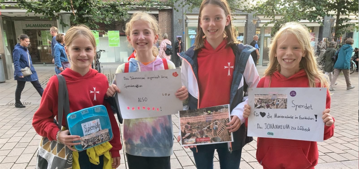 So haben zum Beispiel Tammo (5b) und Matilda (8d) kurzentschlossen mit Horn und Saxophon am Koberg musiziert. Schnell füllte sich bei diesem öffentlichen Konzert der Spendentopf!