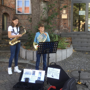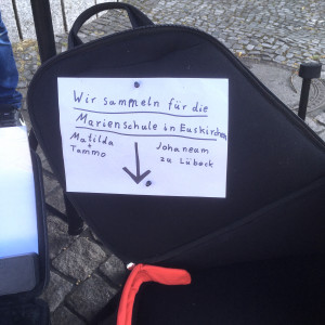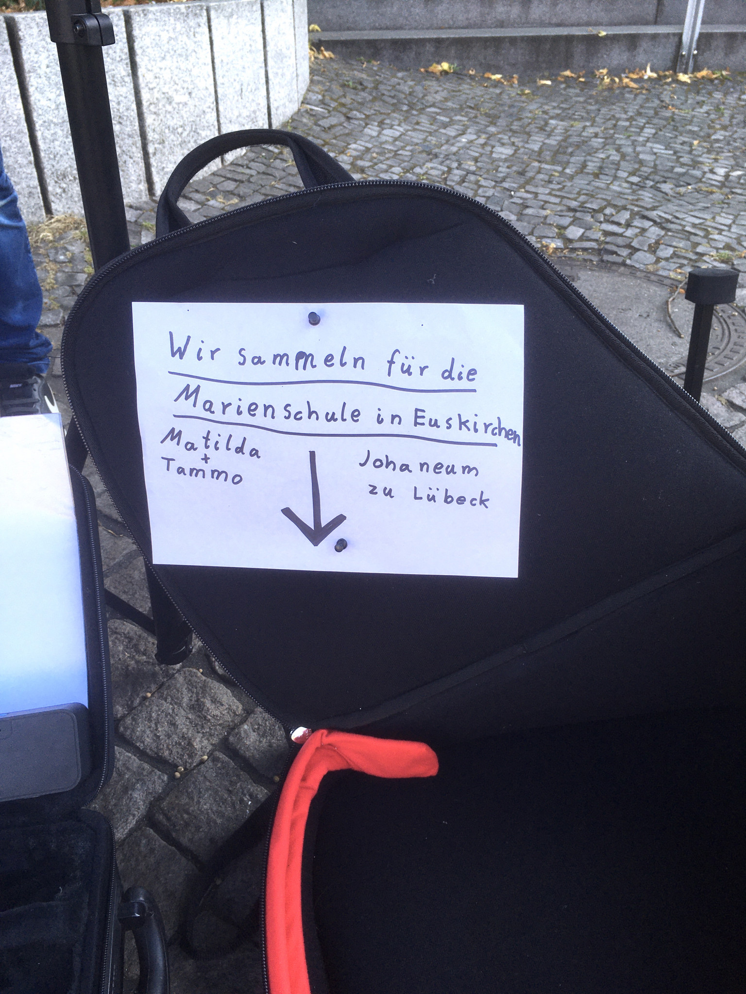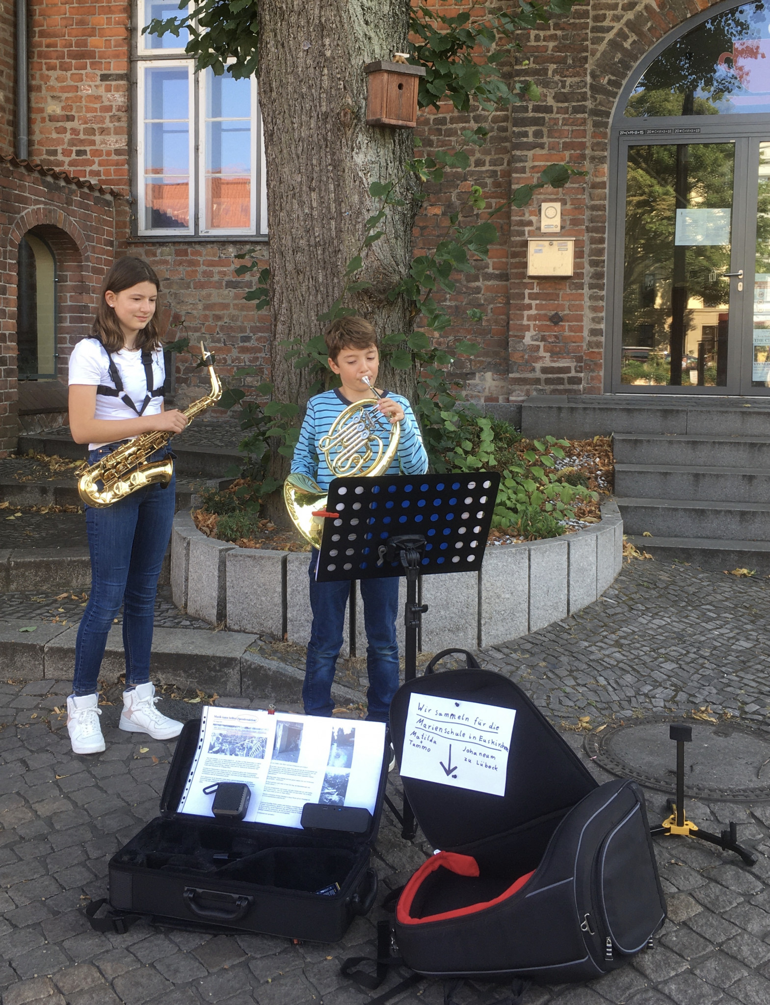 So haben zum Beispiel Tammo (5b) und Matilda (8d) kurzentschlossen mit Horn und Saxophon am Koberg musiziert. Schnell füllte sich bei diesem öffentlichen Konzert der Spendentopf!