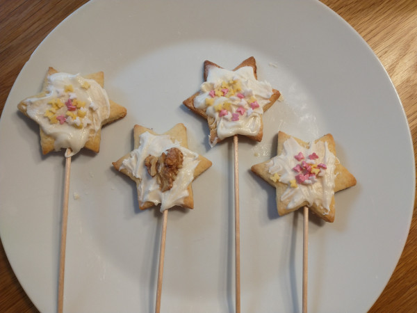 Zunächst gibst du einen Teelöffel Backpulver mit 200g Mehl, 75g Butter, dem Ei und der Zuckermischung in eine große Schüssel. Nun verknete alles mit gewaschenen Händen. Der Teig sollte dann für eine Stunde im Kühlschrank ruhen. Dann etwas Mehl auf die Arbeitsplatte schütten und den Teig darauf ausrollen. Zunächst wird der Teig in Sternen ausgestochen und anschließend auf das Backpapier auf dem Backblech ausgelegt. Nun kommt alles für etwa 8-10 Minuten in den vorgeheizten Backofen bei 220 Grad. Anschließend hole das Backblech heraus, stecke die Schaschlikspieße in die Kekse und lasse sie abkühlen. Im Anschluss kannst du sie mit Zitronenglasur und Zuckerperlen verzieren.