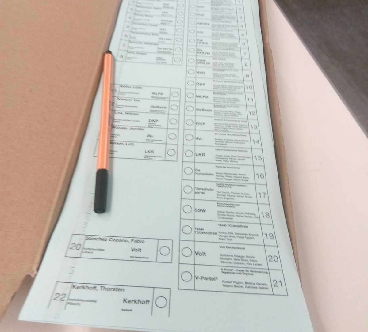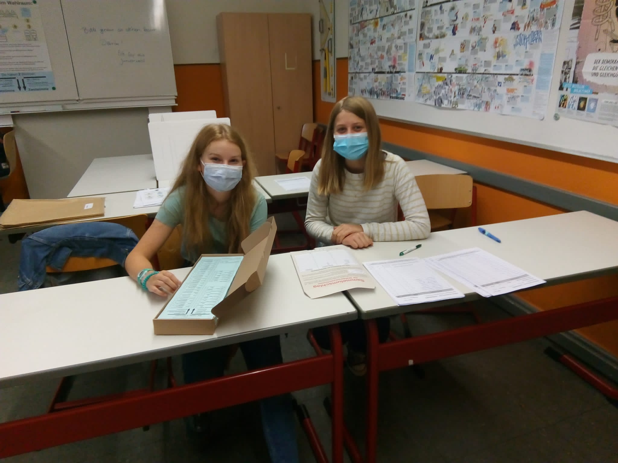 Wir, der WPK-WiPo-Kurs von Frau Stehr, durften dabei die Organisation übernehmen. In Teams von 3-4 Leuten übernahmen wir die Aufsicht über das Wahllokal in Raum H205. Vorher hatte jeder Schüler und jede Schülerin eine Wahlbescheinigung erhalten, die zusammen mit einem Ausweis vorgezeigt werden musste.