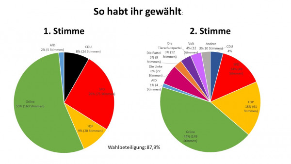 Die Grünen sind klarer Sieger – keine Frage! In unserer Abstimmung haben sich mit deutlicher Mehrheit unsere Schüler:innen für die Grünen ausgesprochen, die im Gegensatz zu unserer Wahl im Bundestag nur die drittmeisten Abgeordneten stellt. Mit gleich zwei Siegen auf Regional- und Bundesebene konnten die Grünen sich ganz klar behaupten.