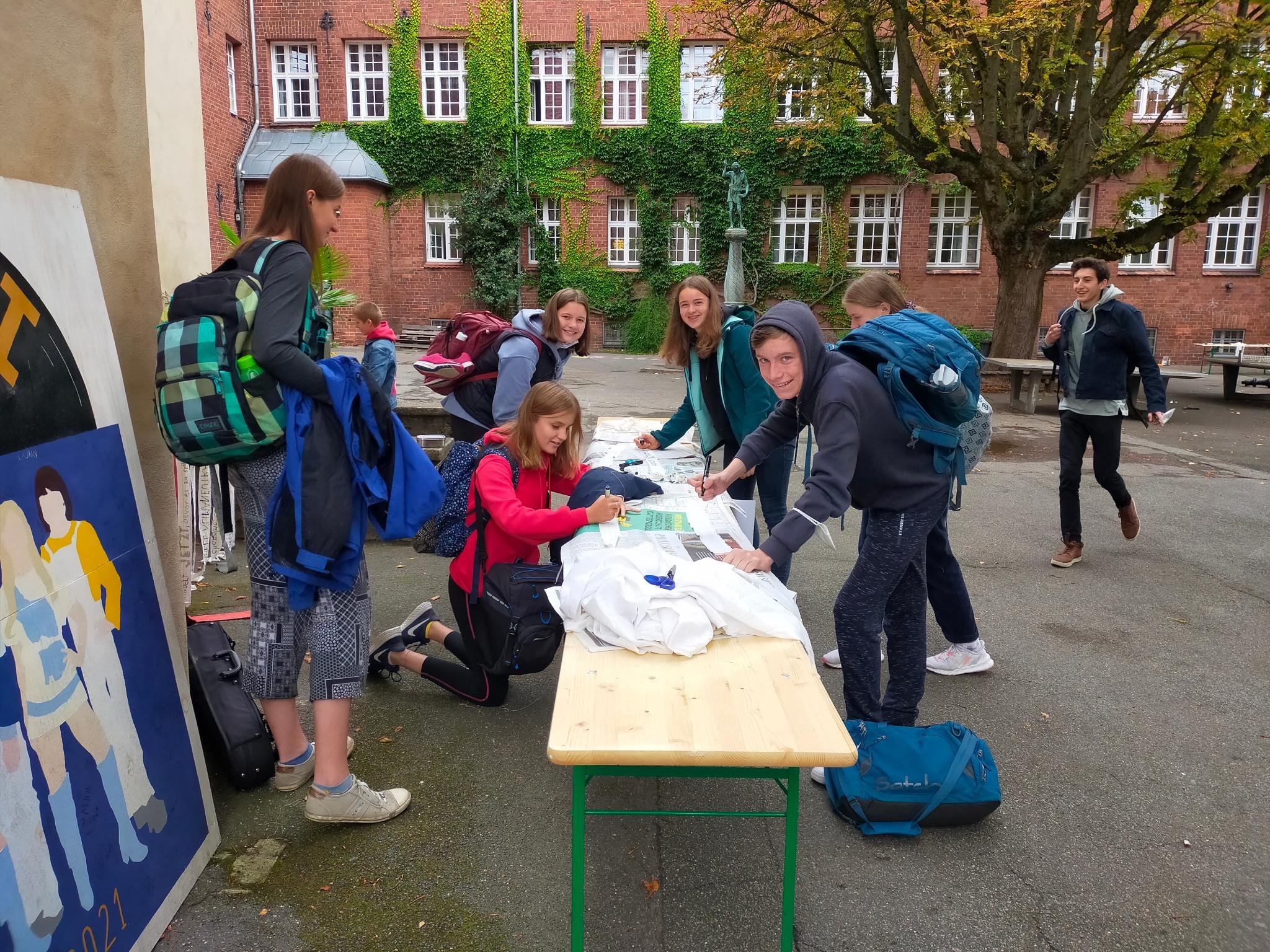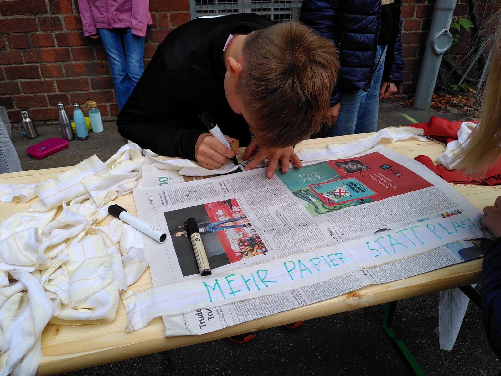 Das Schreiben der sogenannten Klimabänder fand am Freitag in den großen Pausen im Zusammenhang mit dem globalen Klimastreik statt und wurde vom Greenteam organisiert. Obwohl diese Aktion relativ spontan war, haben viele von euch mitgemacht und ihre Meinung kreativ ausgedrückt. Dadurch entstanden viele gelungene Klimabänder, die jetzt unseren Schulhof schmücken und auf das Thema aufmerksam machen. Es lohnt sich, sie zu lesen und Ideen mitzunehmen!
